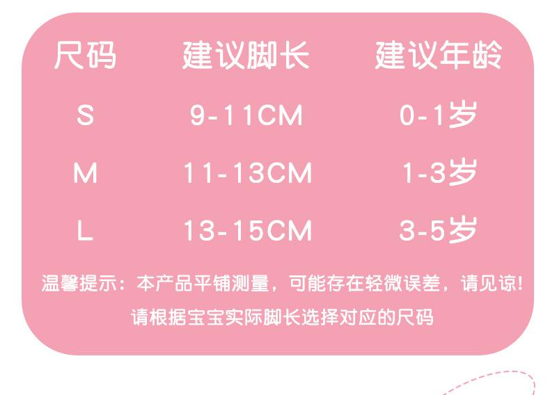 S# foot length 9-11cm0-12 months, M size foot length 11-13cm 1-3 years old, L size foot length 13-15cm 3-5 years old