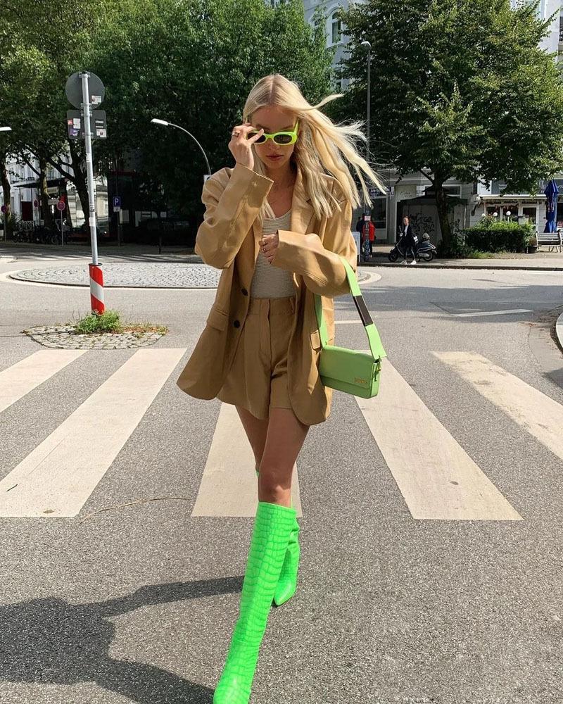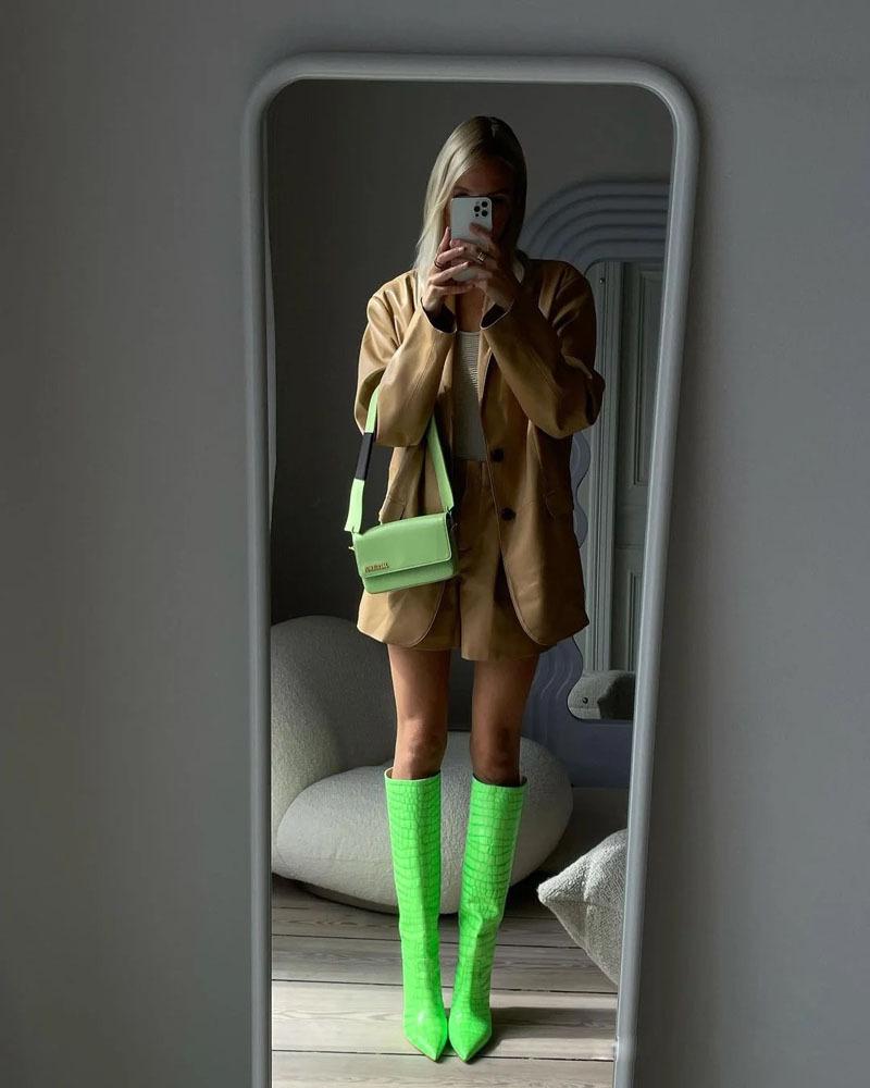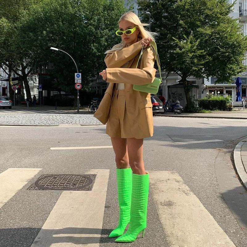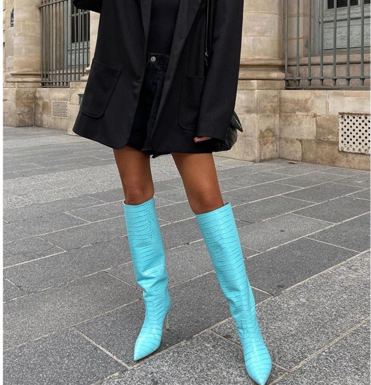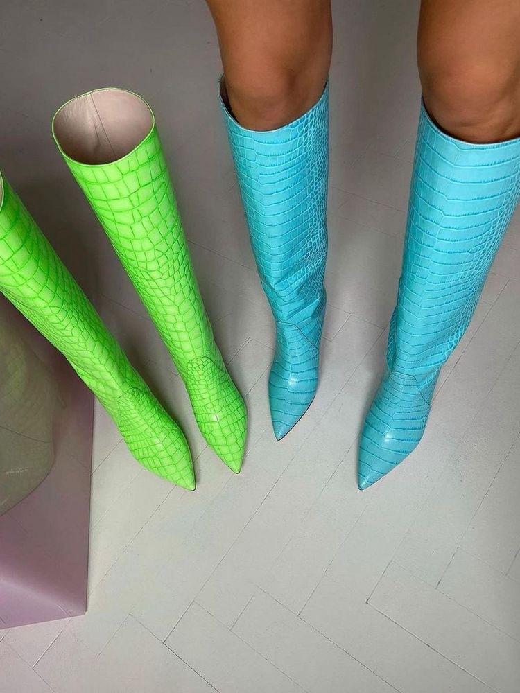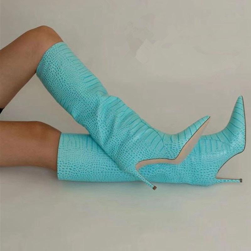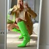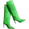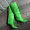 2024 otoño e invierno nuevo comercio exterior puntiagudo tacón fino tacón super alto patrón de serpiente pasarela talla grande verde fluorescente botas hasta la rodilla botas de mujer