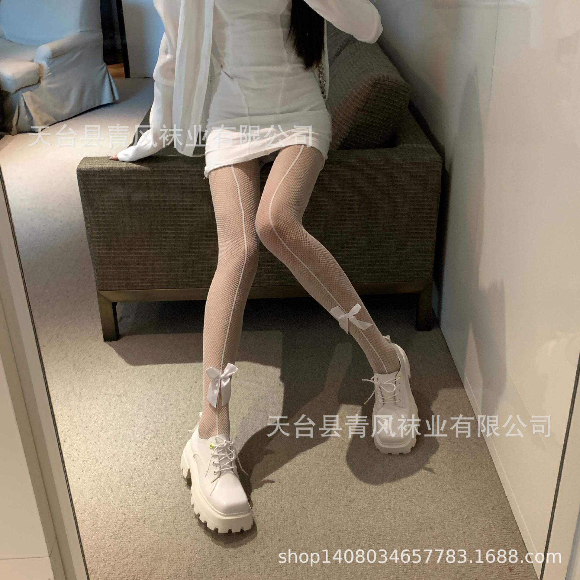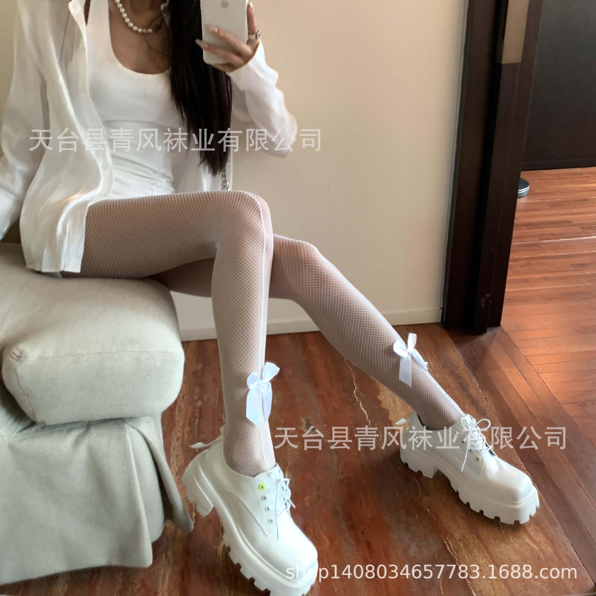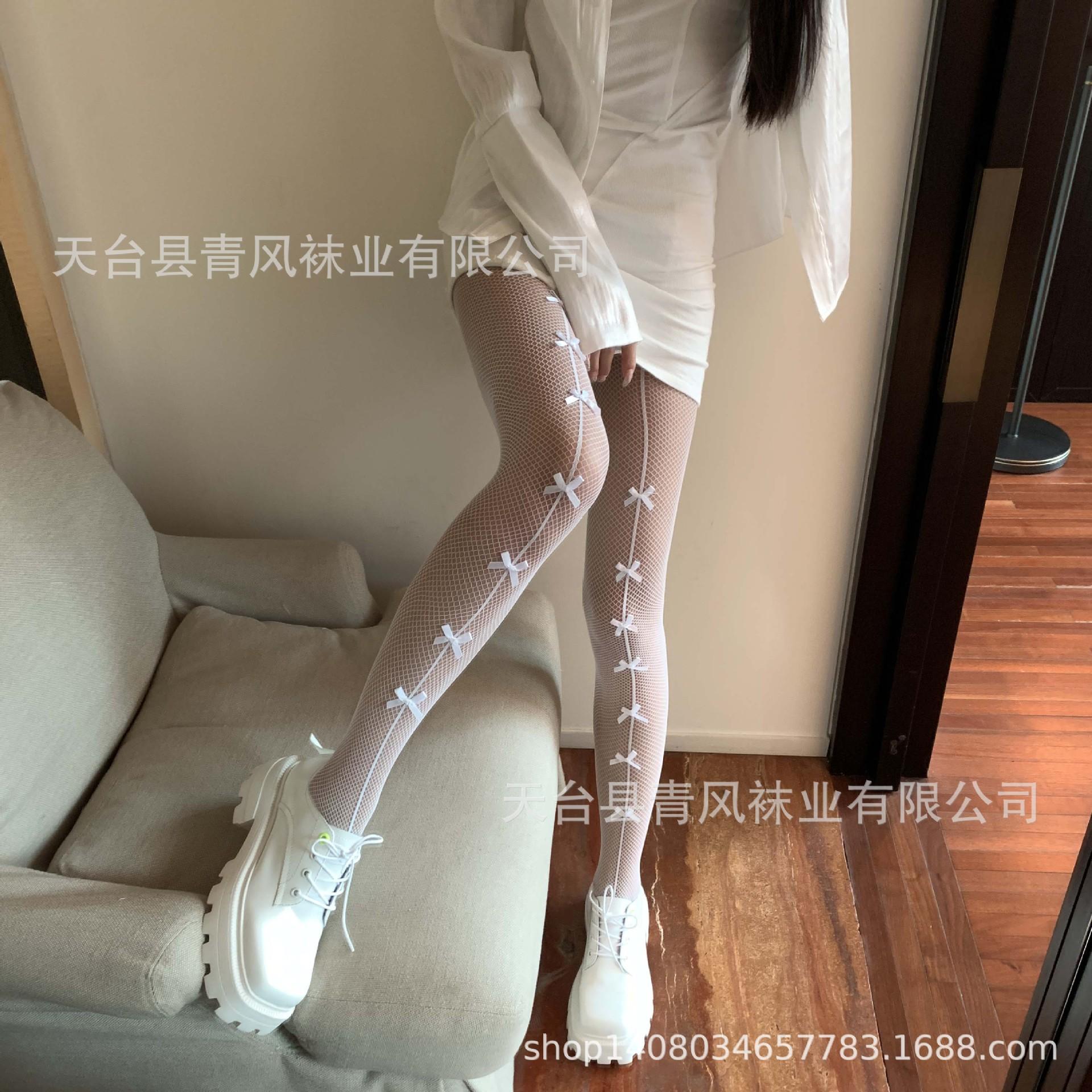 Calcetines de red con lazo blanco para mujer, finos y sexys, tipo pantimedias JK, con lazo hueco, de un solo cuerpo, de red negra.