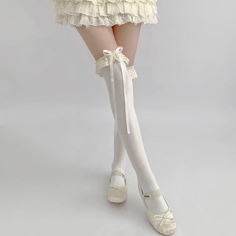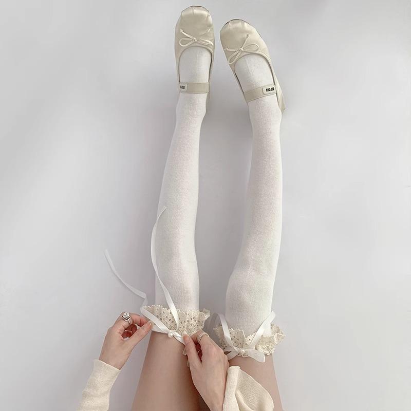 Calcetines de encaje por encima de la rodilla Medias de algodón Lolita de color blanco leche puro Calcetines de mujer estilo ballet con costuras de cinta