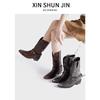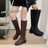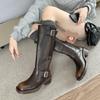 Botas retro de mujer 2023, botas altas de cuero con tacón grueso y punta cuadrada, botas de caballero marrones de alta moda.
