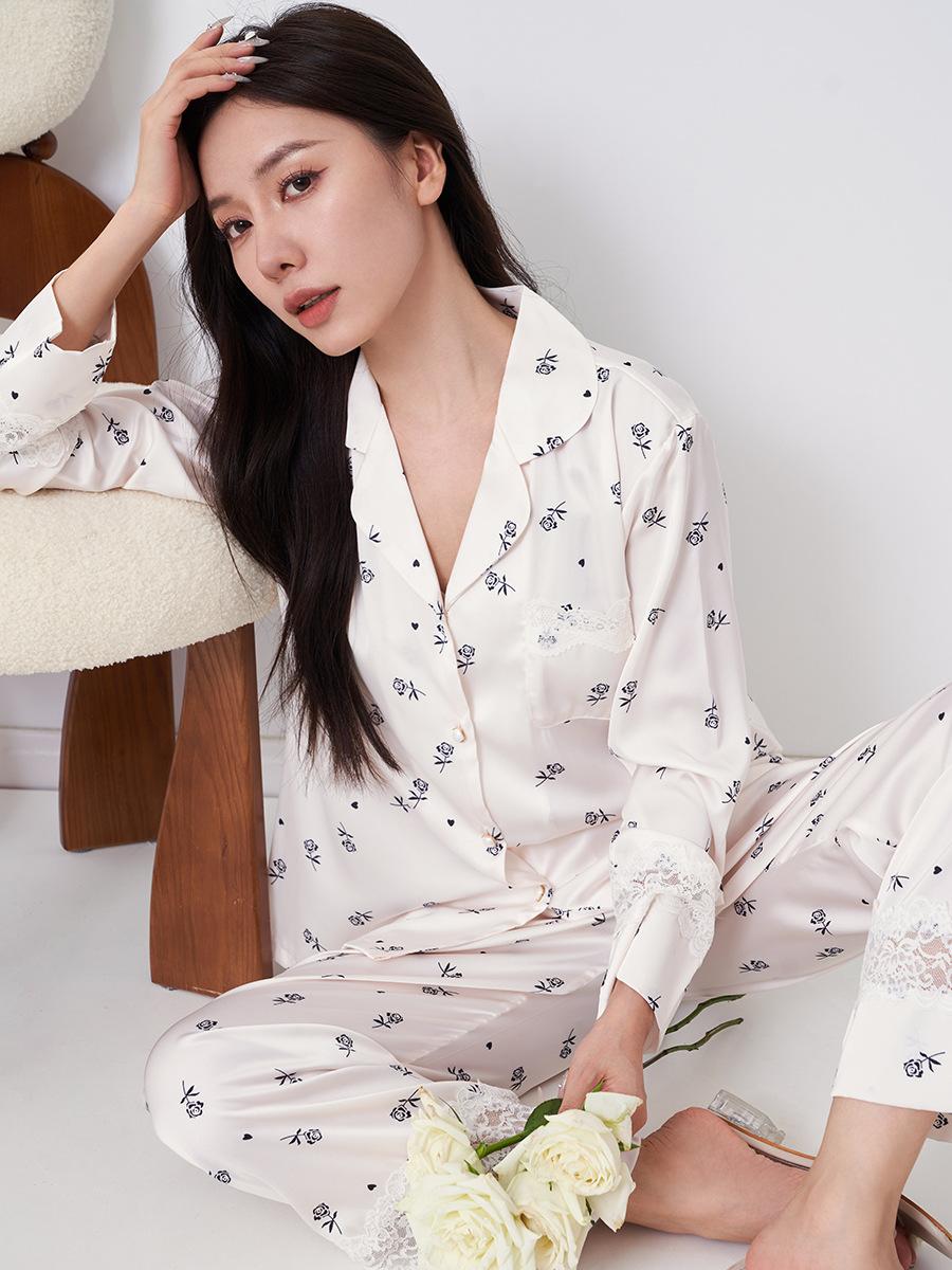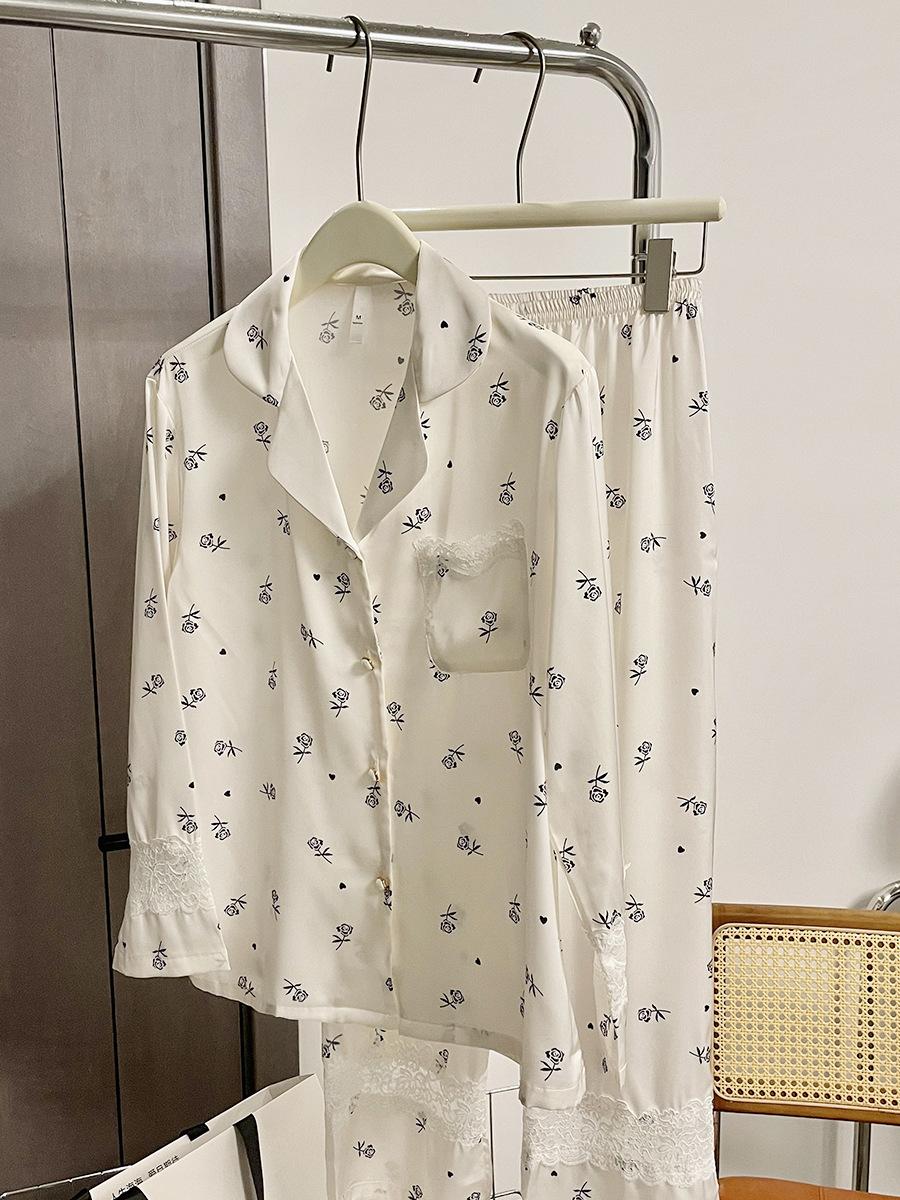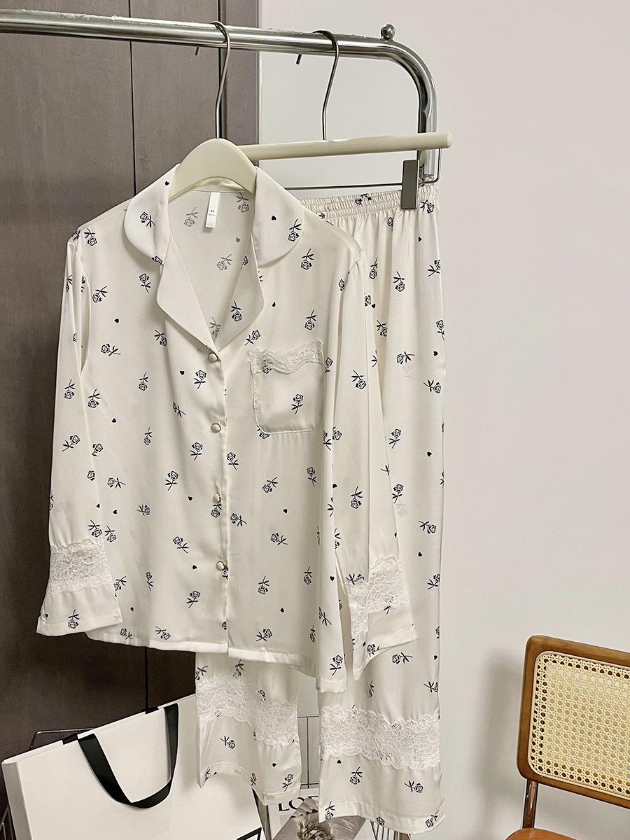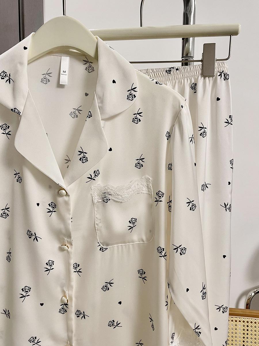 Pijama de Lujo Ligero Francés Rosa Negra para Mujer Seda de Hielo Seda de Alta Gama Floral Manga Larga Conjunto de Ropa para el Hogar