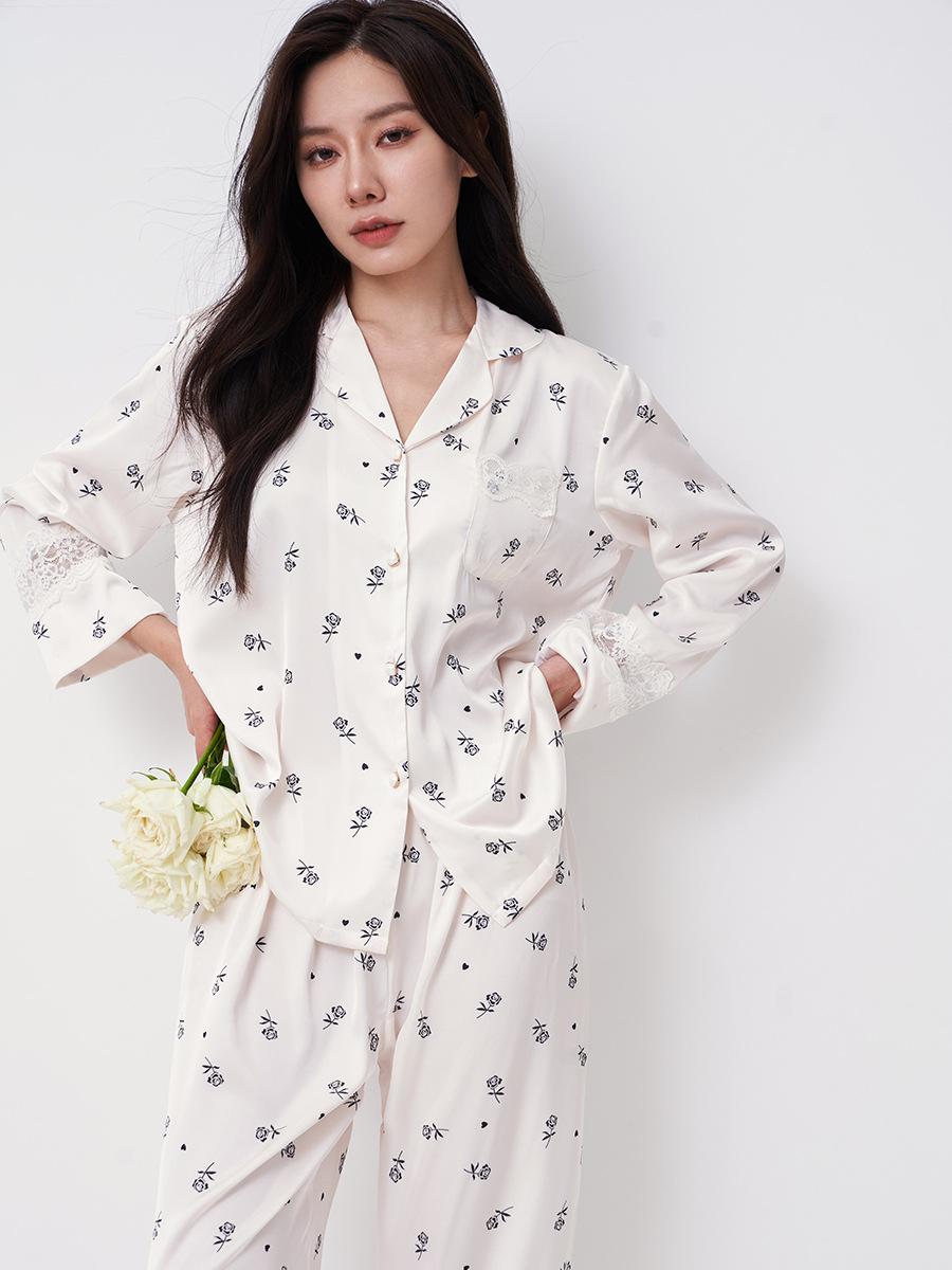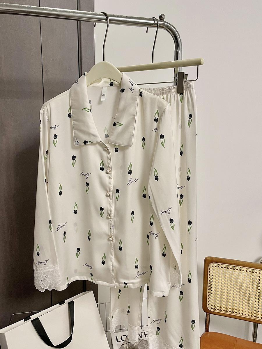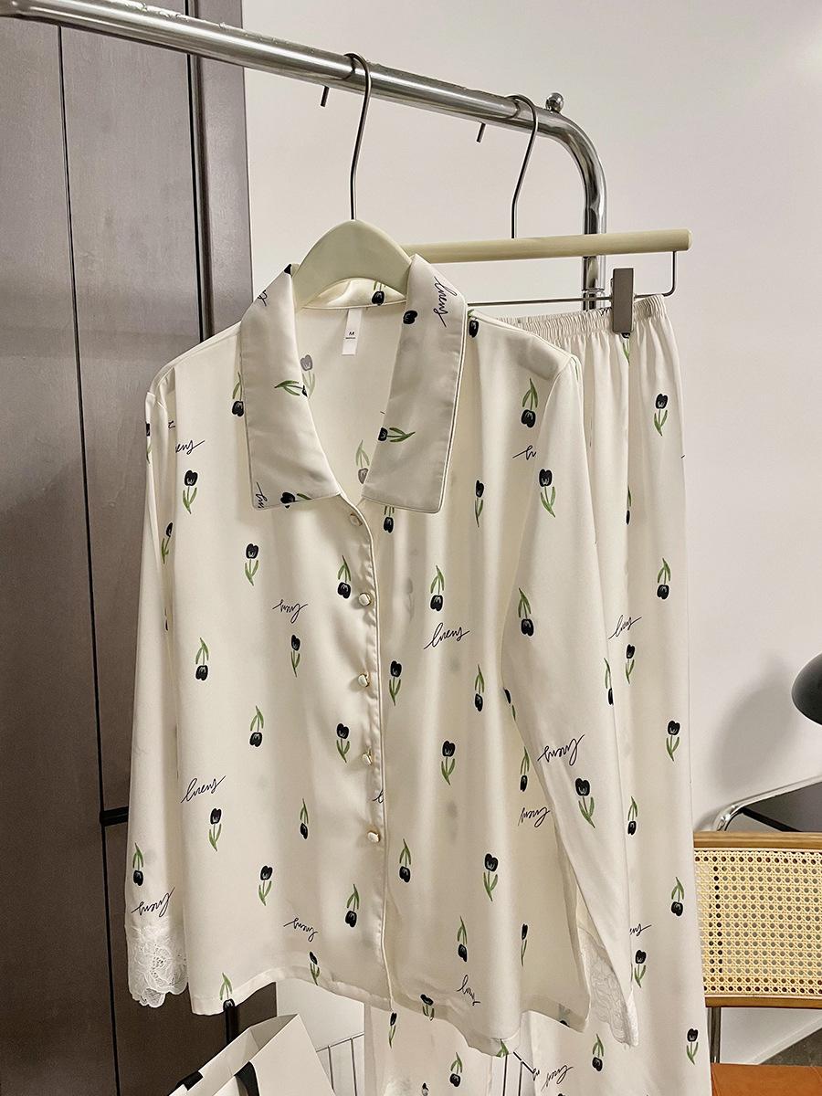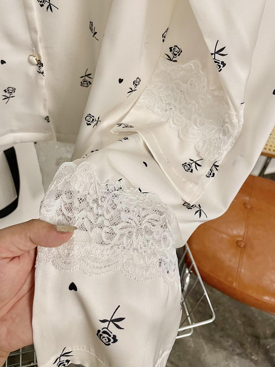 Pijama de Lujo Ligero Francés Rosa Negra para Mujer Seda de Hielo Seda de Alta Gama Floral Manga Larga Conjunto de Ropa para el Hogar