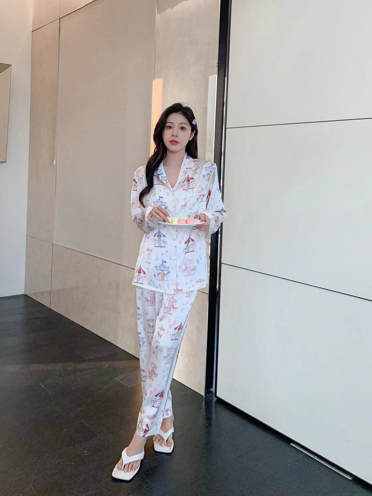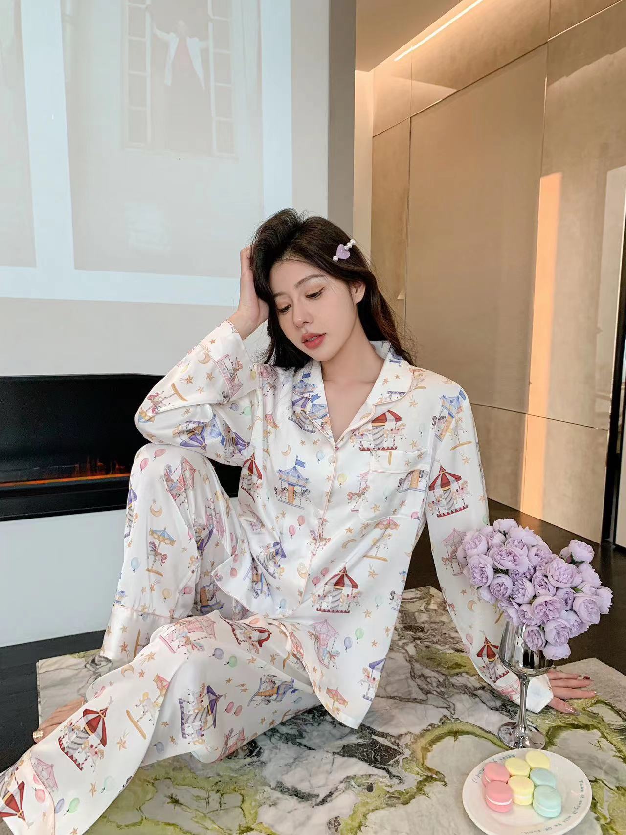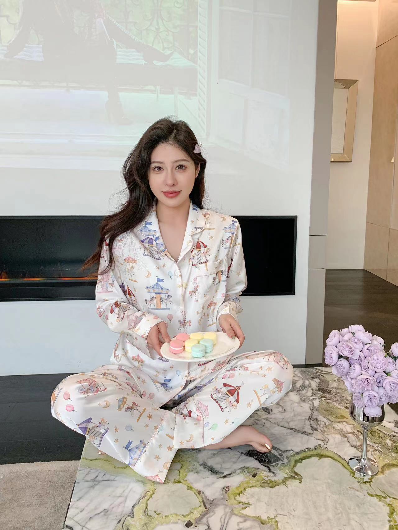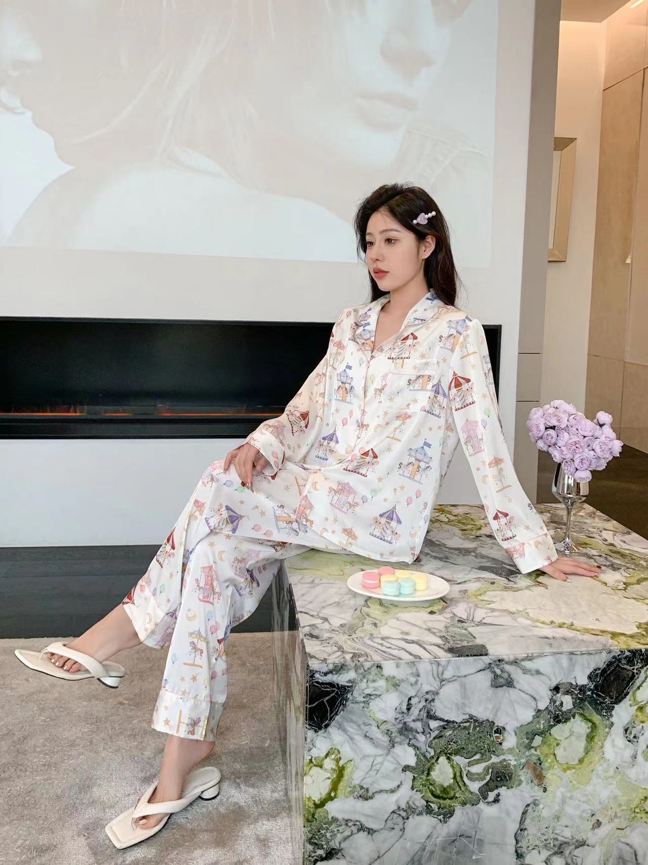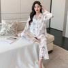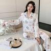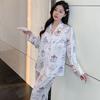 Pijama de Seda de Hielo con estampado jacquard nuevo de primavera 2024 para mujer, ropa casual para el hogar, traje de pantalón de manga larga, lindo