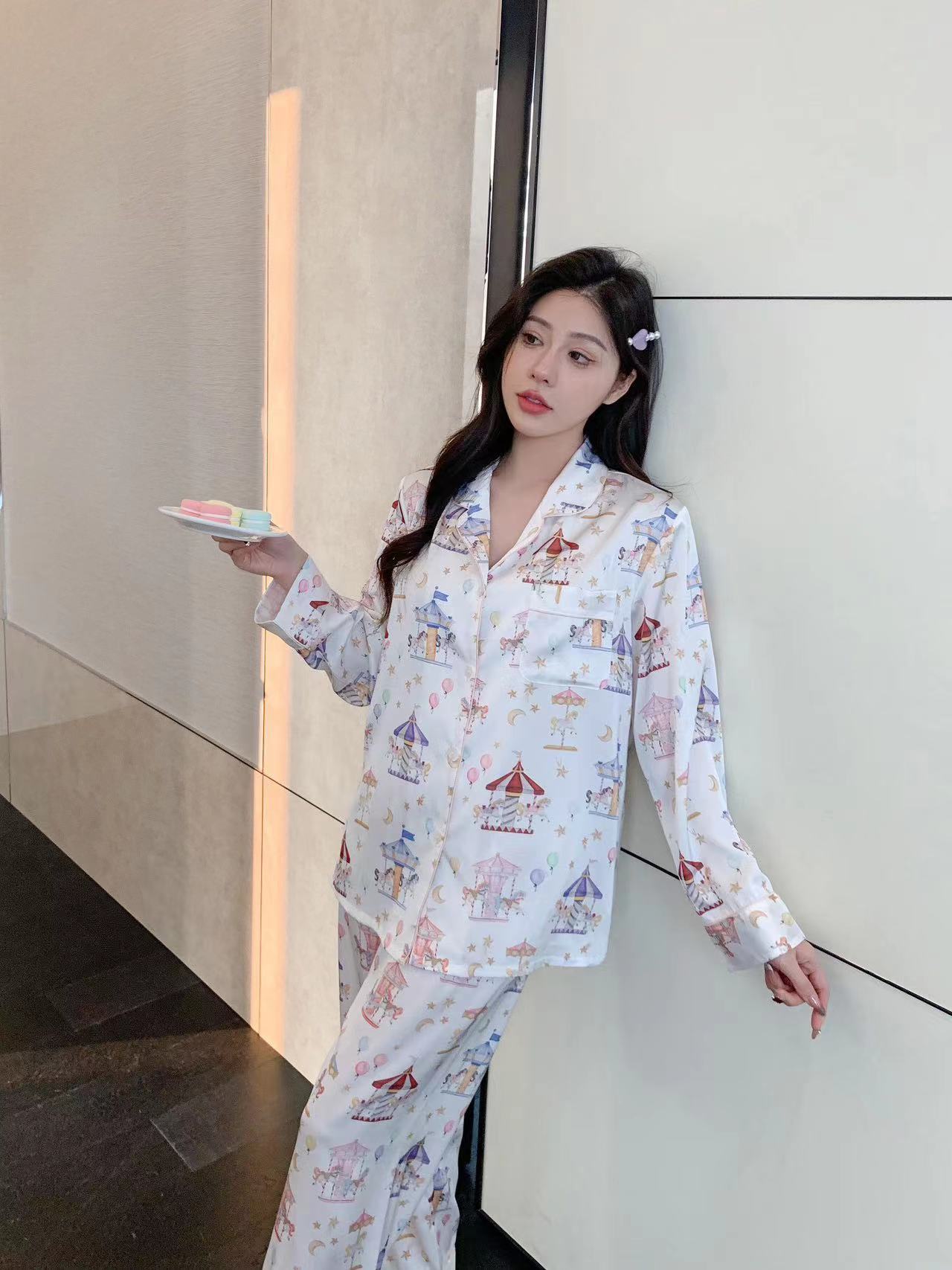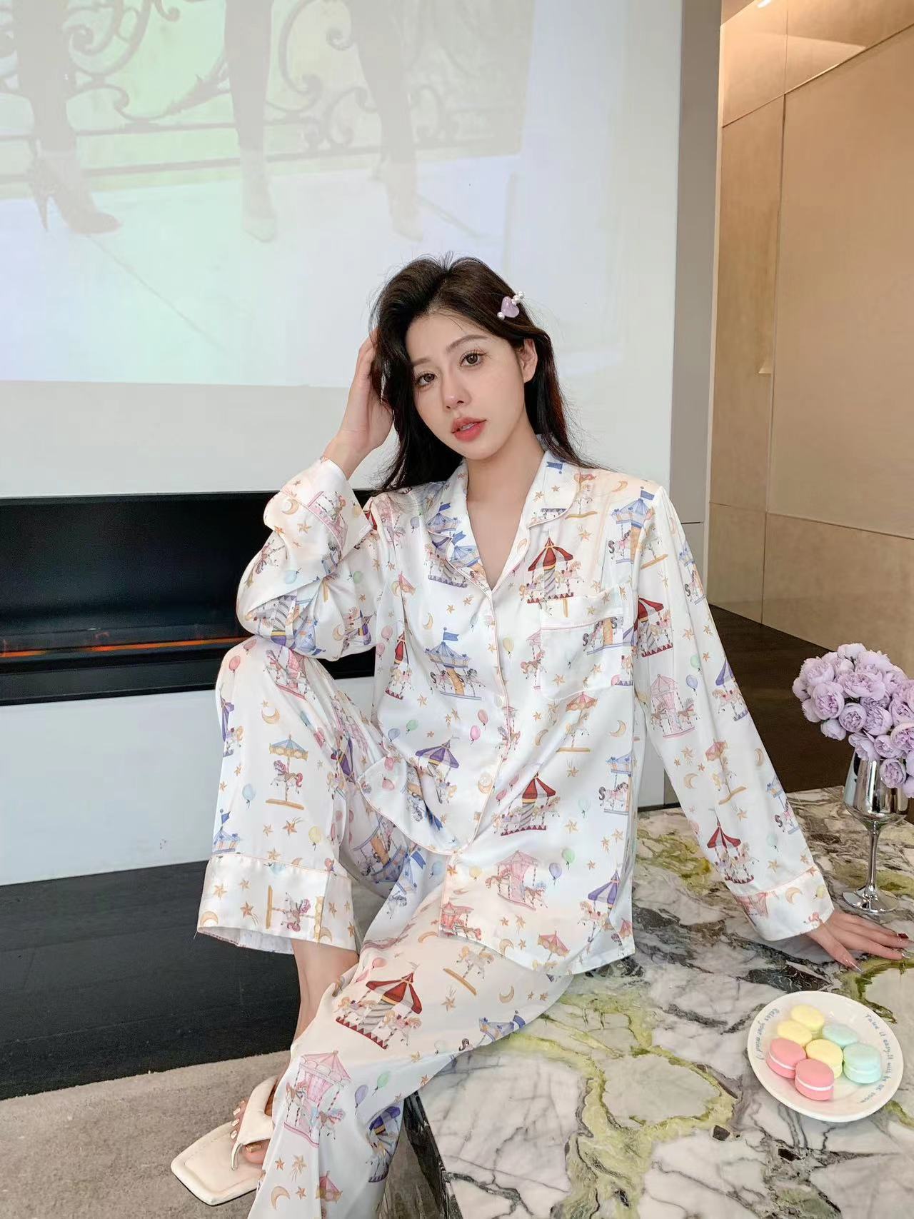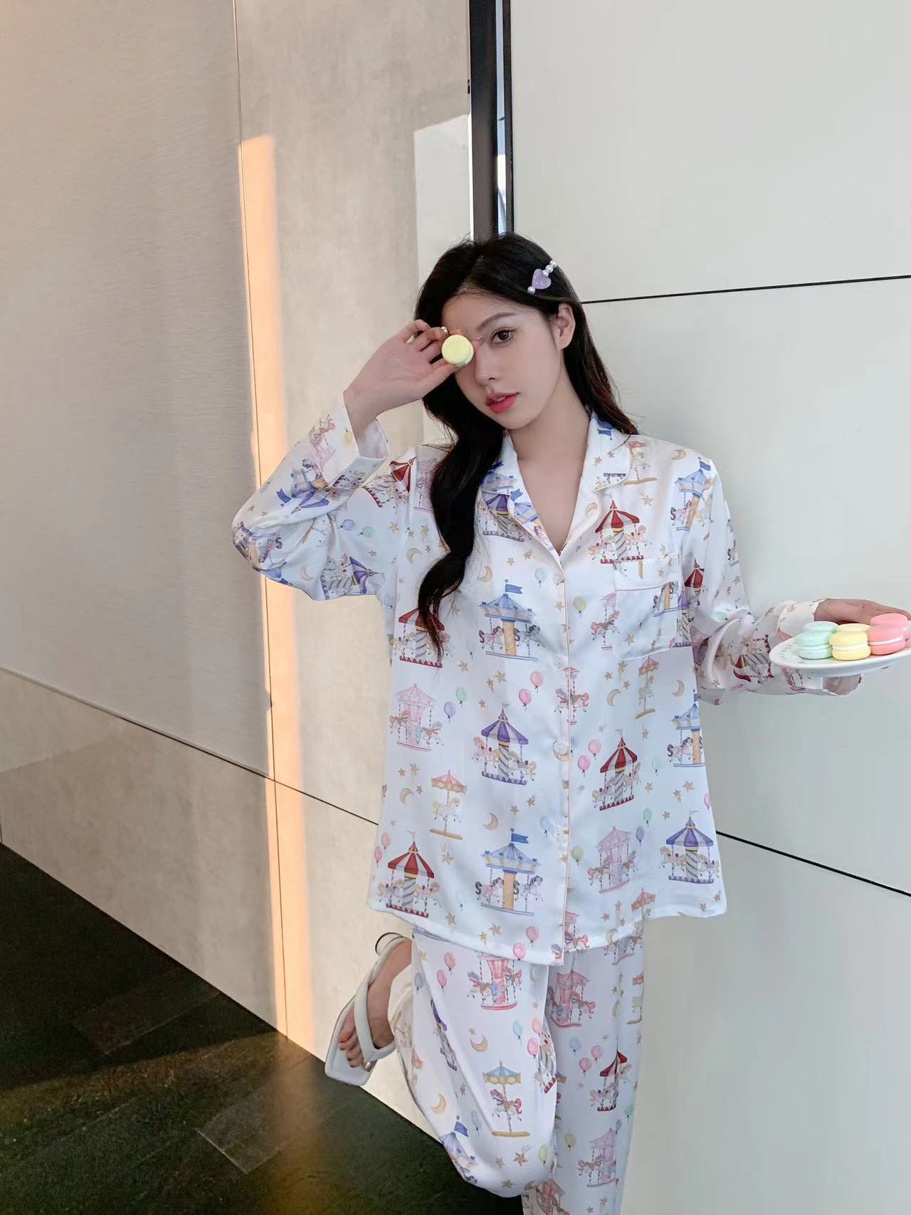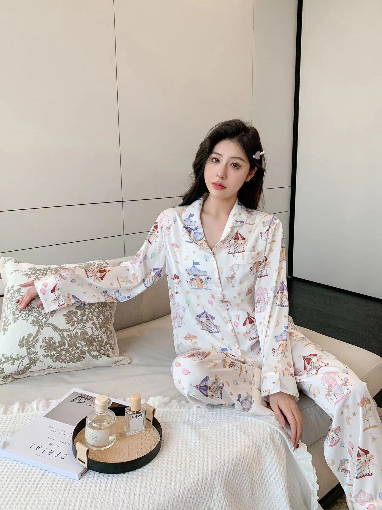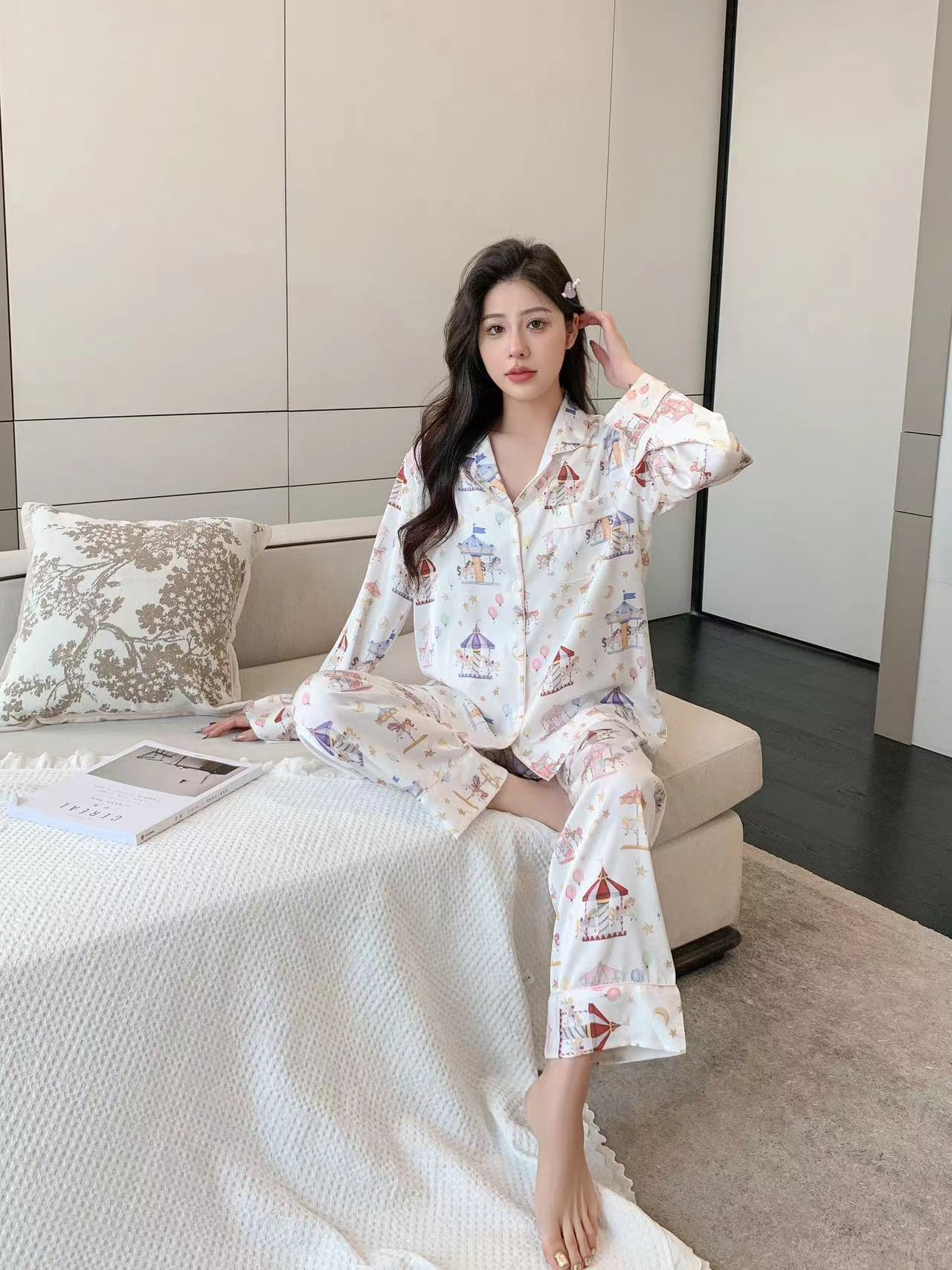 Pijama de Seda de Hielo con estampado jacquard nuevo de primavera 2024 para mujer, ropa casual para el hogar, traje de pantalón de manga larga, lindo