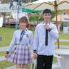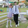 Women's Fine Black Long-sleeved Pink Purple Dress with Blue Ribbon, Men's Black Long-sleeved Black Trousers Black Tie