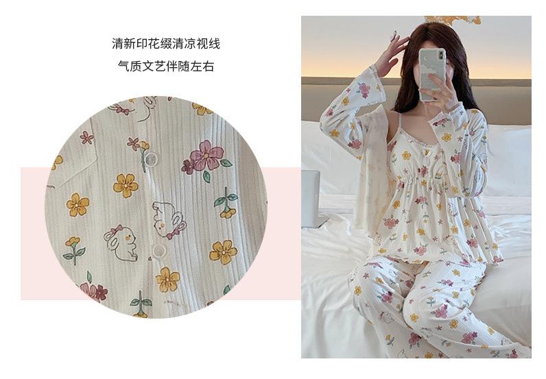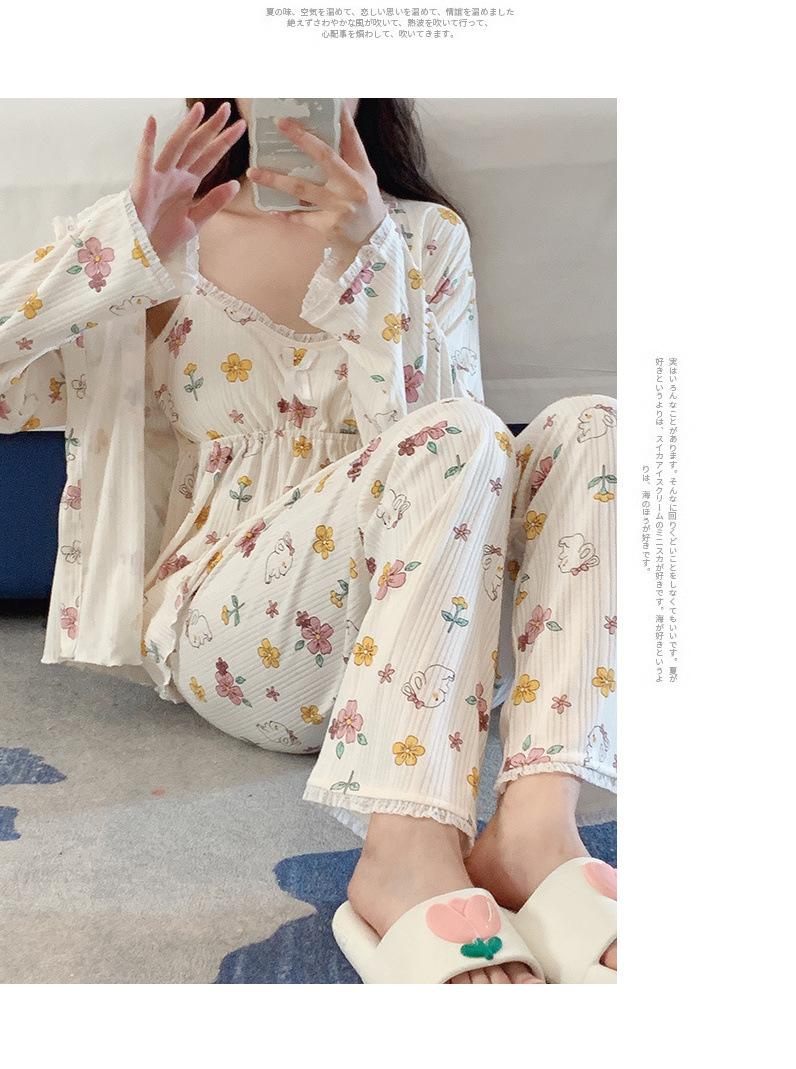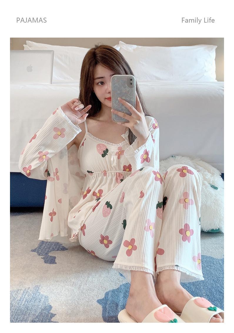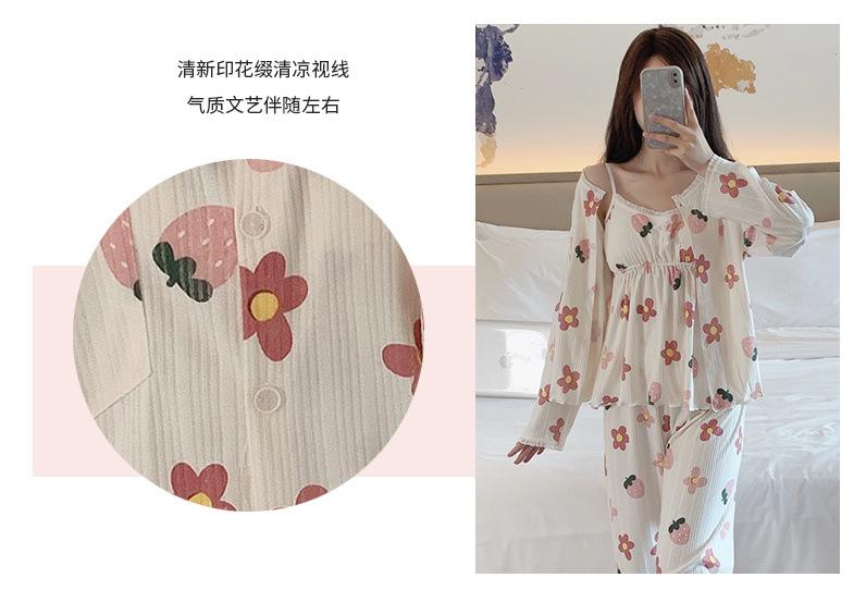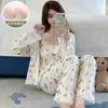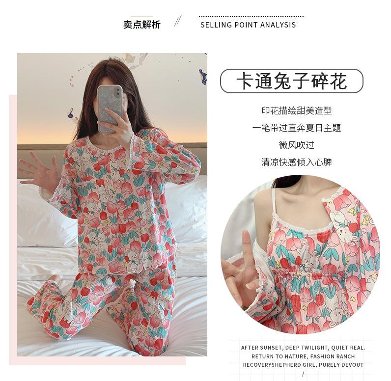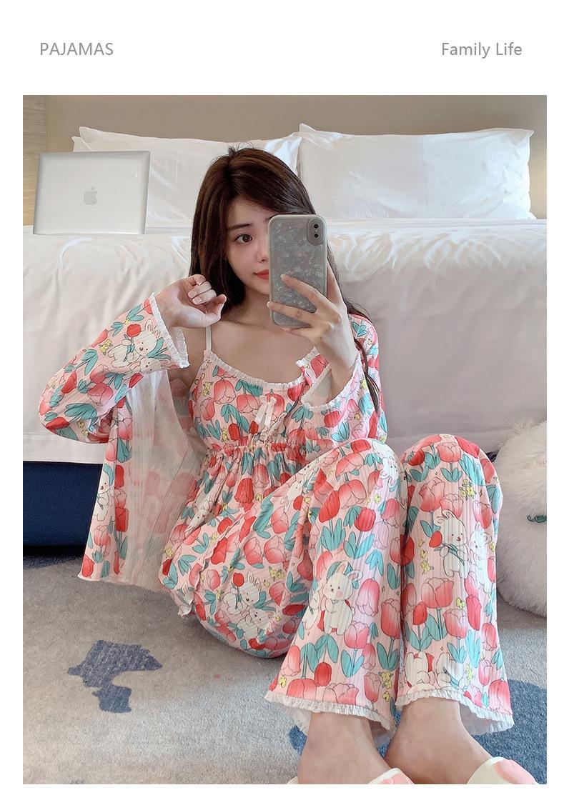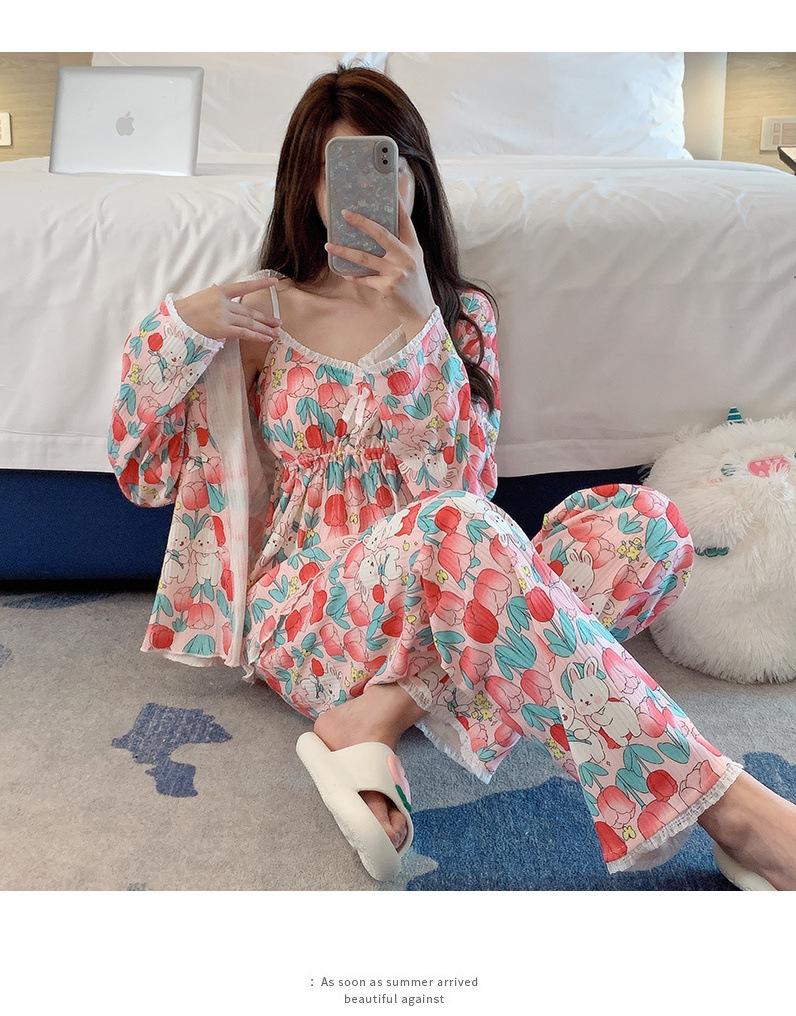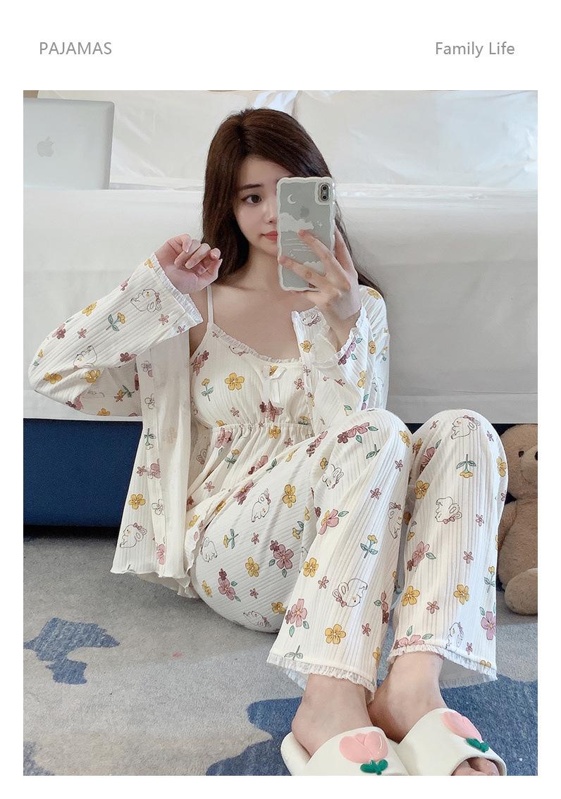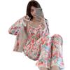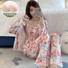 Pijama floral estilo perezoso para mujer, conjunto de tres piezas, primavera y otoño, fino, de verano, para niña, ropa de casa, con tirantes desmontables y almohadilla para el pecho.