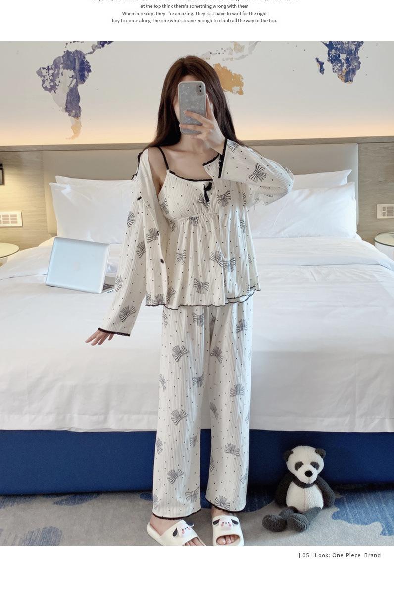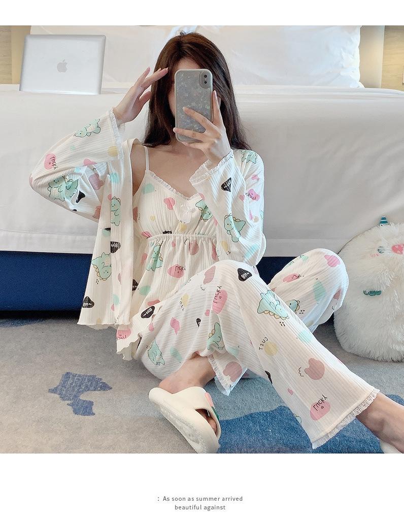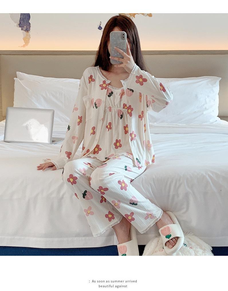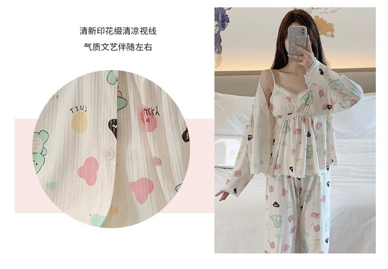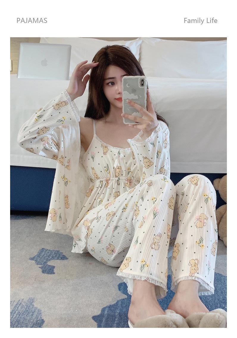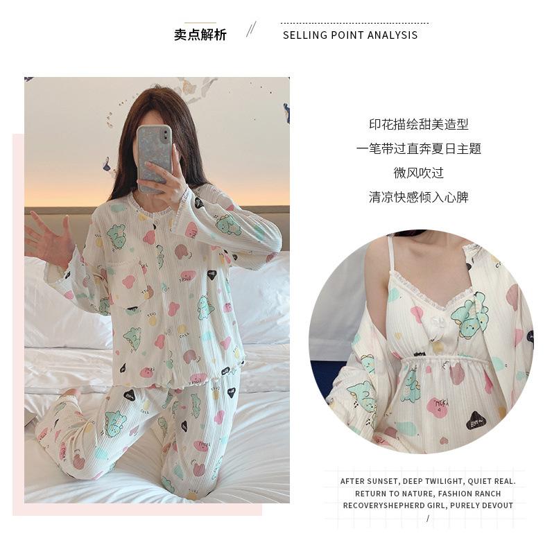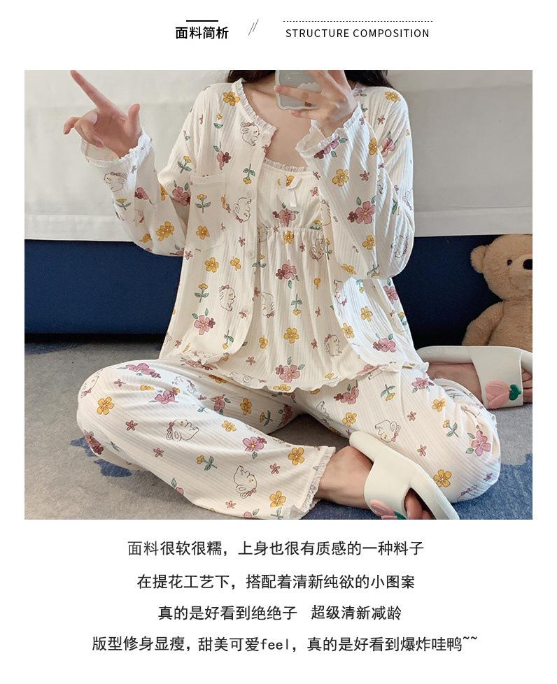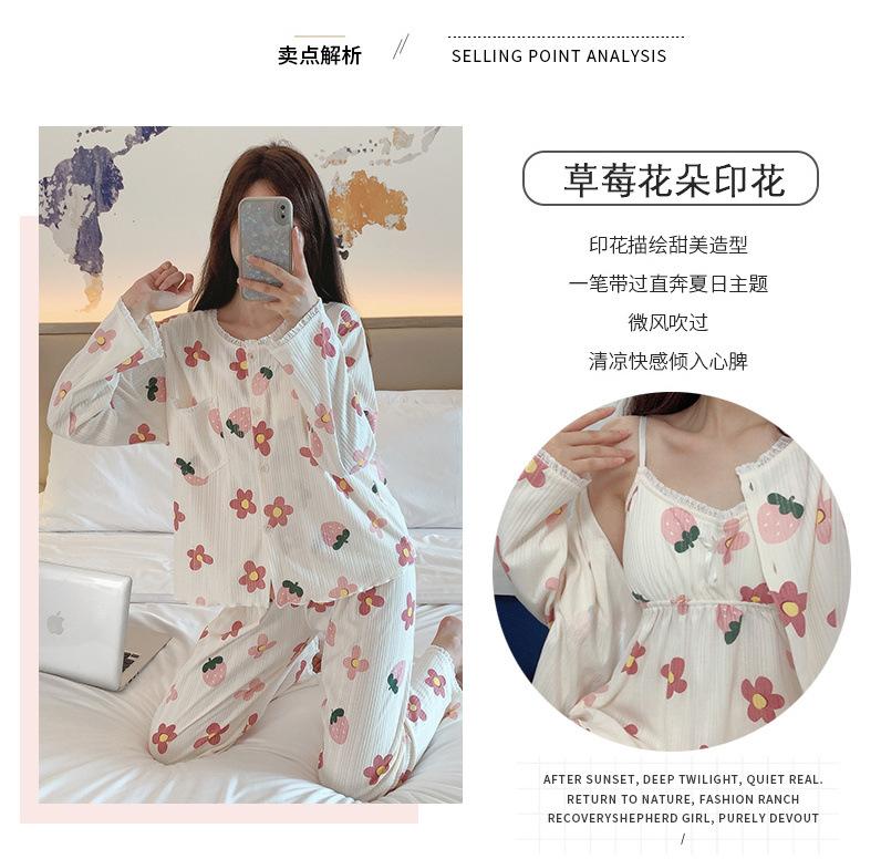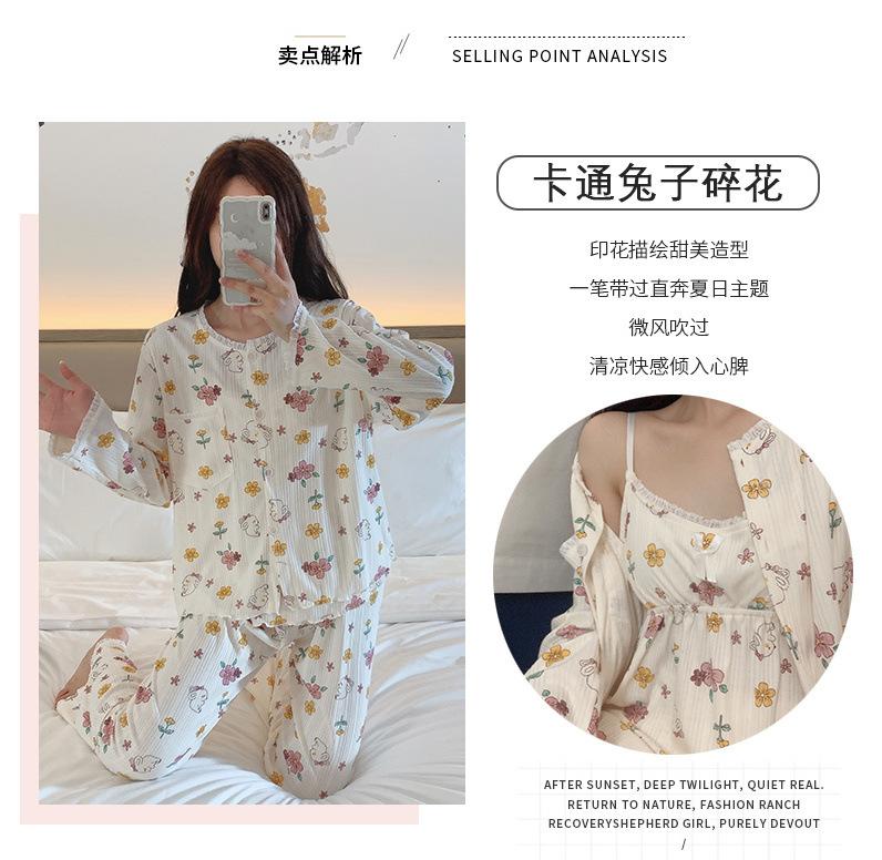 Pijama floral estilo perezoso para mujer, conjunto de tres piezas, primavera y otoño, fino, de verano, para niña, ropa de casa, con tirantes desmontables y almohadilla para el pecho.