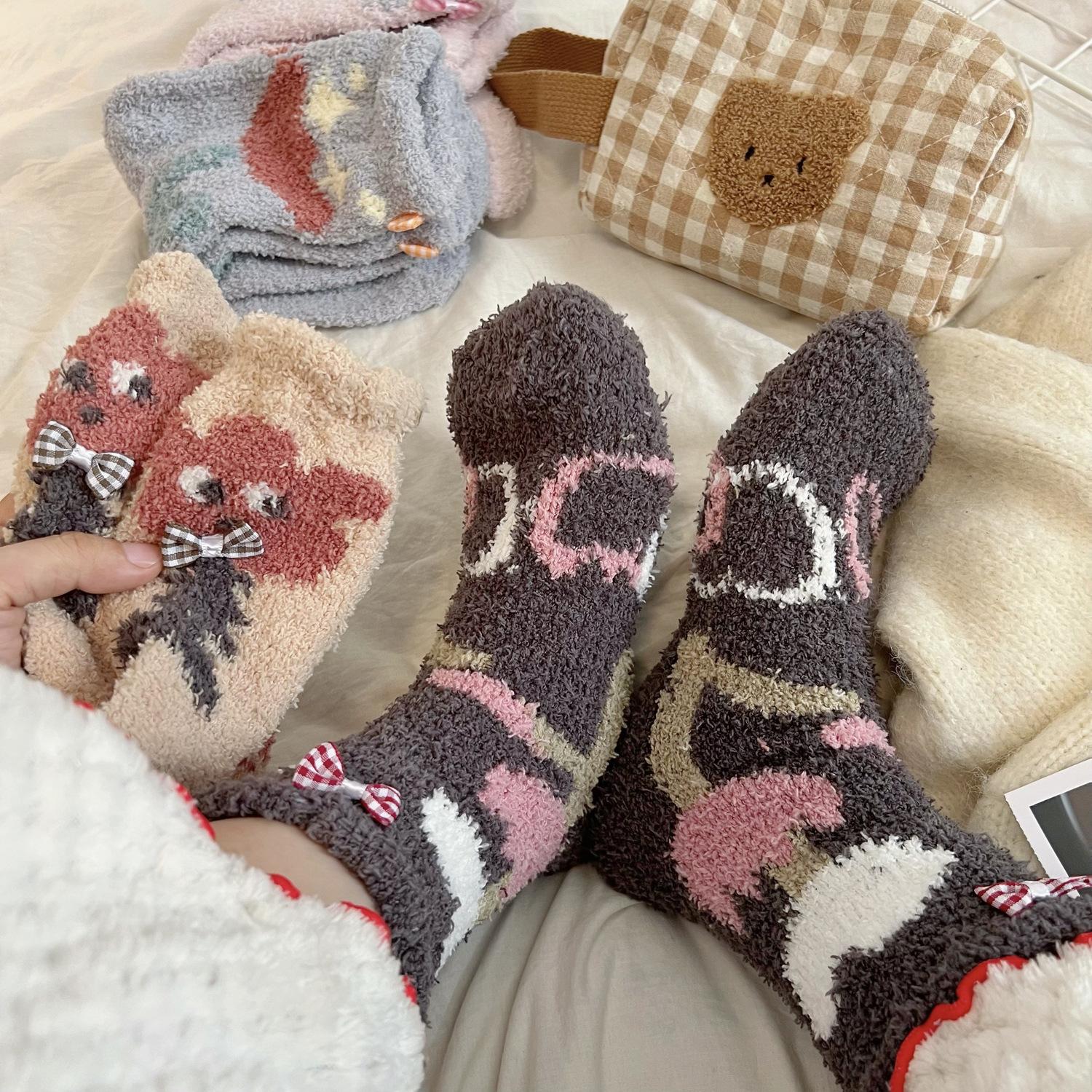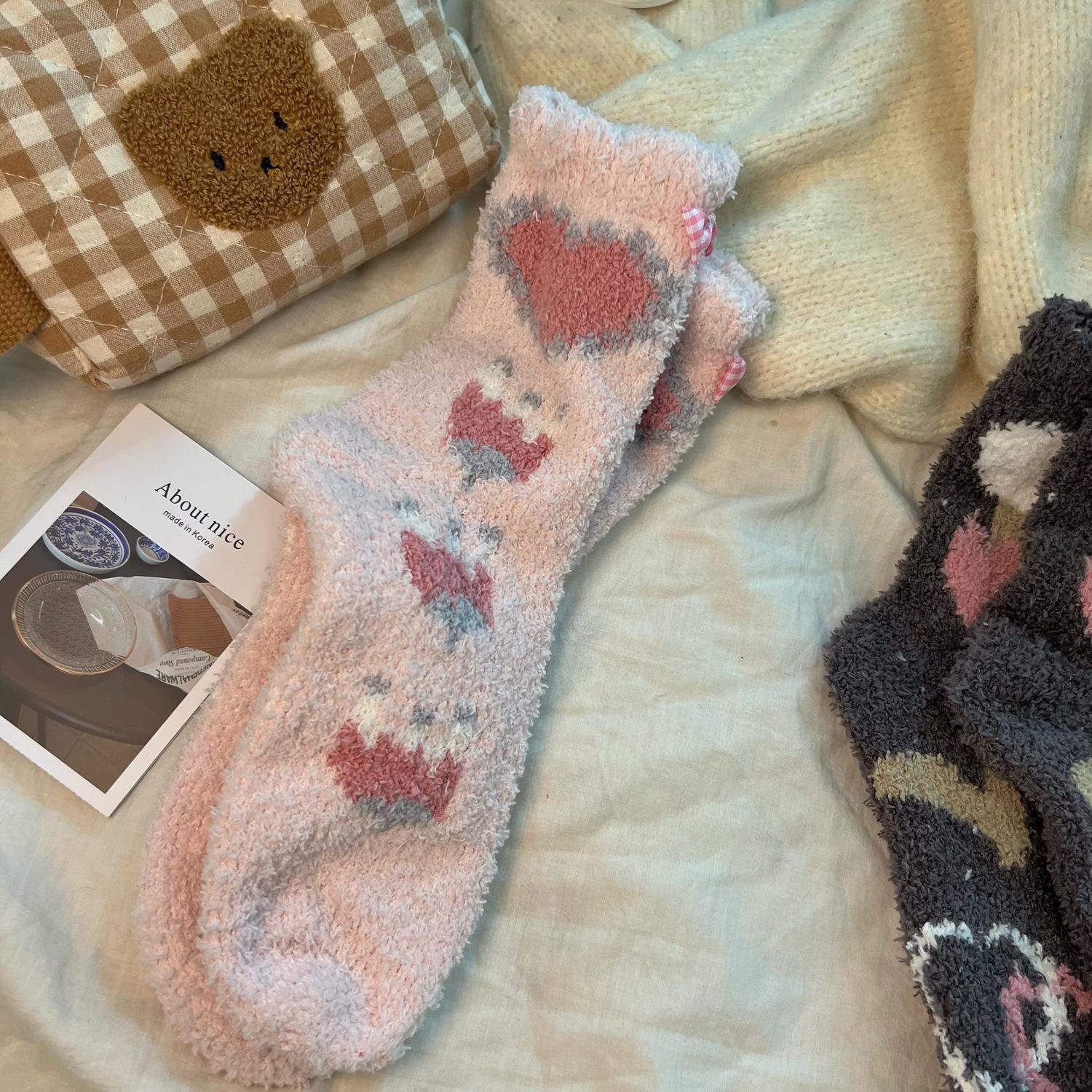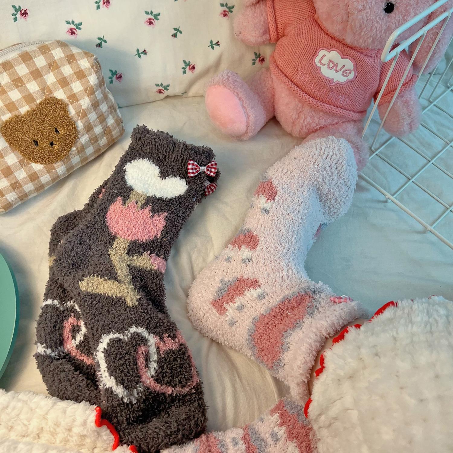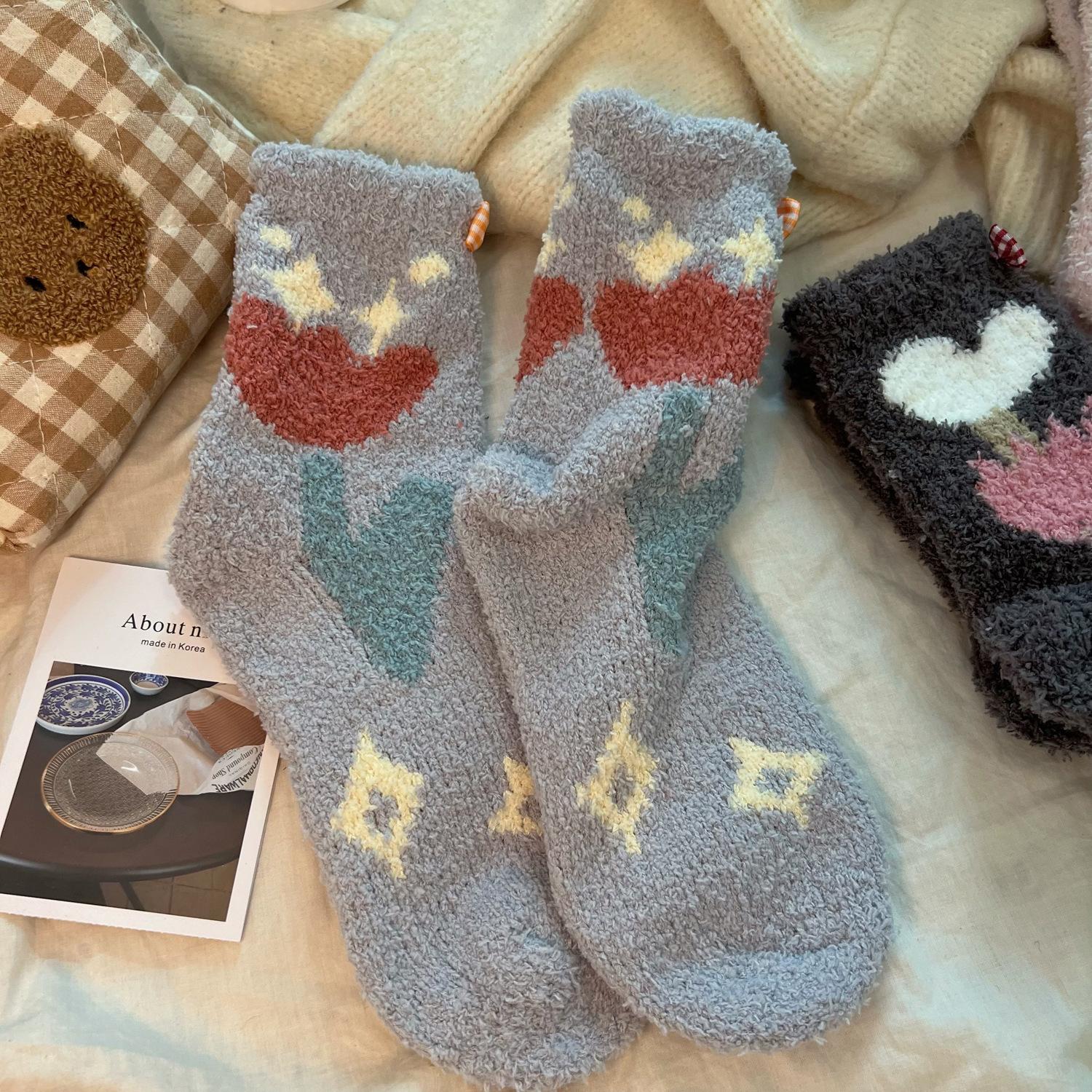 Calcetines de terciopelo coral de tulipán de invierno para mujer, calcetines dulces y lindos con forro polar para invierno, cálidos para el piso, calcetines gruesos de largo medio
