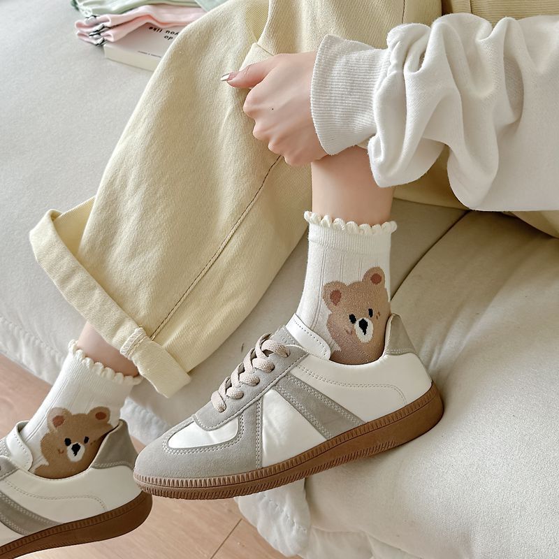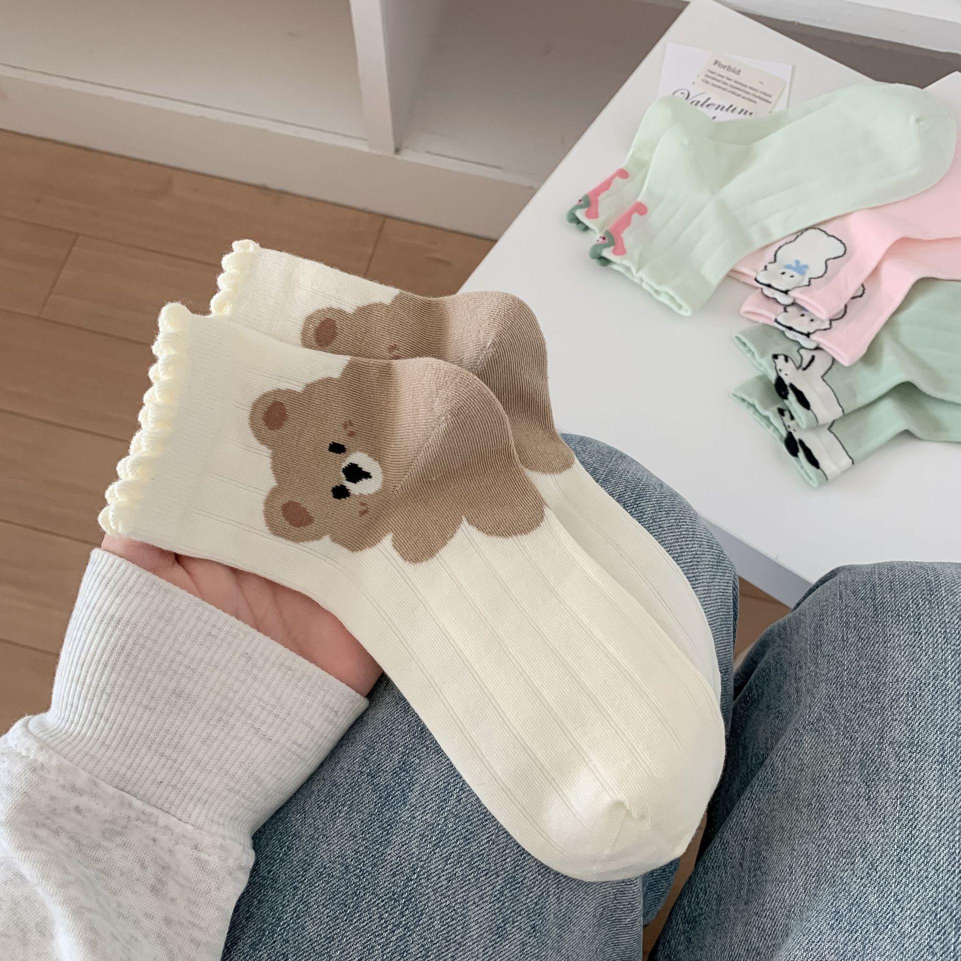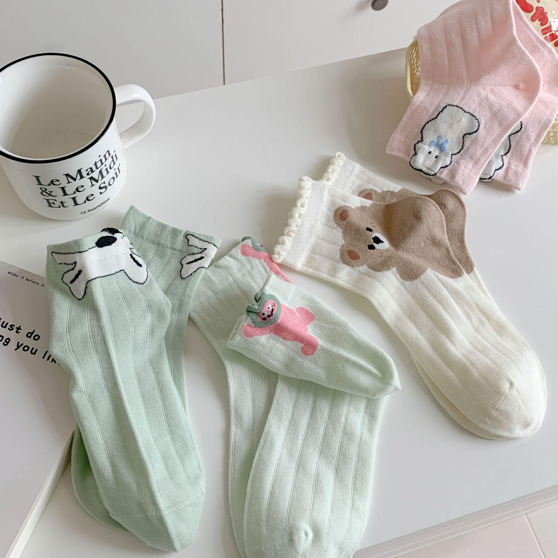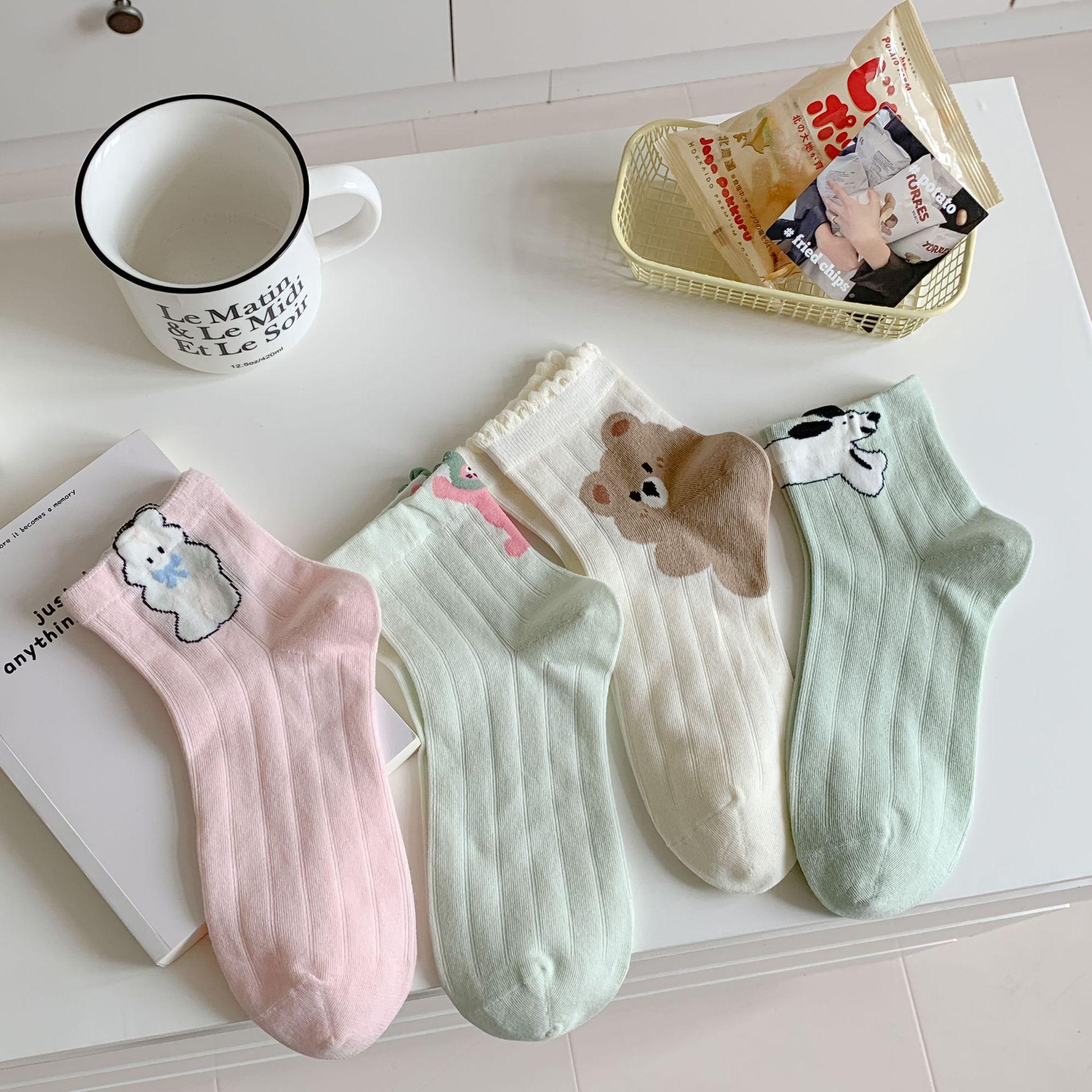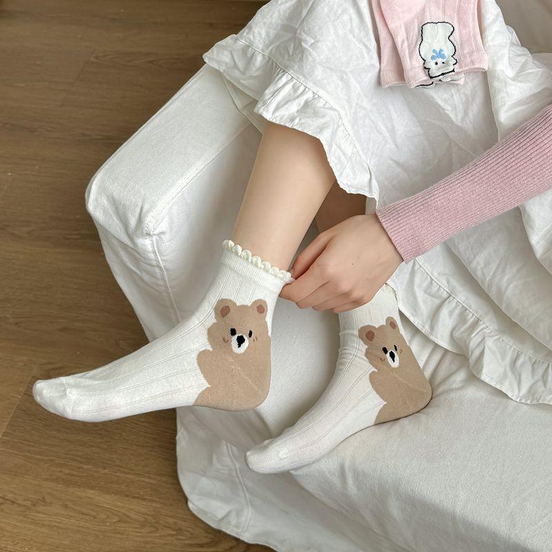 Primavera y Verano Nuevos Calcetines Cortos de Algodón con Oso de Dibujos Animados Estilo Coreano para Mujer Combinan con Todo Preppy Girl Calcetines de Encaje al Por Mayor