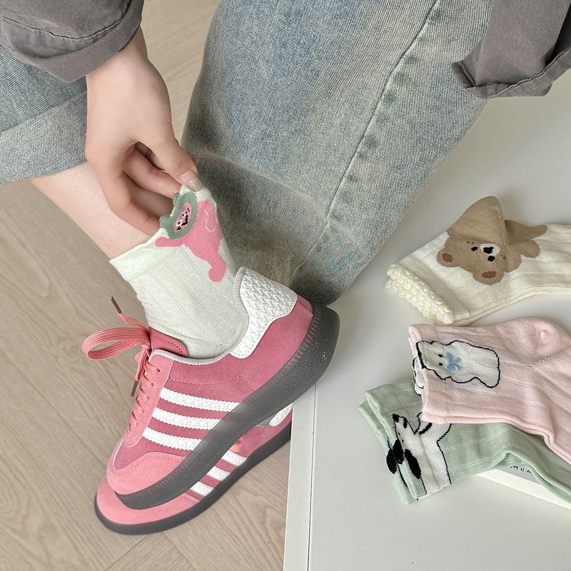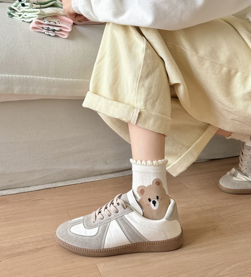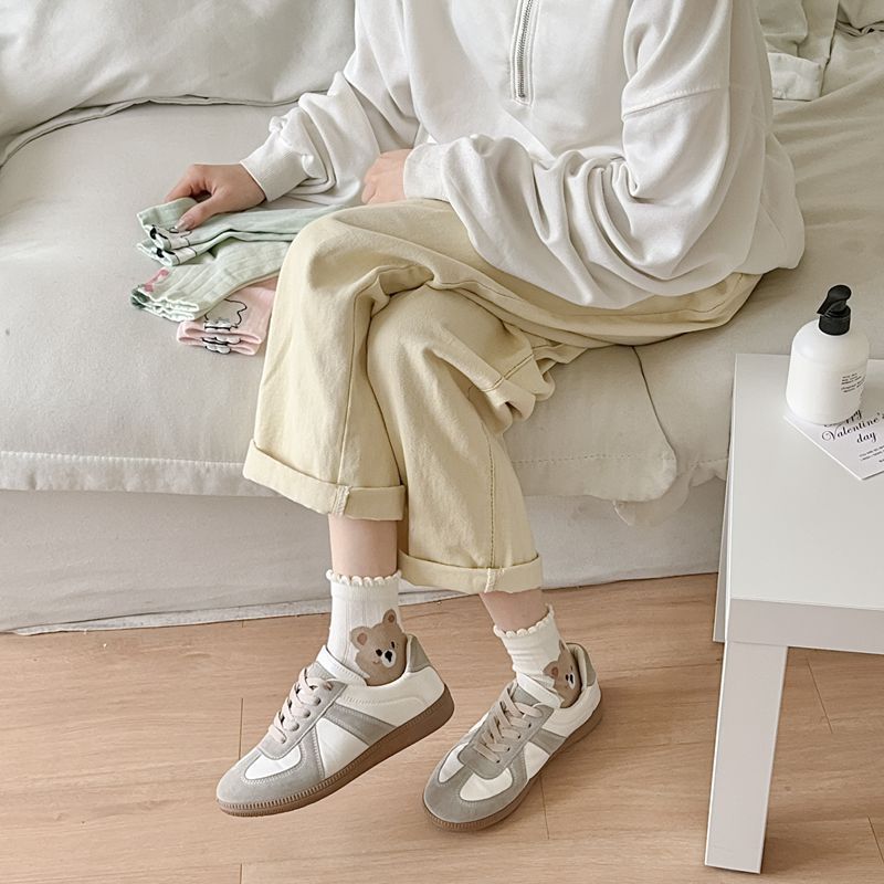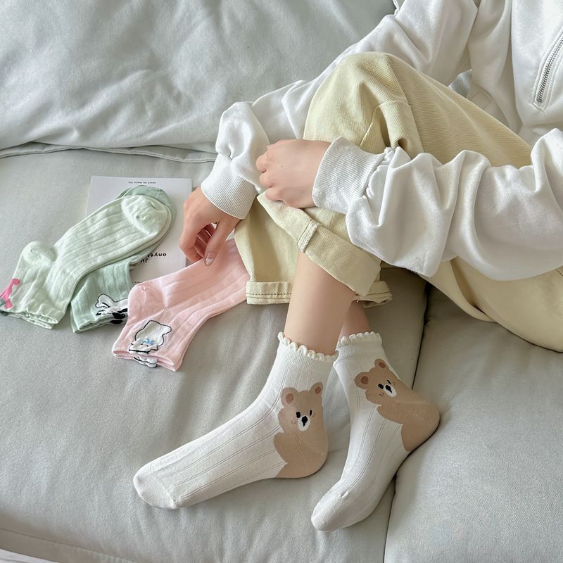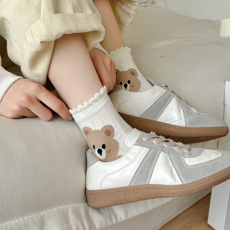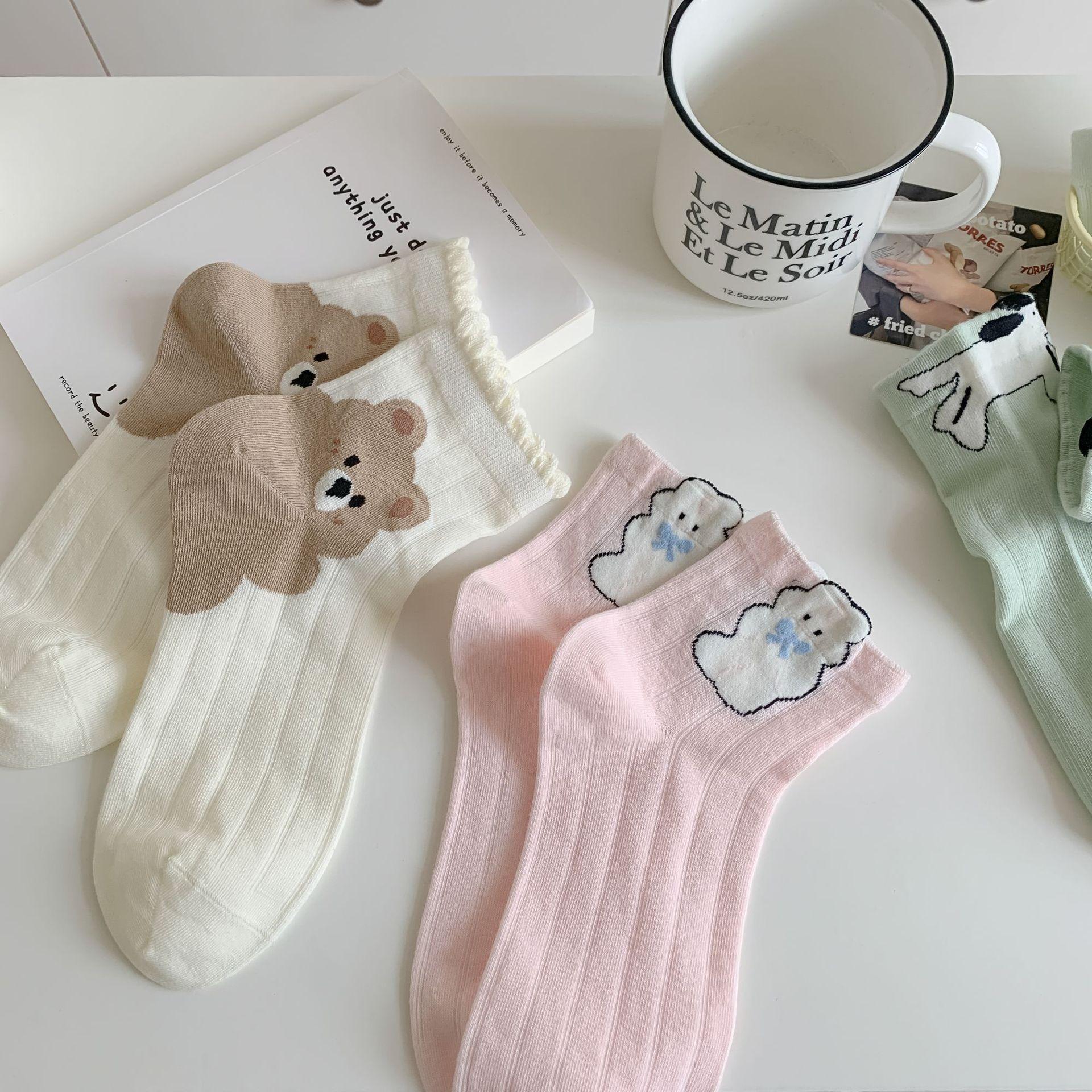 Primavera y Verano Nuevos Calcetines Cortos de Algodón con Oso de Dibujos Animados Estilo Coreano para Mujer Combinan con Todo Preppy Girl Calcetines de Encaje al Por Mayor