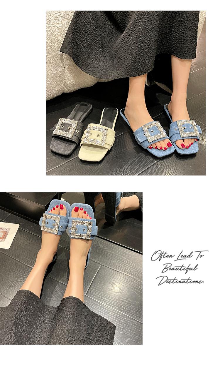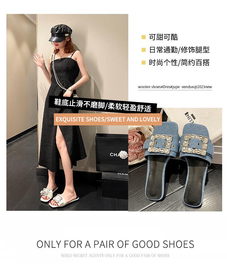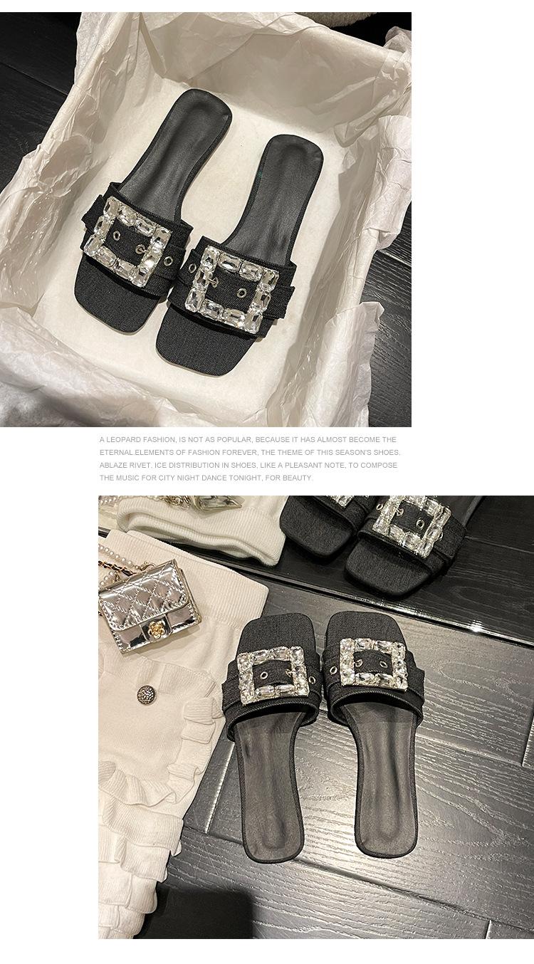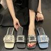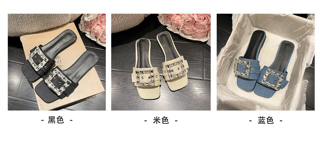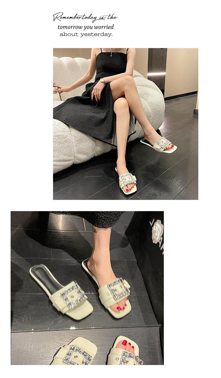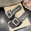 Sandalias planas para mujer, venta al por mayor, primavera y verano, nuevas zapatillas con hebilla cuadrada y diamantes de imitación de viento francés.