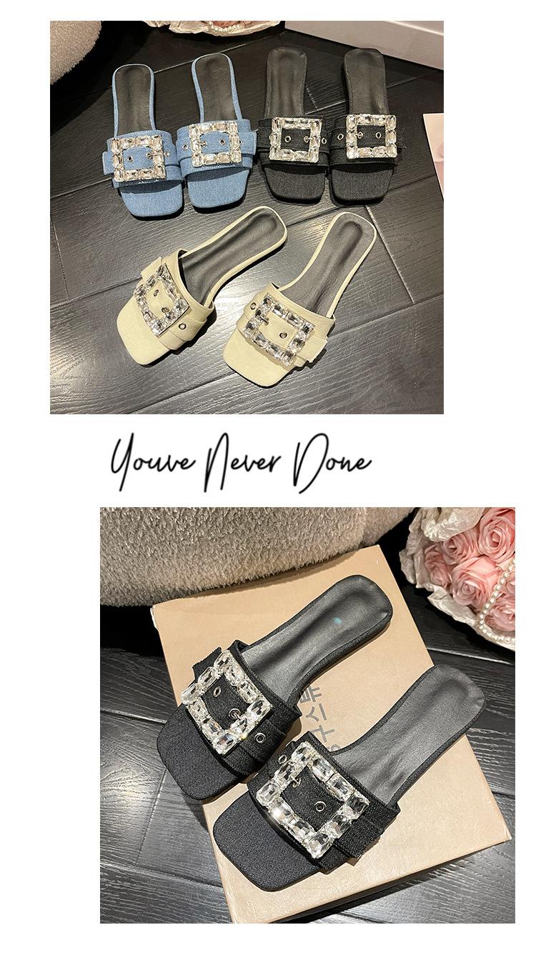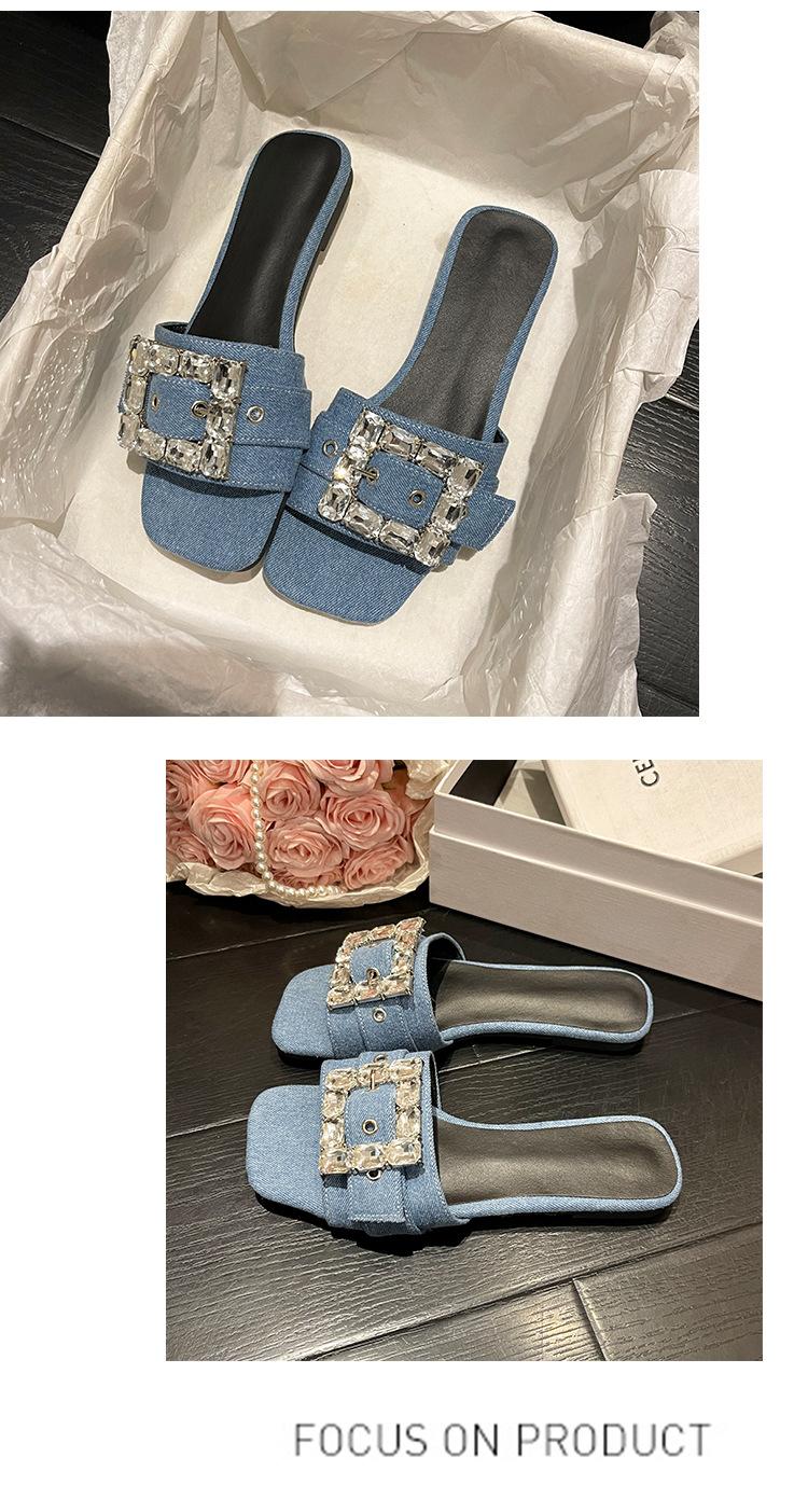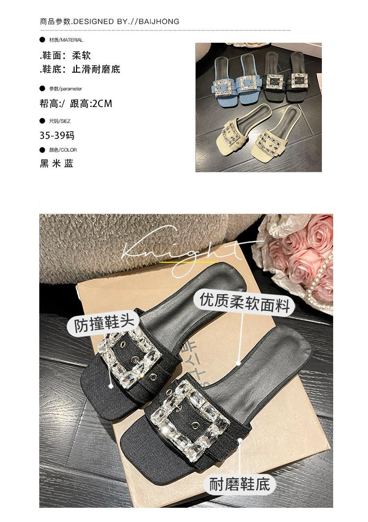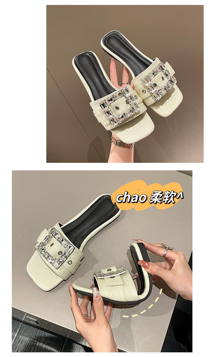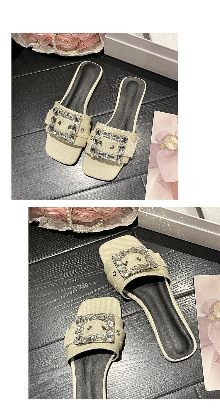 Sandalias planas para mujer, venta al por mayor, primavera y verano, nuevas zapatillas con hebilla cuadrada y diamantes de imitación de viento francés.