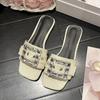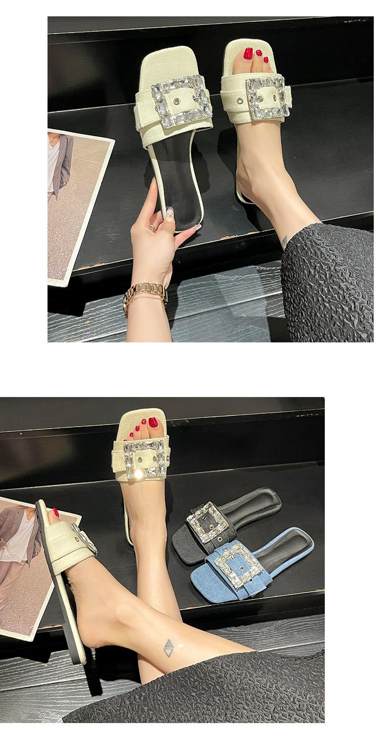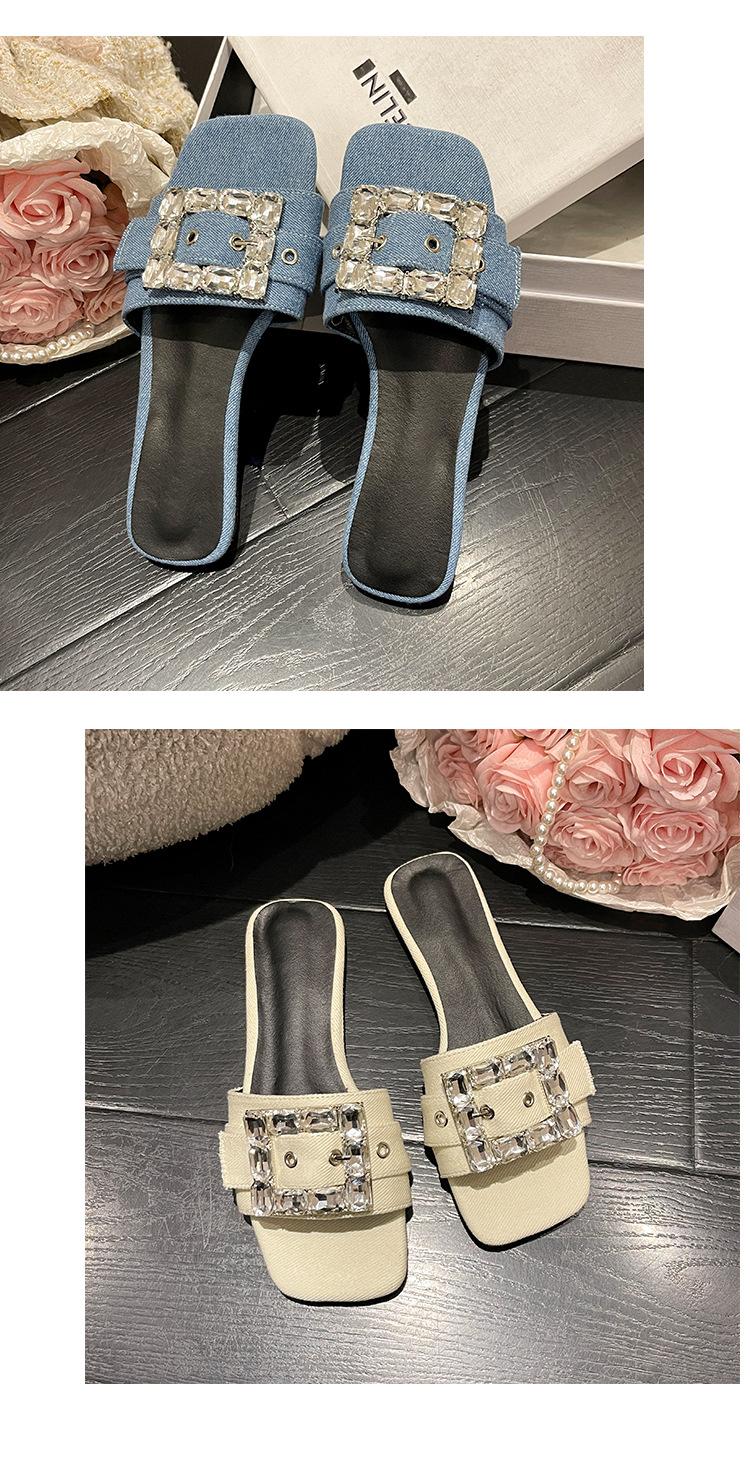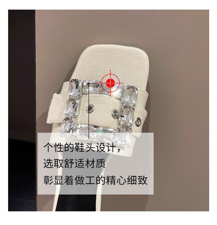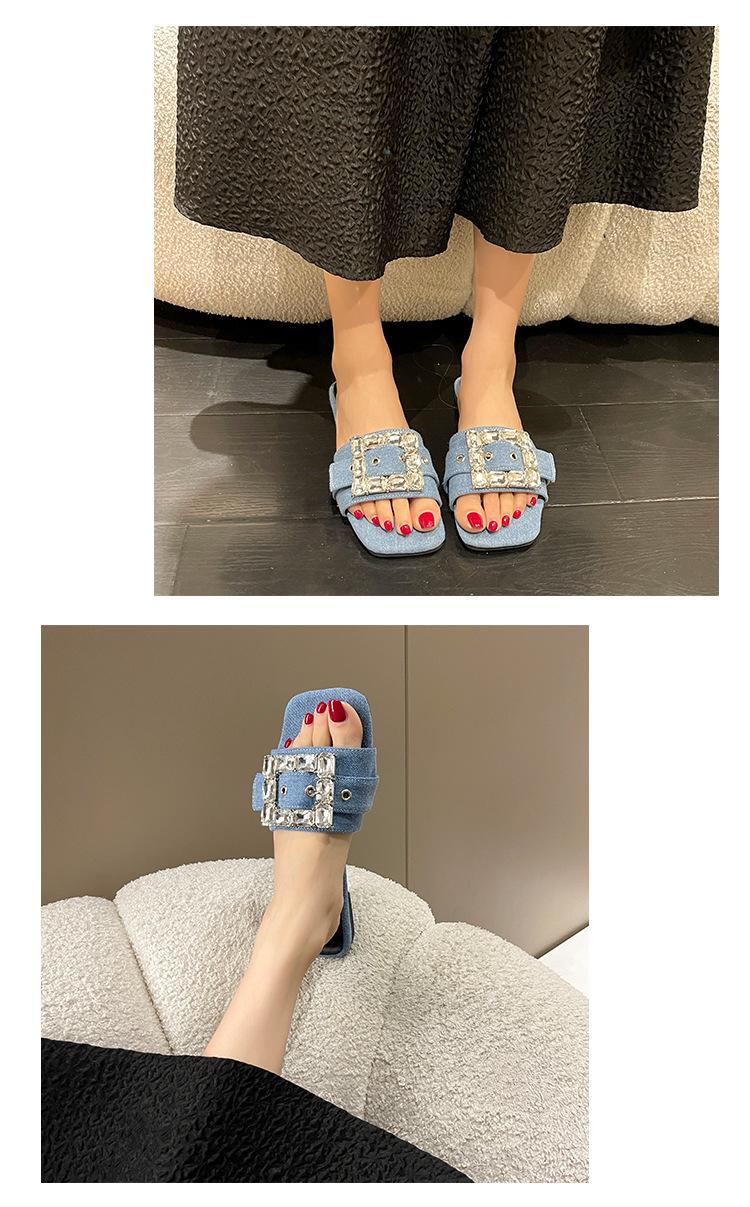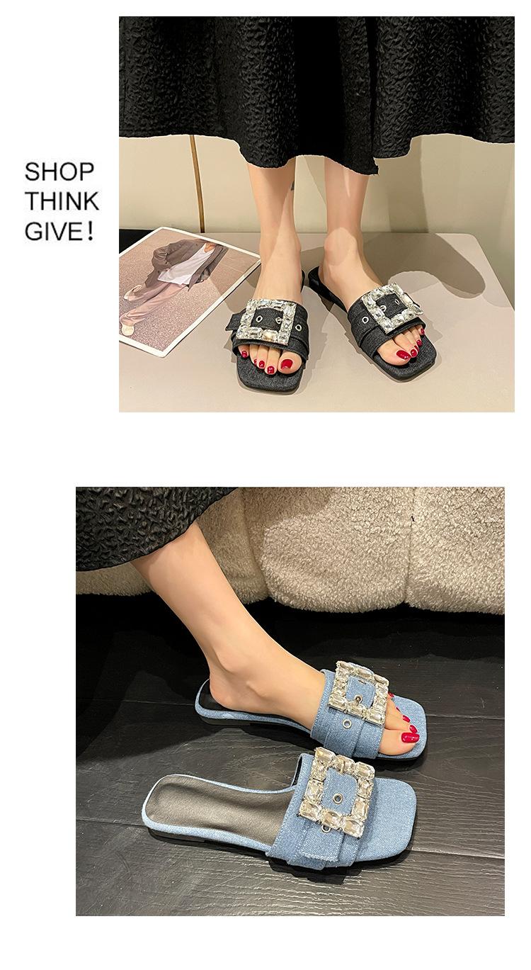 Sandalias planas para mujer, venta al por mayor, primavera y verano, nuevas zapatillas con hebilla cuadrada y diamantes de imitación de viento francés.