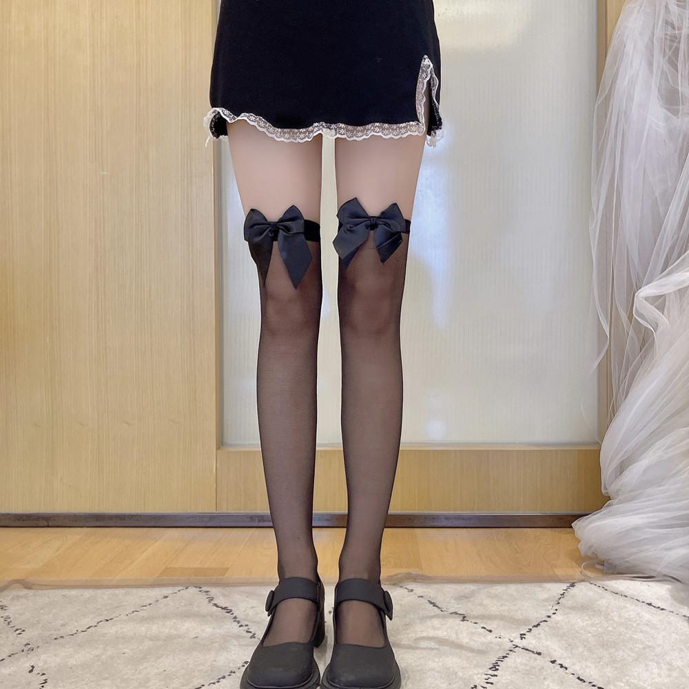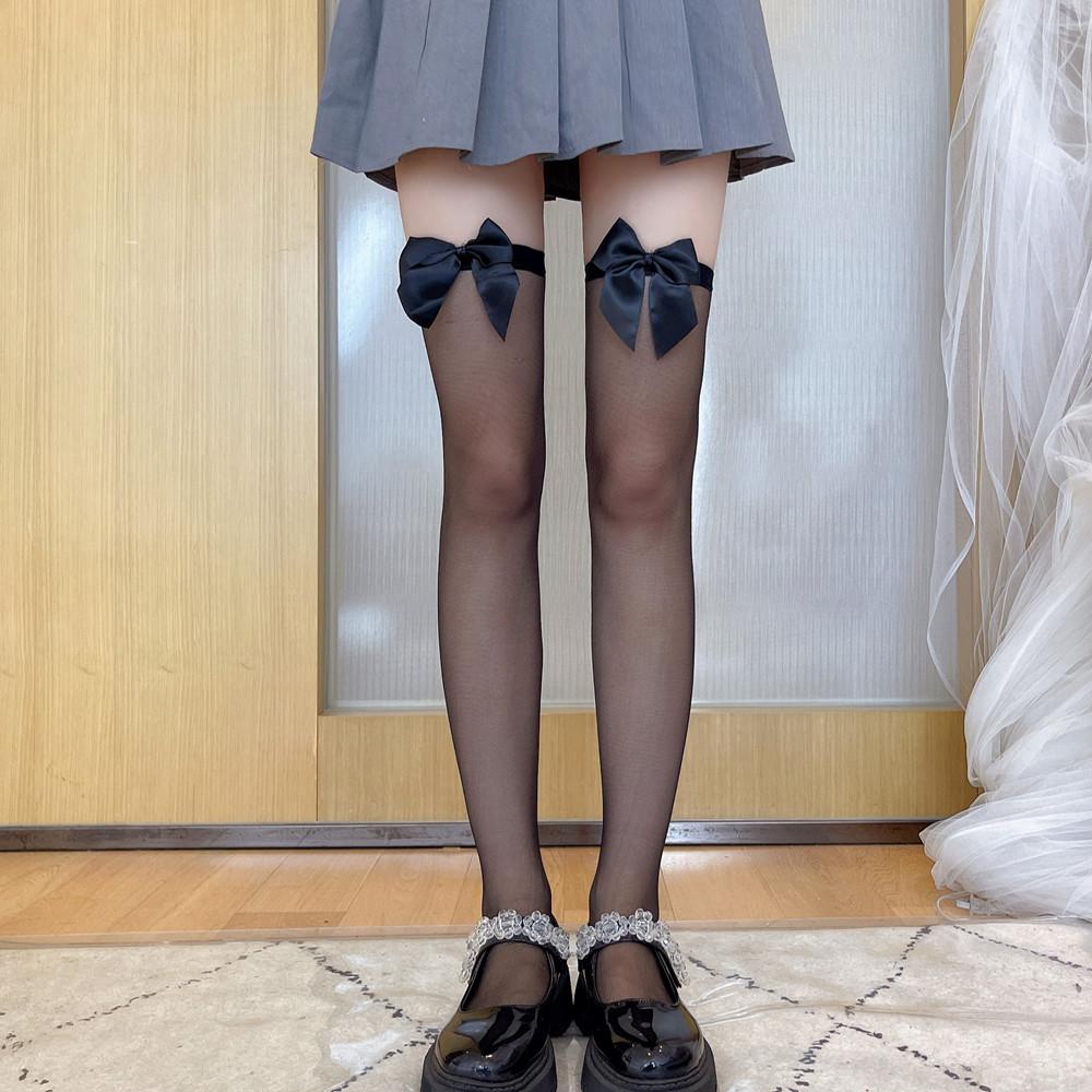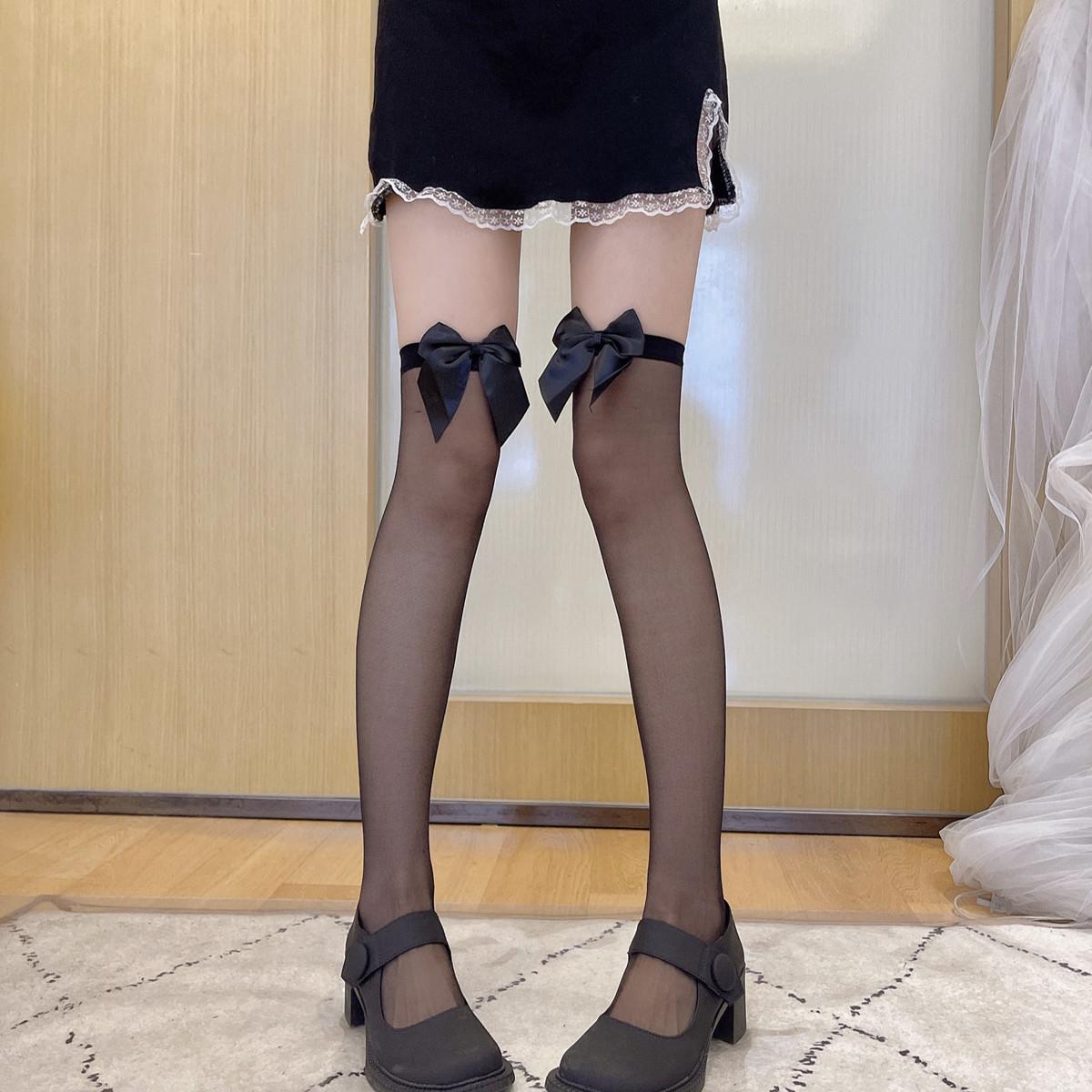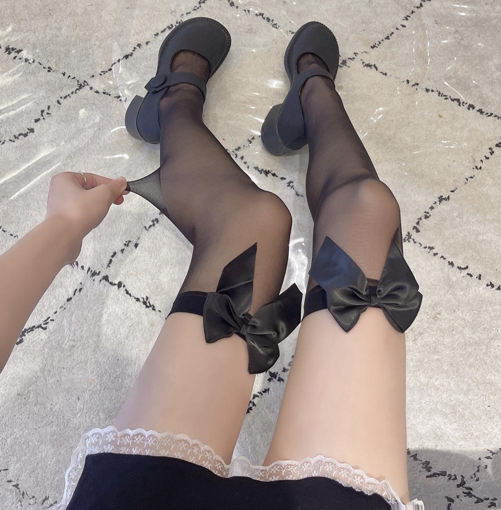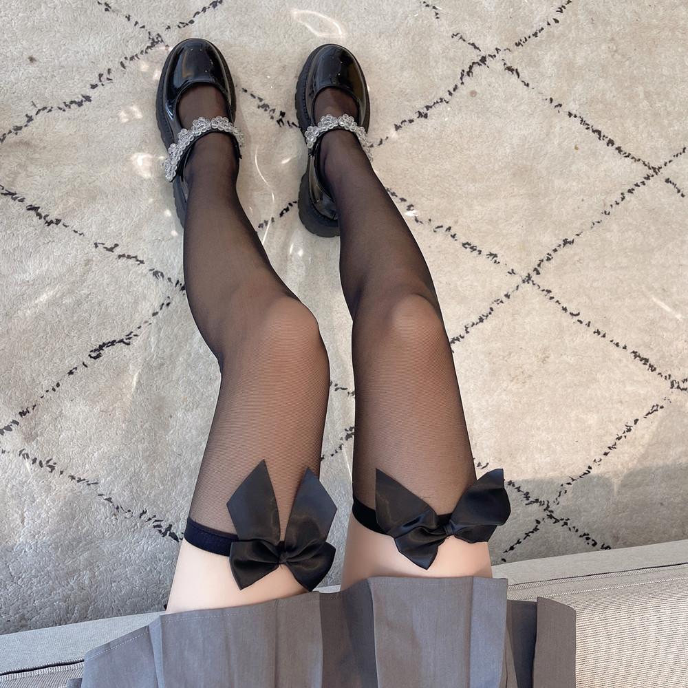 Medias altas de verano para mujer, estilo japonés, ultrafinas, de color sólido, con núcleo de seda hilado, de malla abullonada y lazo.