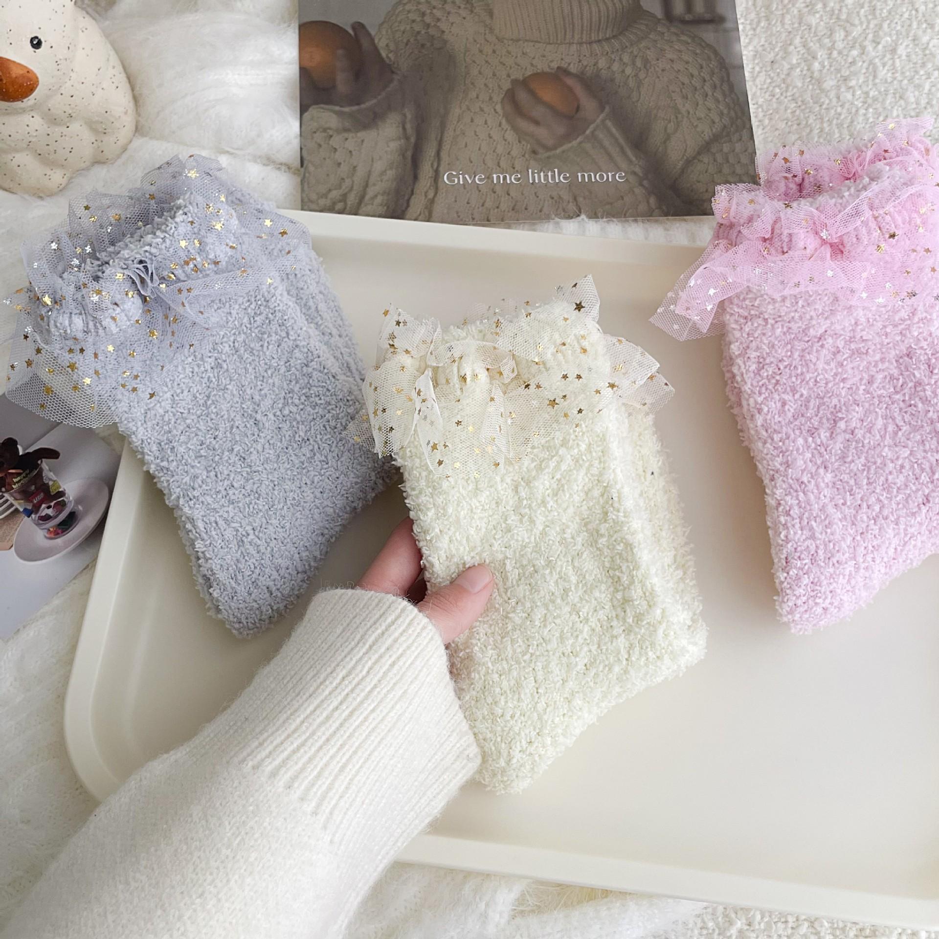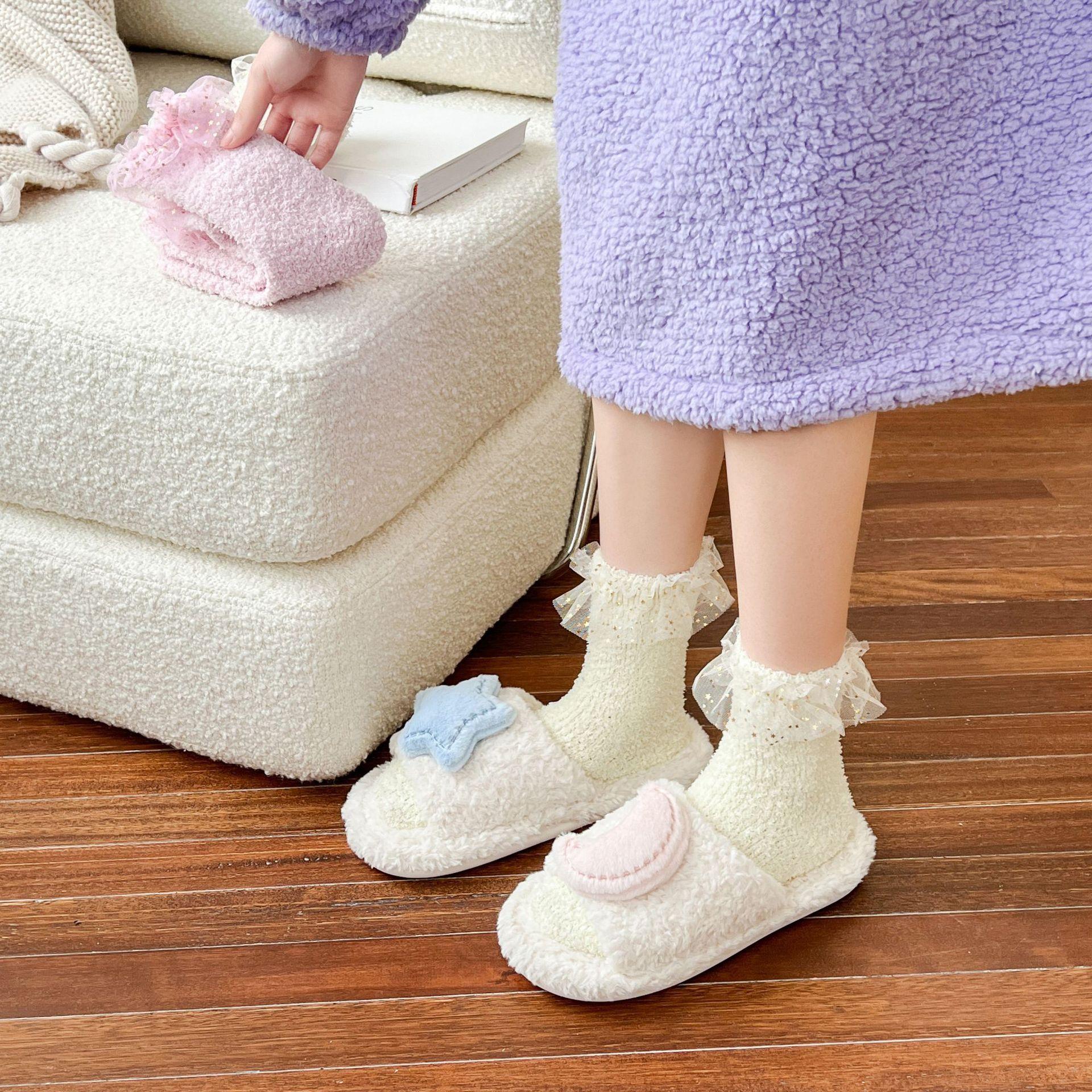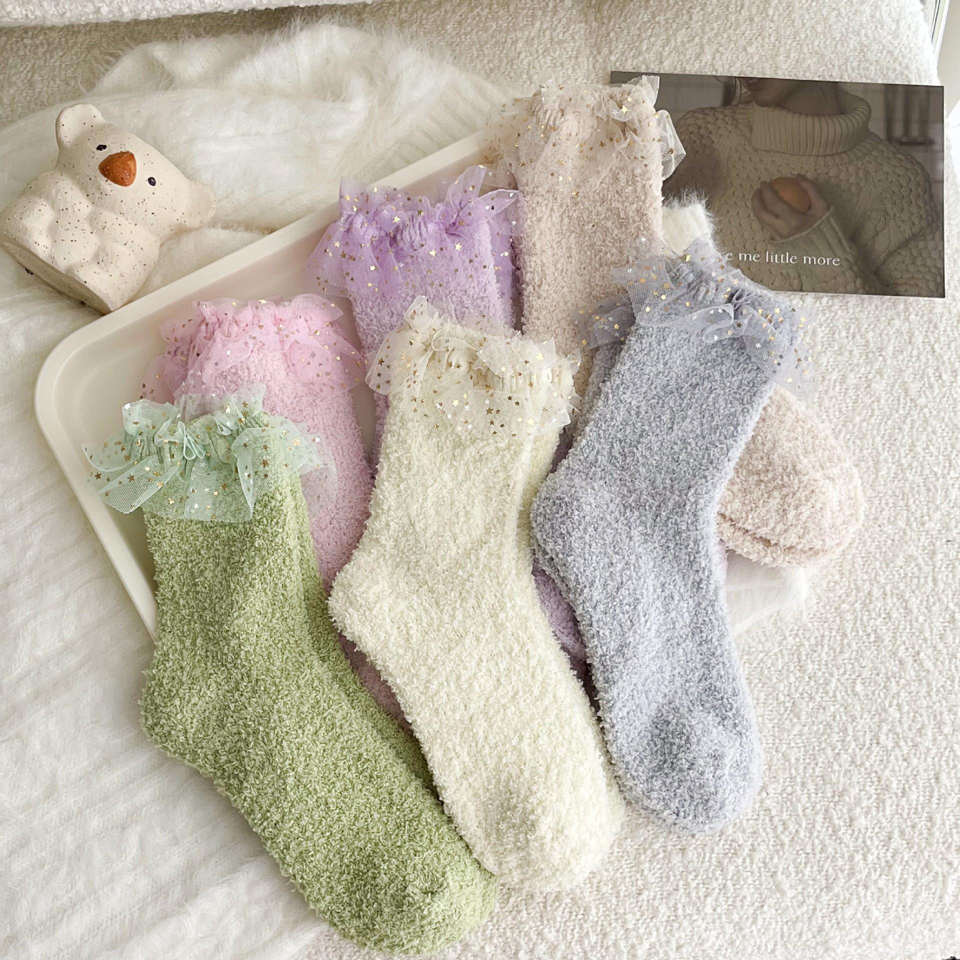Calcetines cálidos de invierno para mujer, de encaje, bonitos y bonitos, de forro polar coral, hasta la mitad de la pantorrilla, para el hogar, venta al por mayor