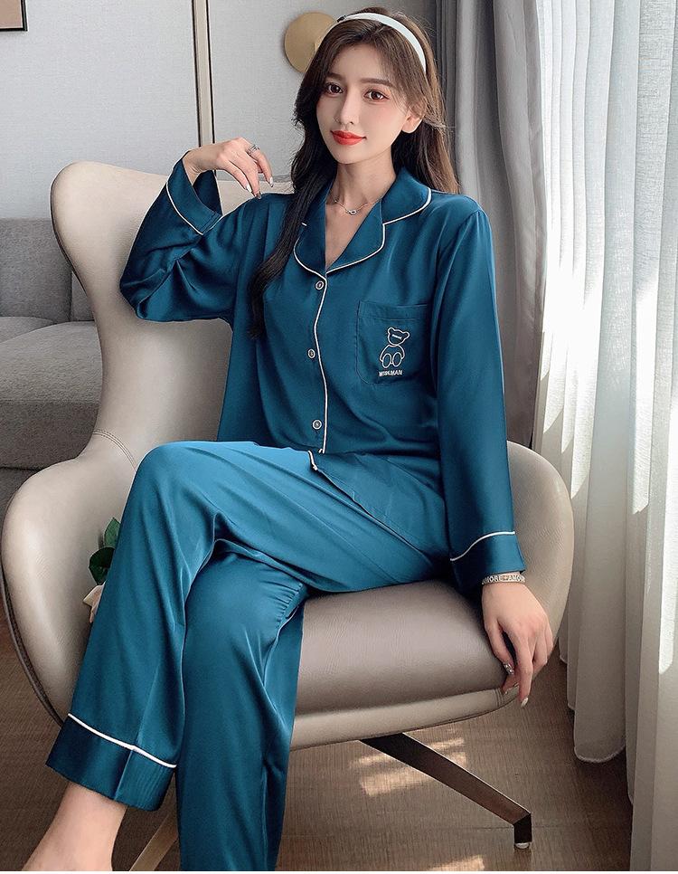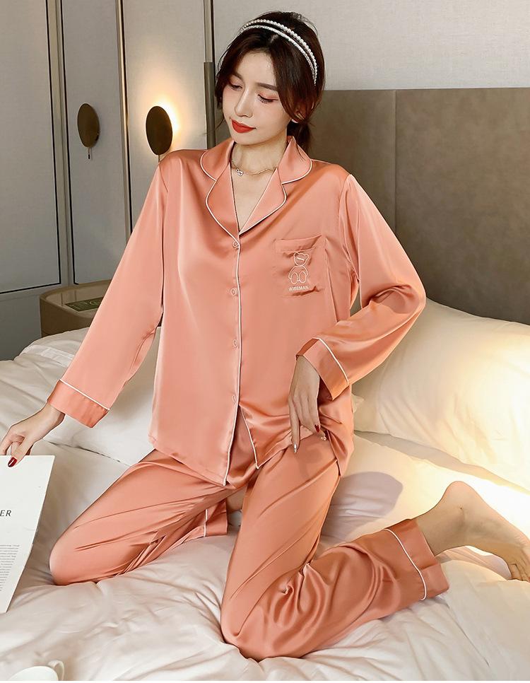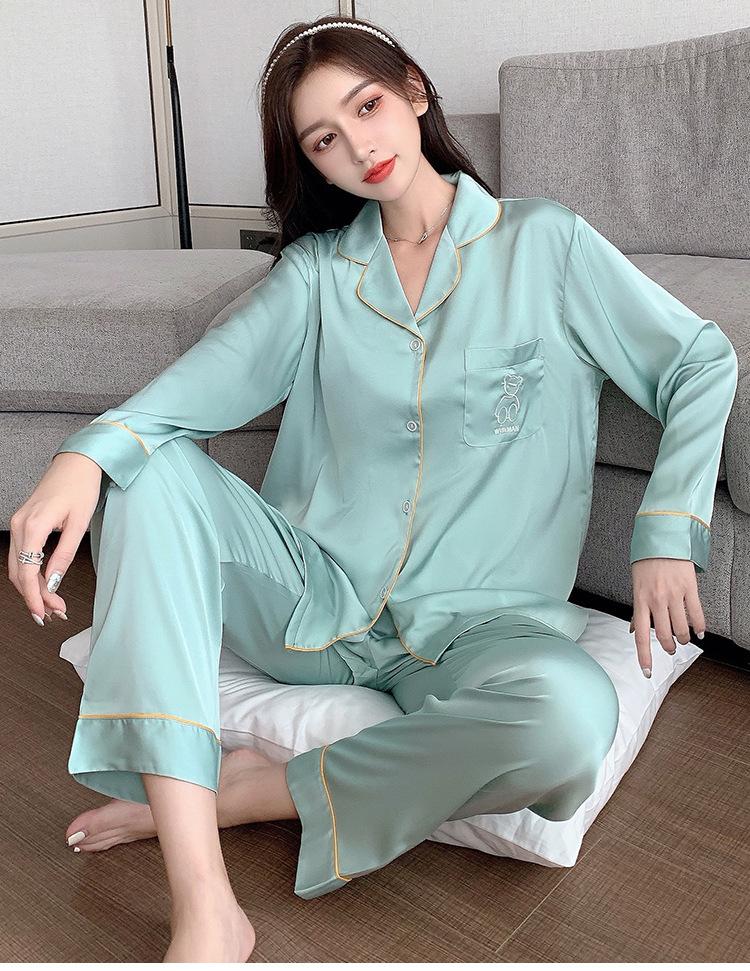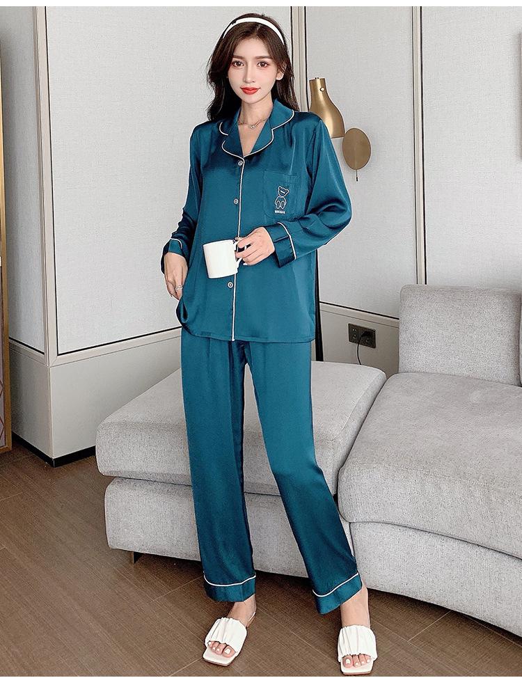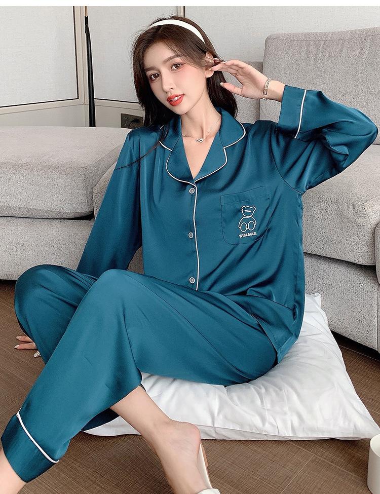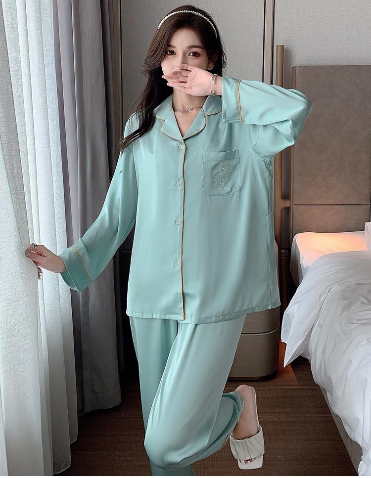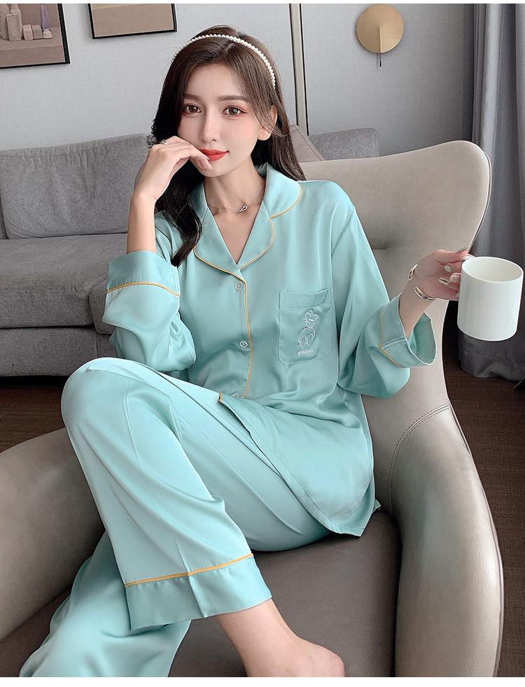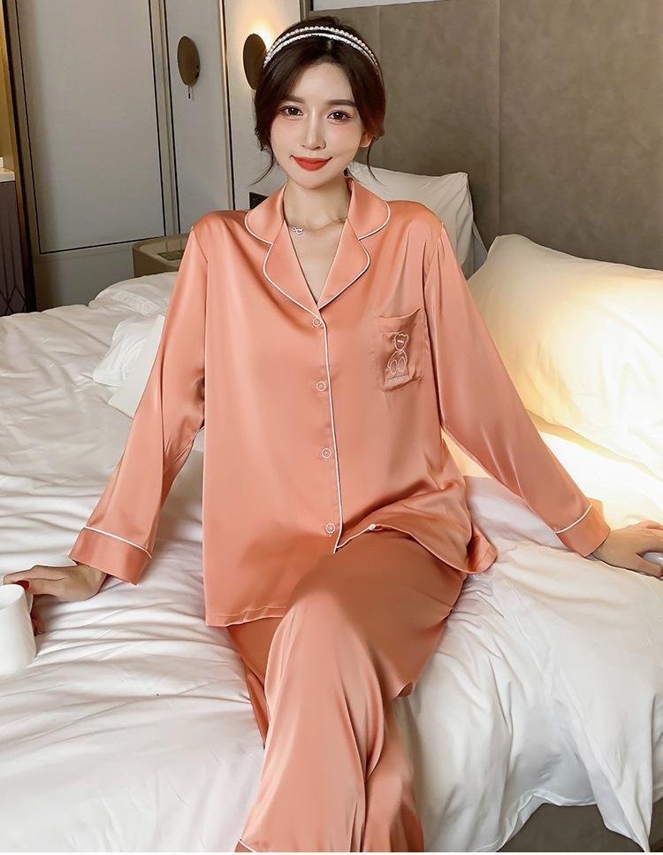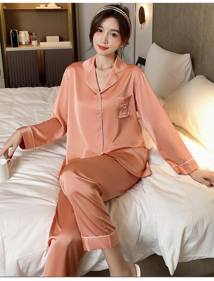 Pijamas de seda de hielo para mujer, ropa de casa de otoño, manga larga, color liso, traje de oso, ropa de casa de primavera y otoño para mujer.
