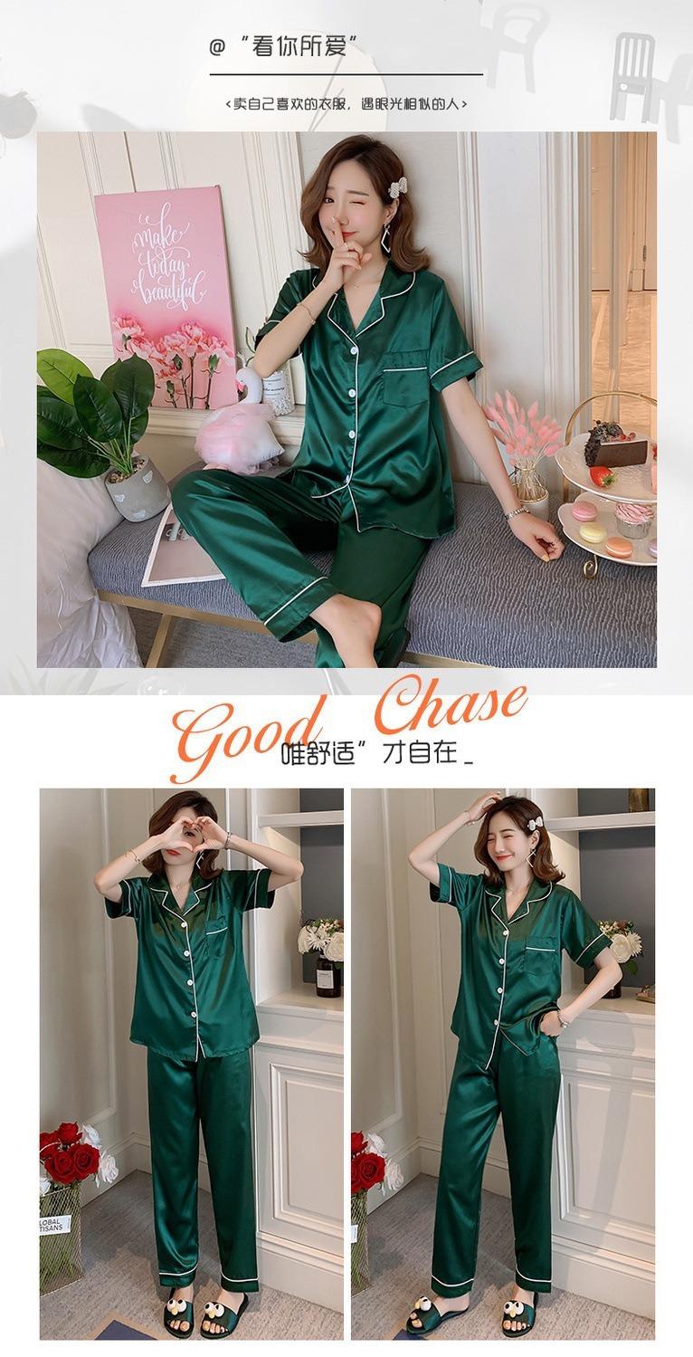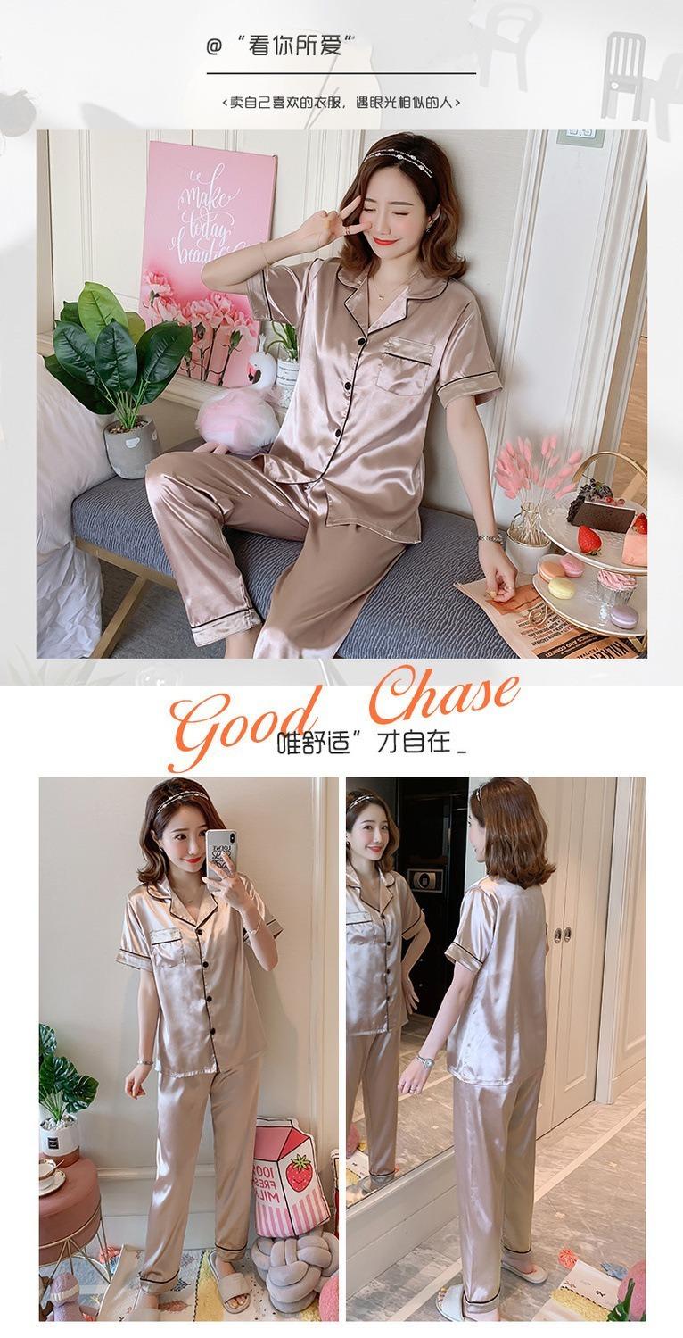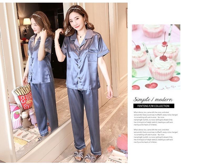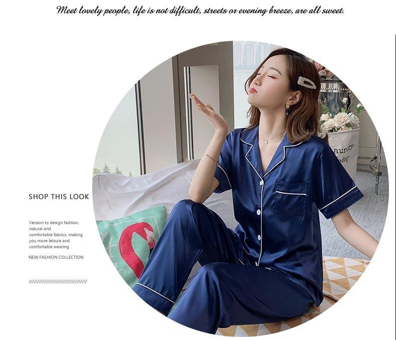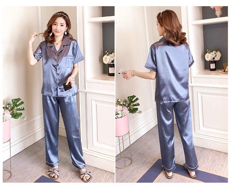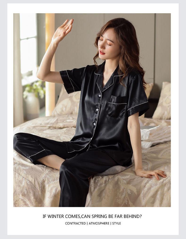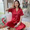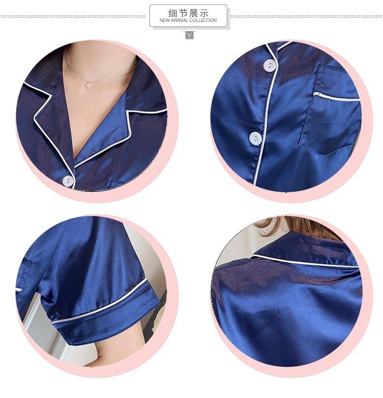 Pantalones de manga corta, cárdigan de verano de color liso con solapa de seda sintética, ropa de casa, pijama sencillo, traje de dos piezas para uso a largo plazo.