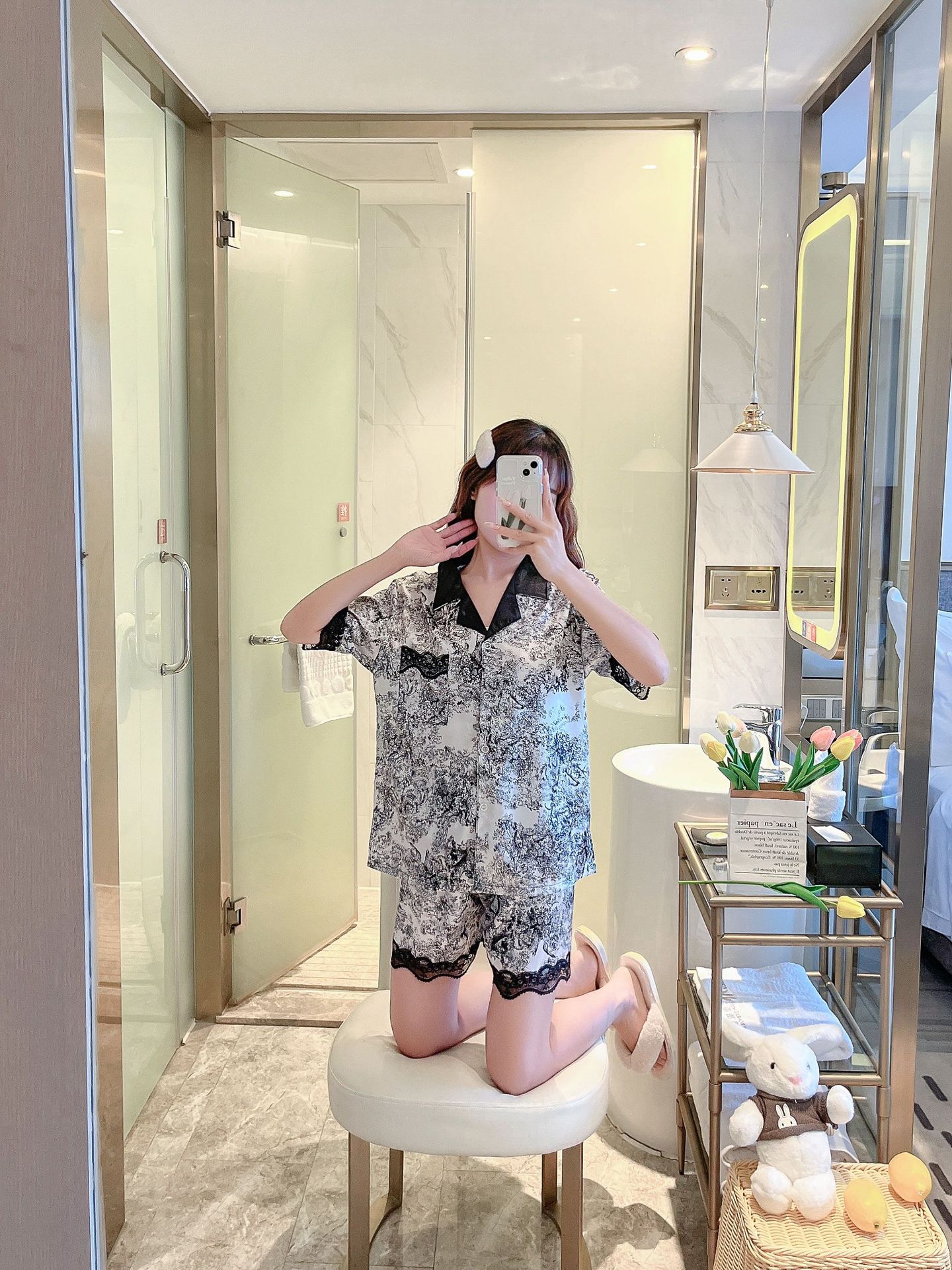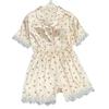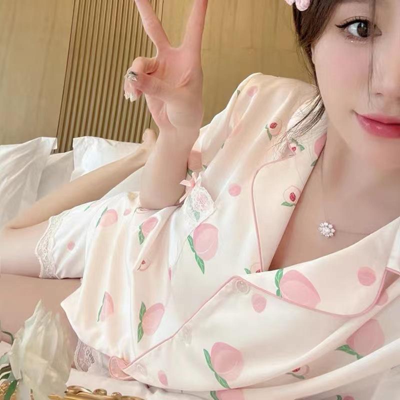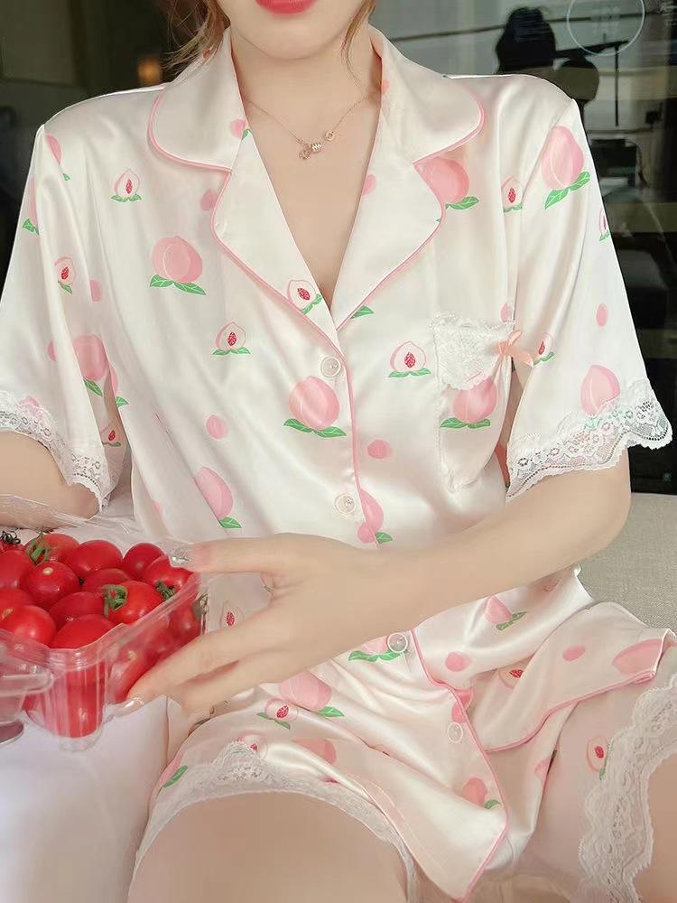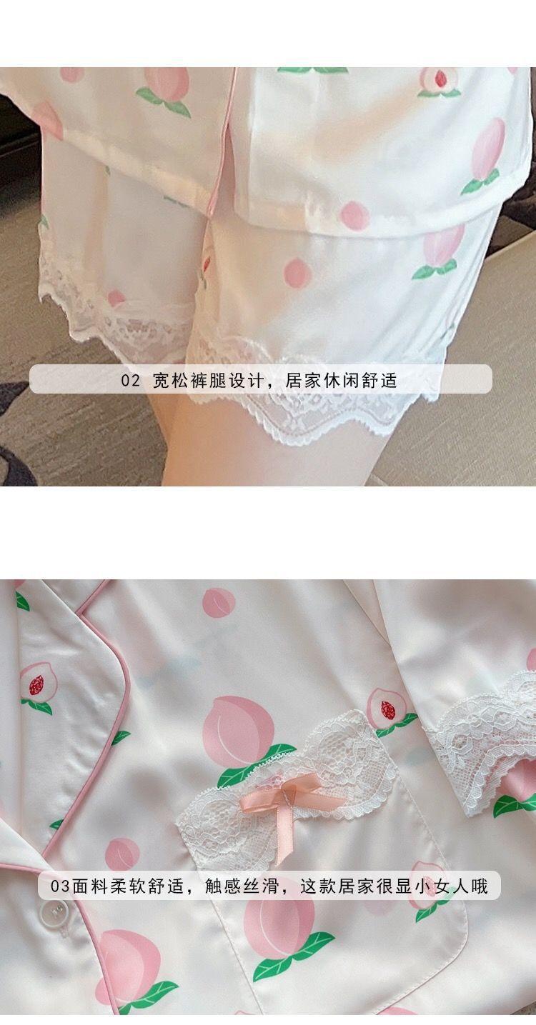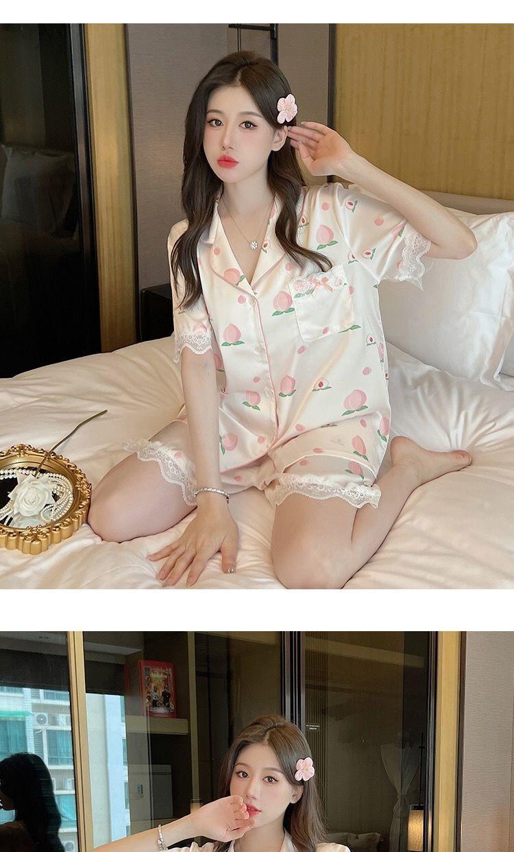 Pijama Nuevo y Fresco para Mujer, Conjunto de Ropa para el Hogar de Alta Gama de Manga Corta de Melocotón para Verano, Fino de Seda Imitación con Encaje