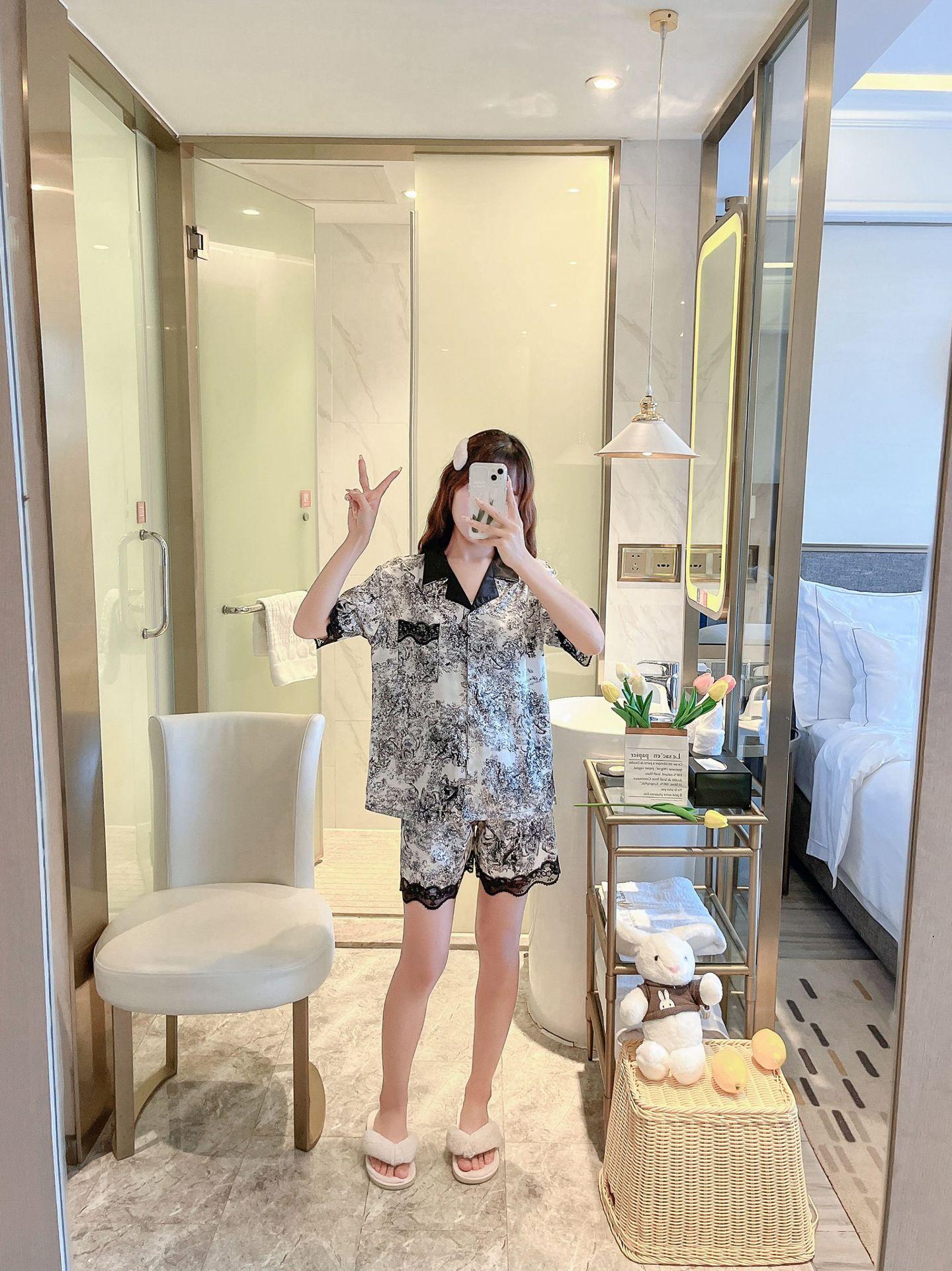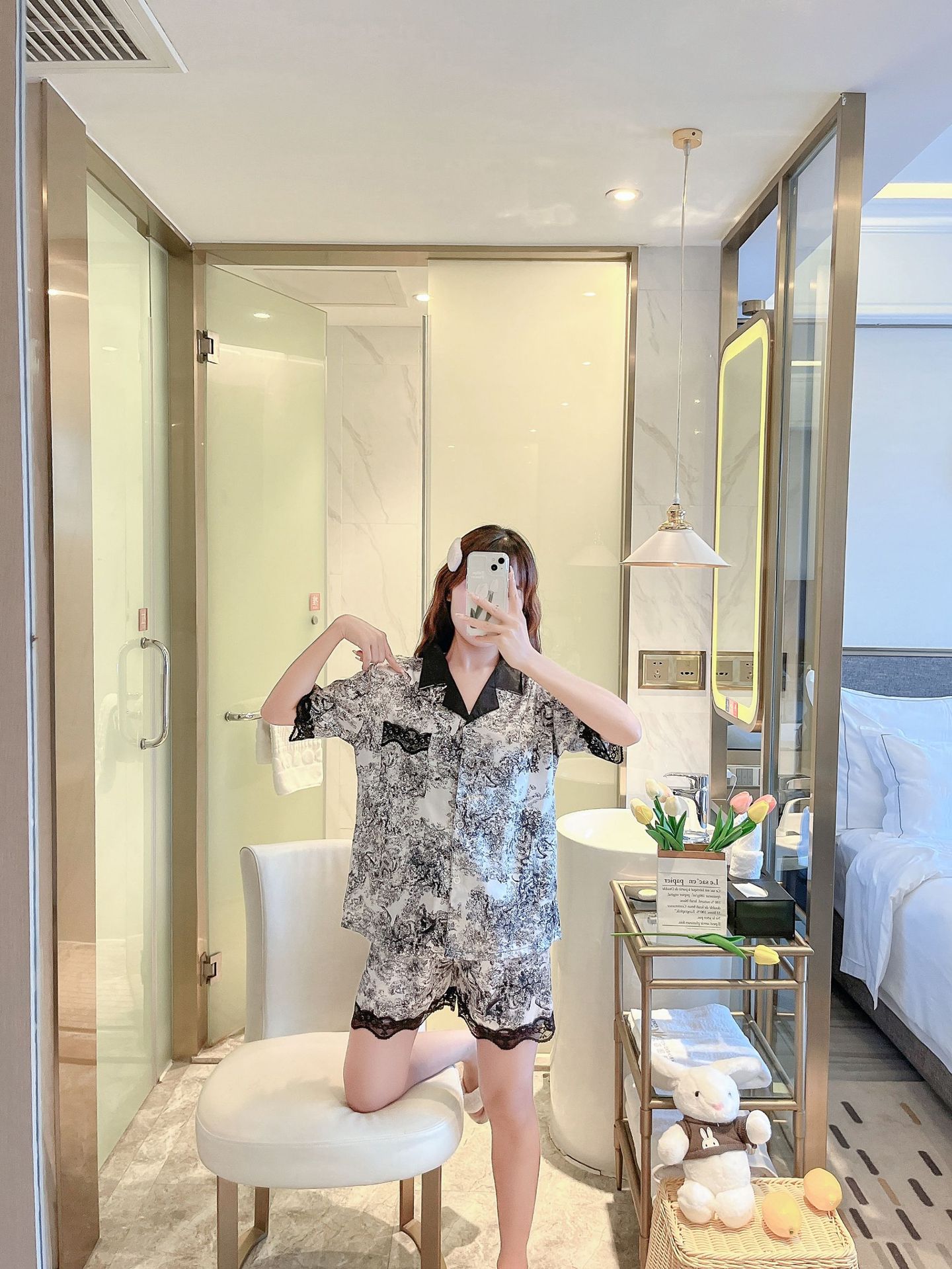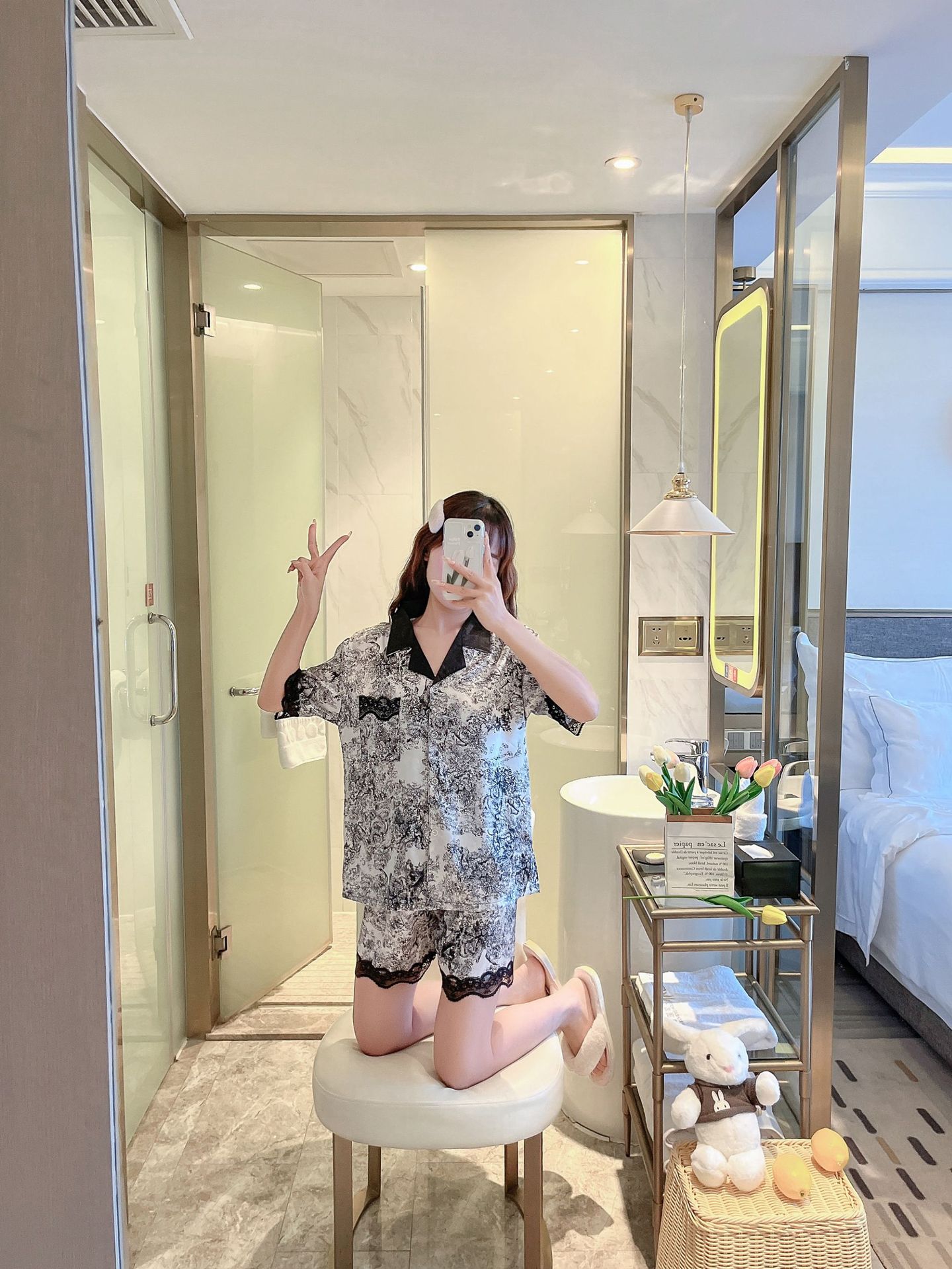 Pijama Nuevo y Fresco para Mujer, Conjunto de Ropa para el Hogar de Alta Gama de Manga Corta de Melocotón para Verano, Fino de Seda Imitación con Encaje