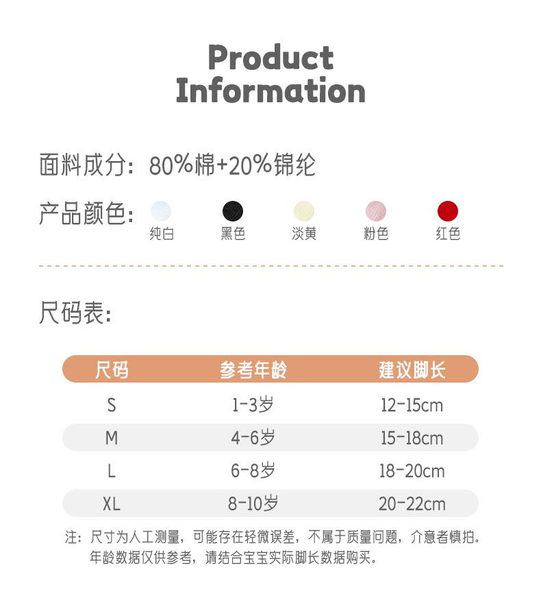 S(1-3 years old, 12-15cm), M(4-6 years old, 15-18cm), L(6-8 years old, 18-20cm), XL(8-10 years old, 20-22cm)