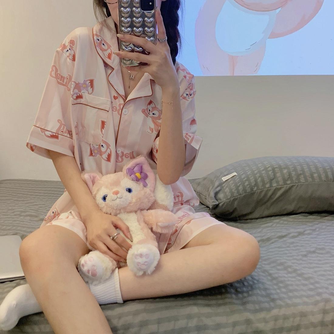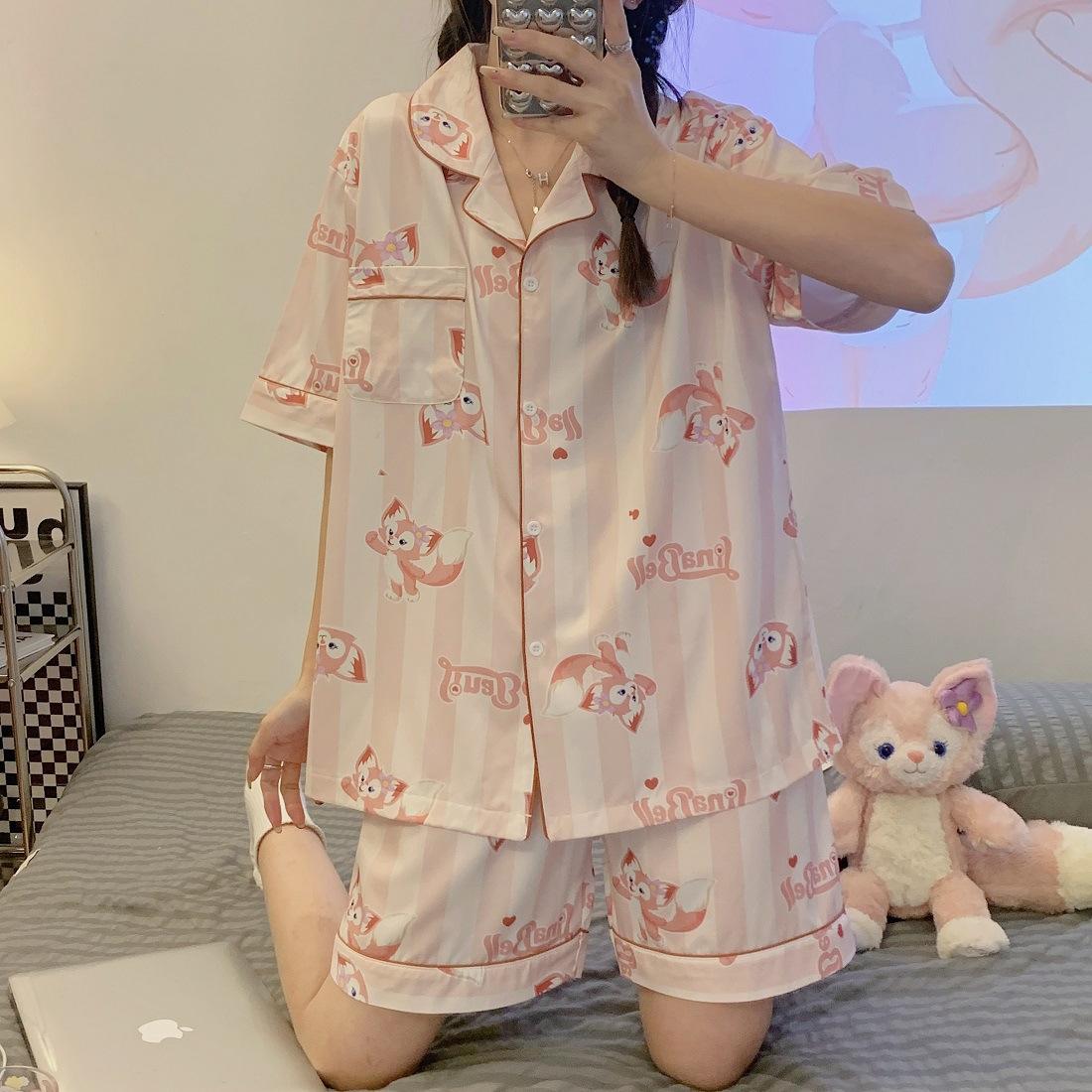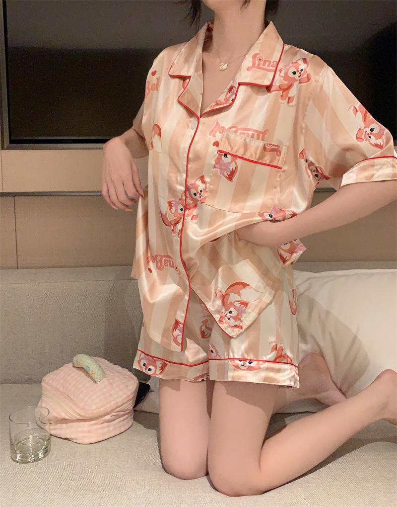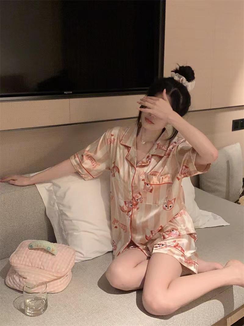 Verano 2024 Nuevo Pijama Fino de Seda de Hielo para Mujer Dibujo Animado Lindo Manga Corta Seda Simulada Conjunto de Ropa para el Hogar Venta al por Mayor