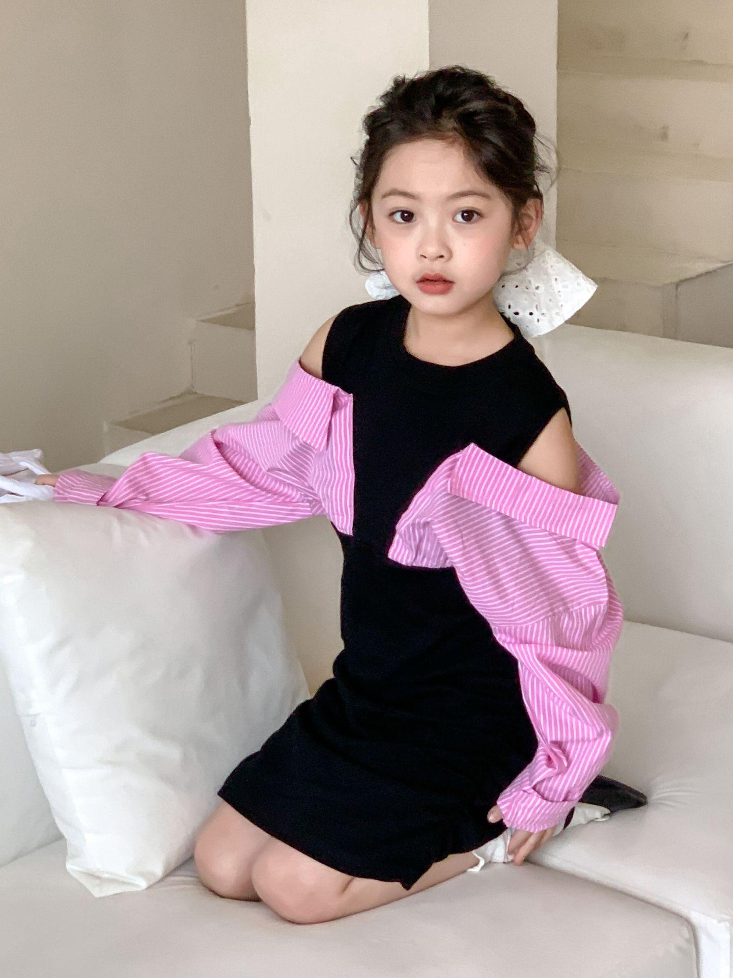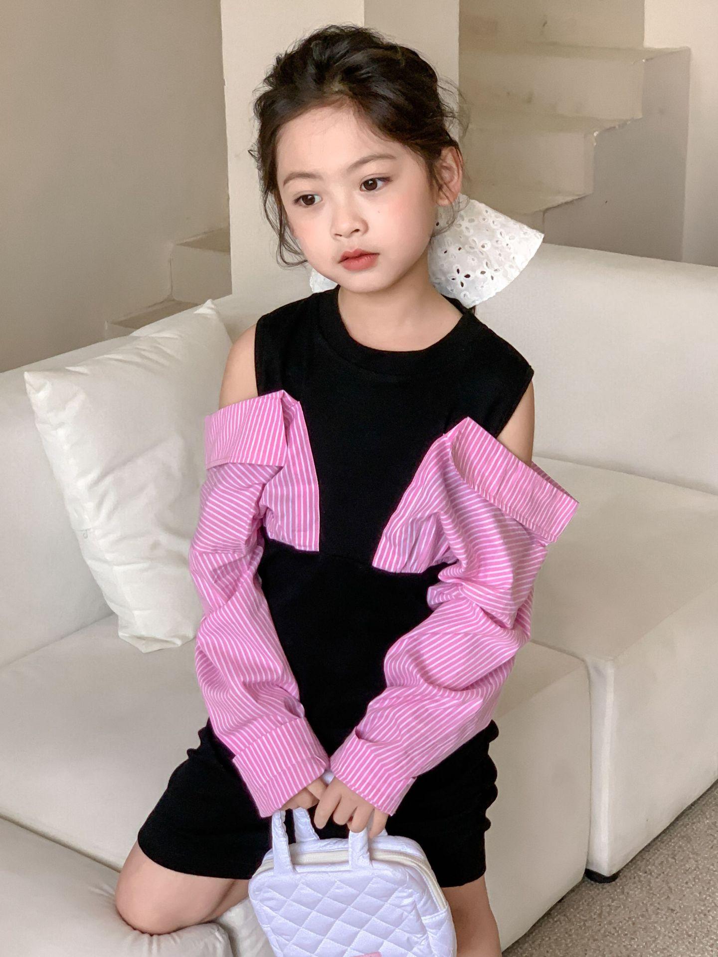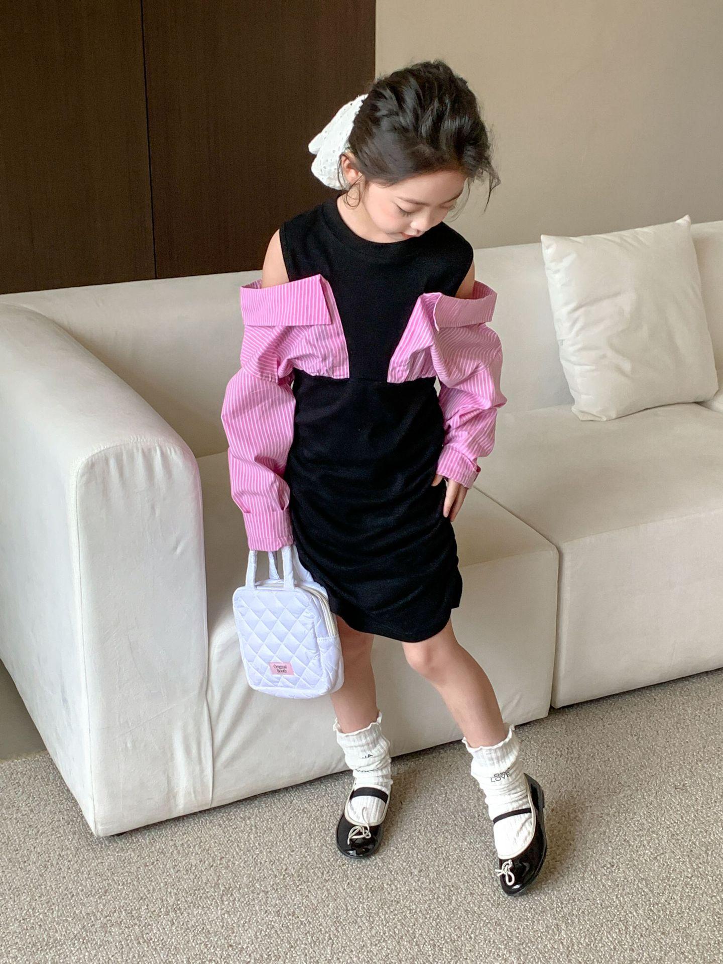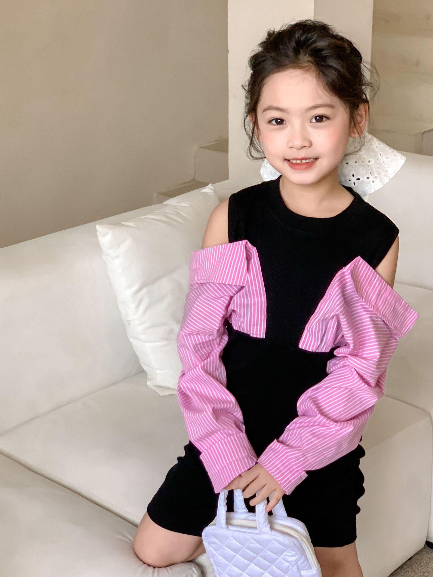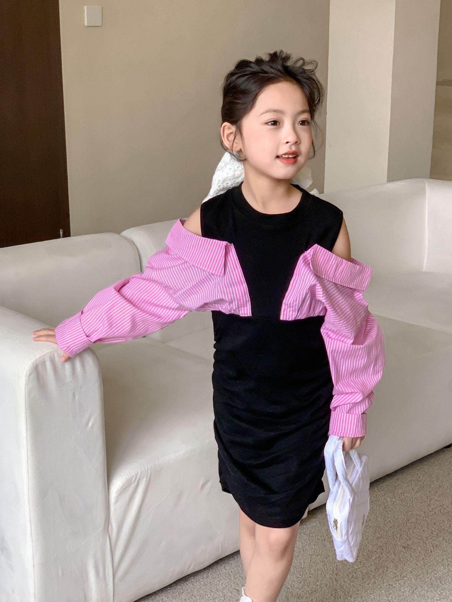 Falda infantil Primavera 2024 Vestido de dos piezas con hombros descubiertos para niña grande Vestido estilo Spice Girl con mangas camiseras