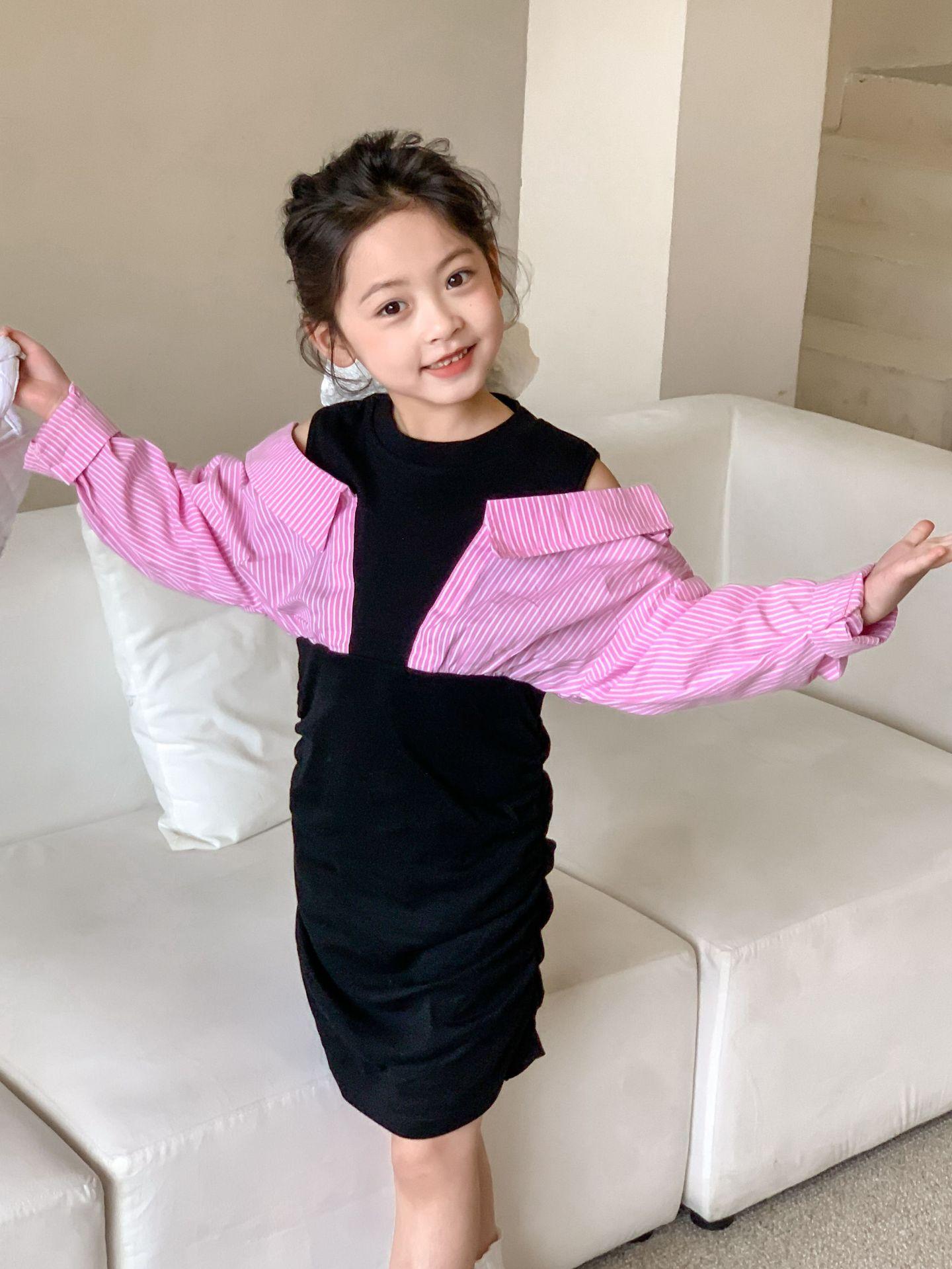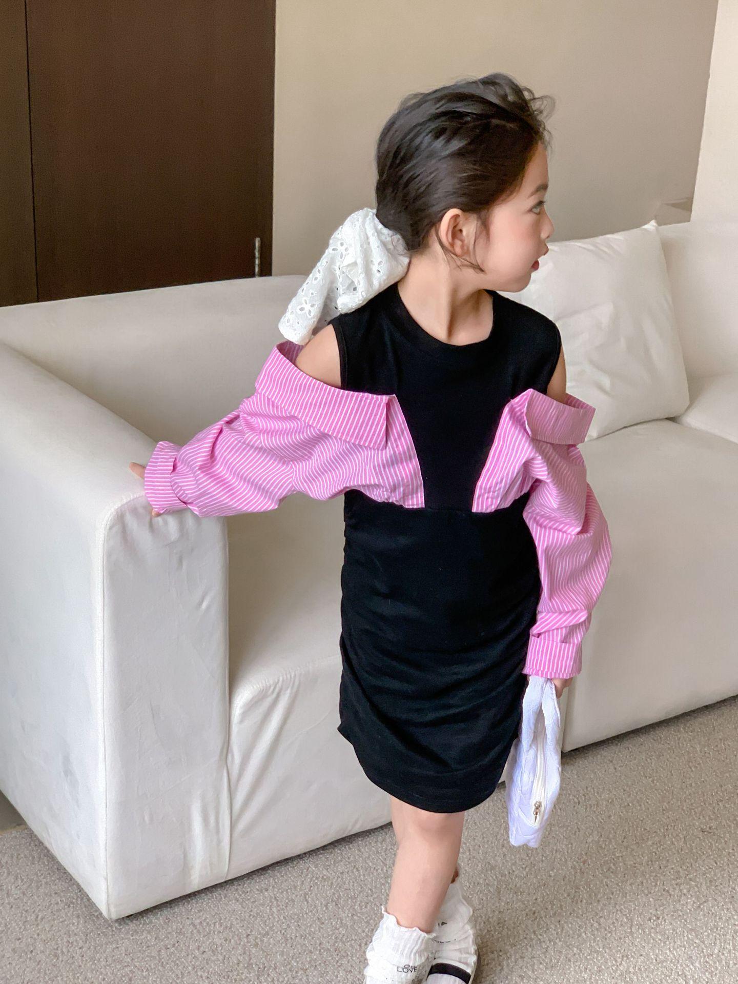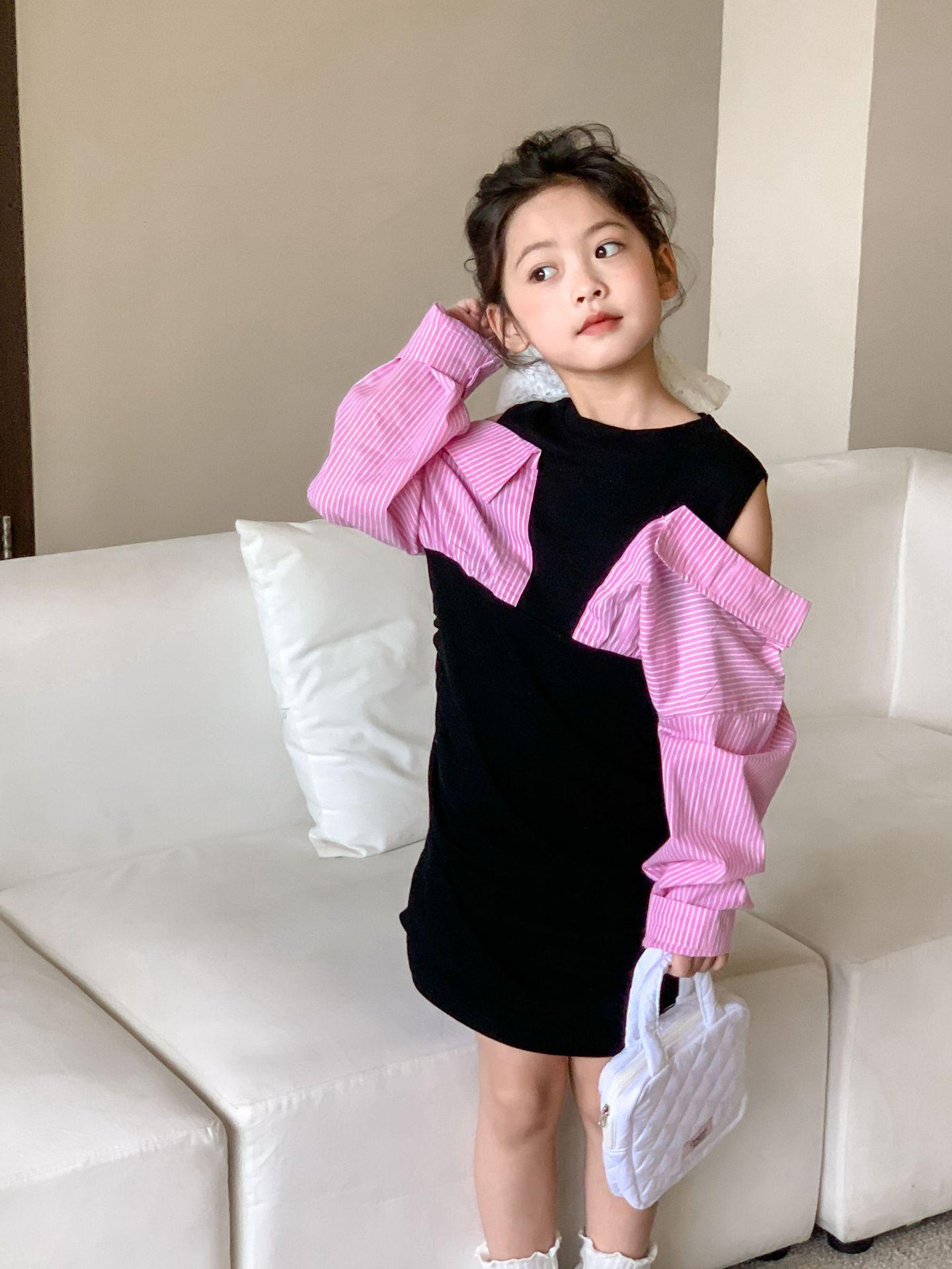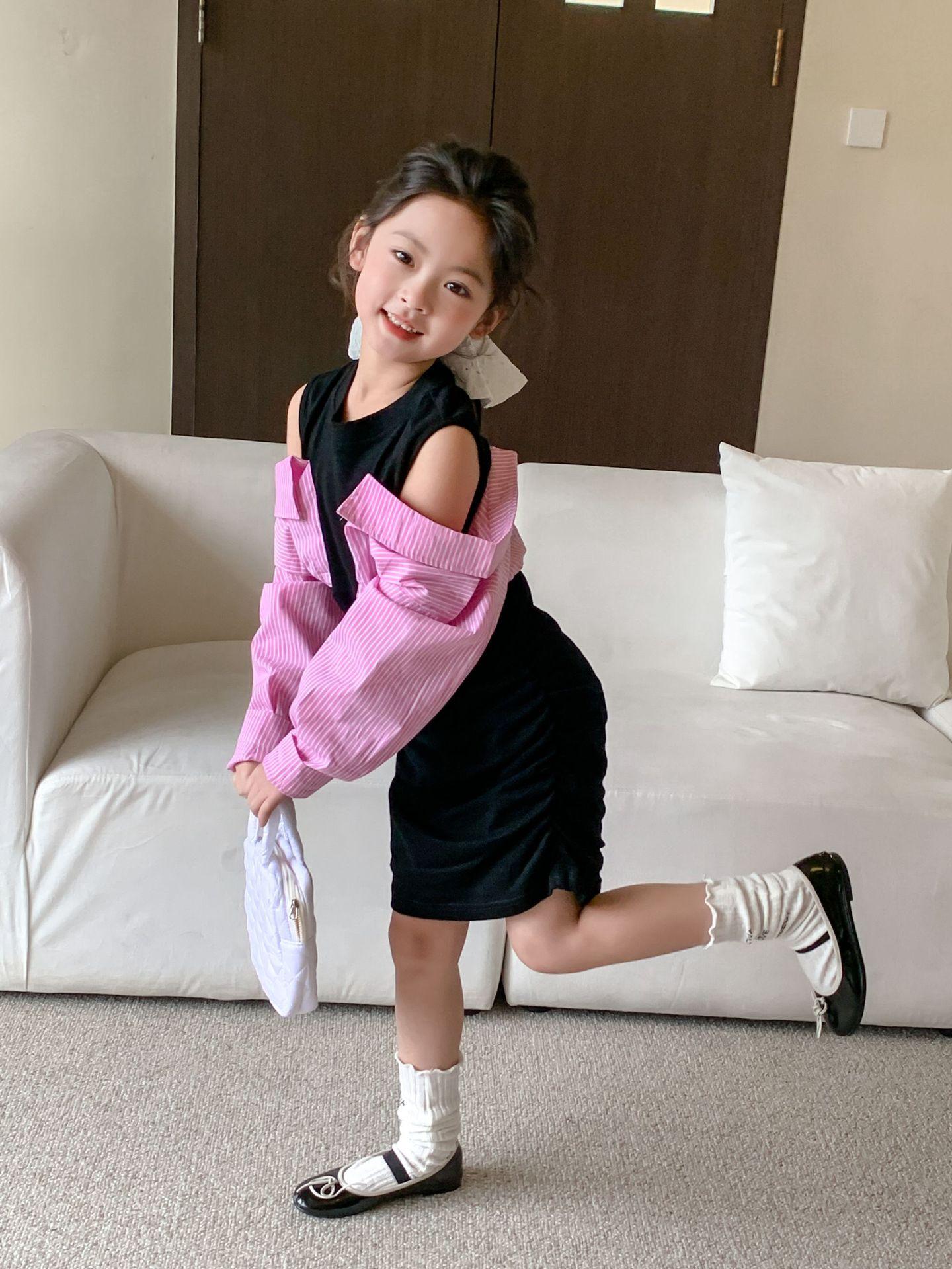 Falda infantil Primavera 2024 Vestido de dos piezas con hombros descubiertos para niña grande Vestido estilo Spice Girl con mangas camiseras