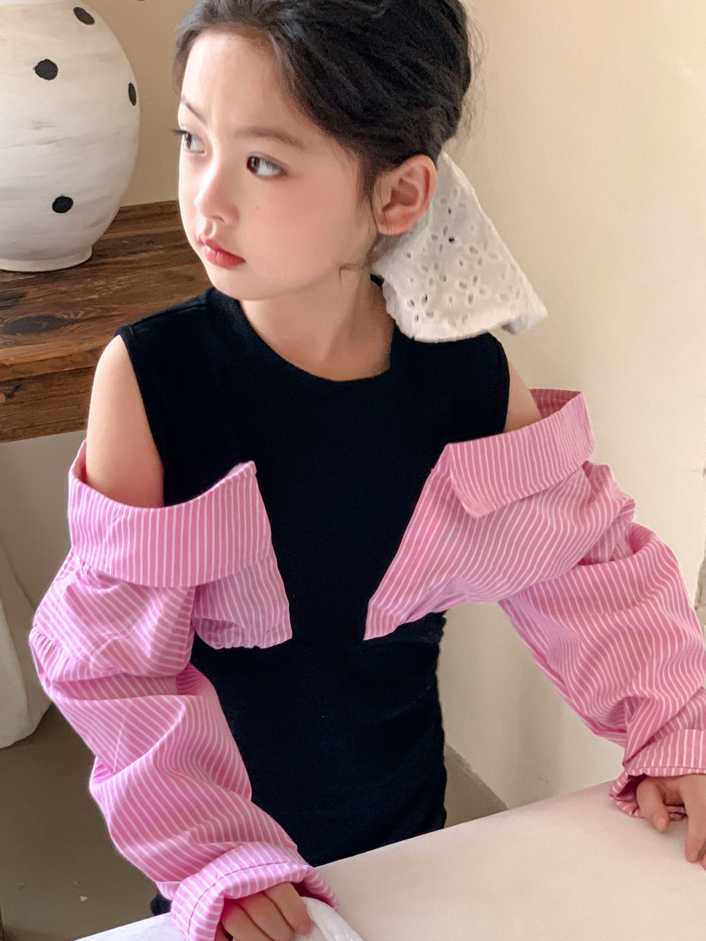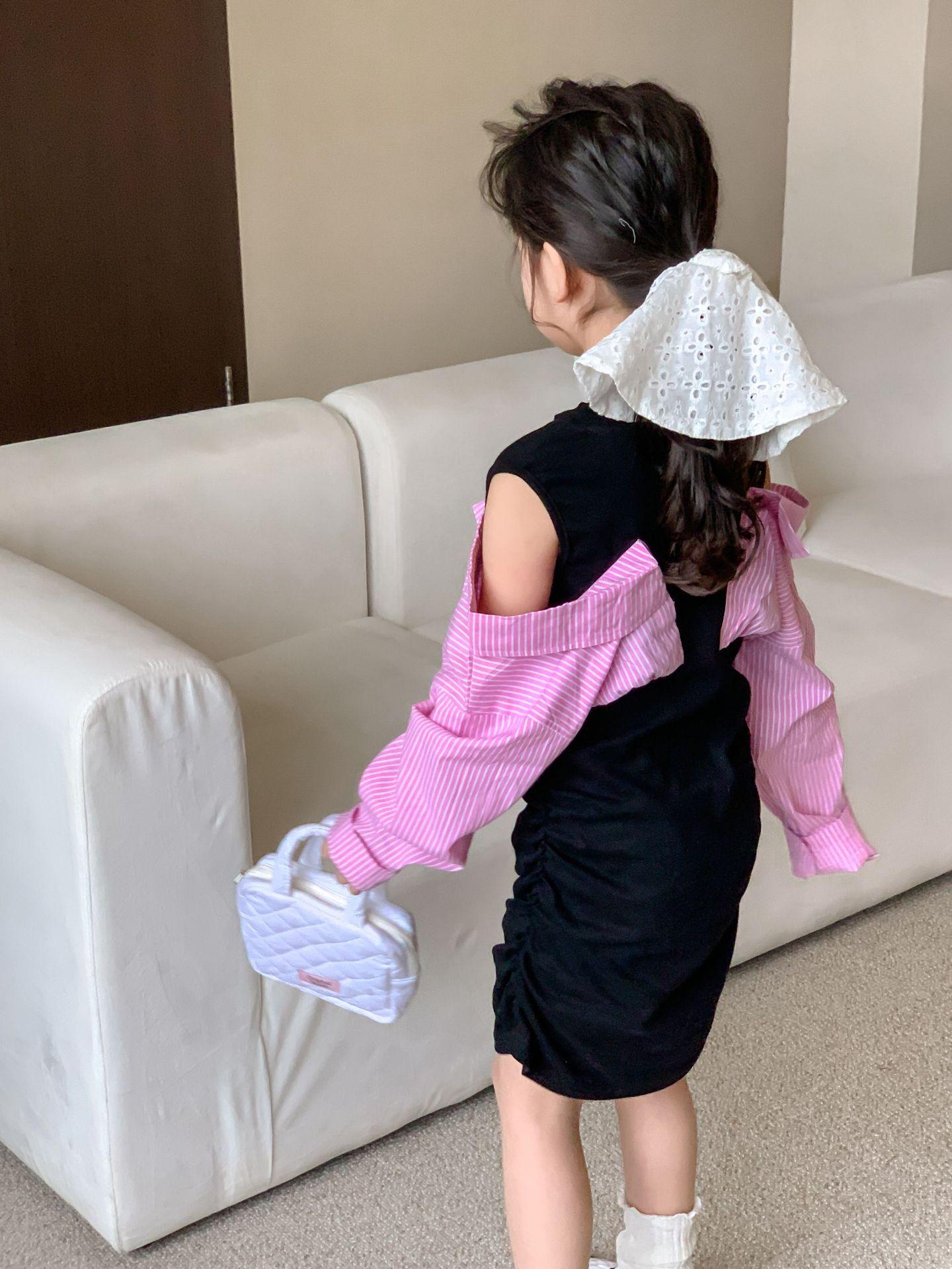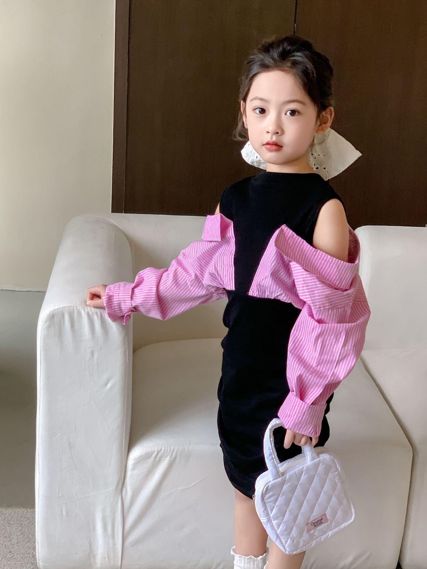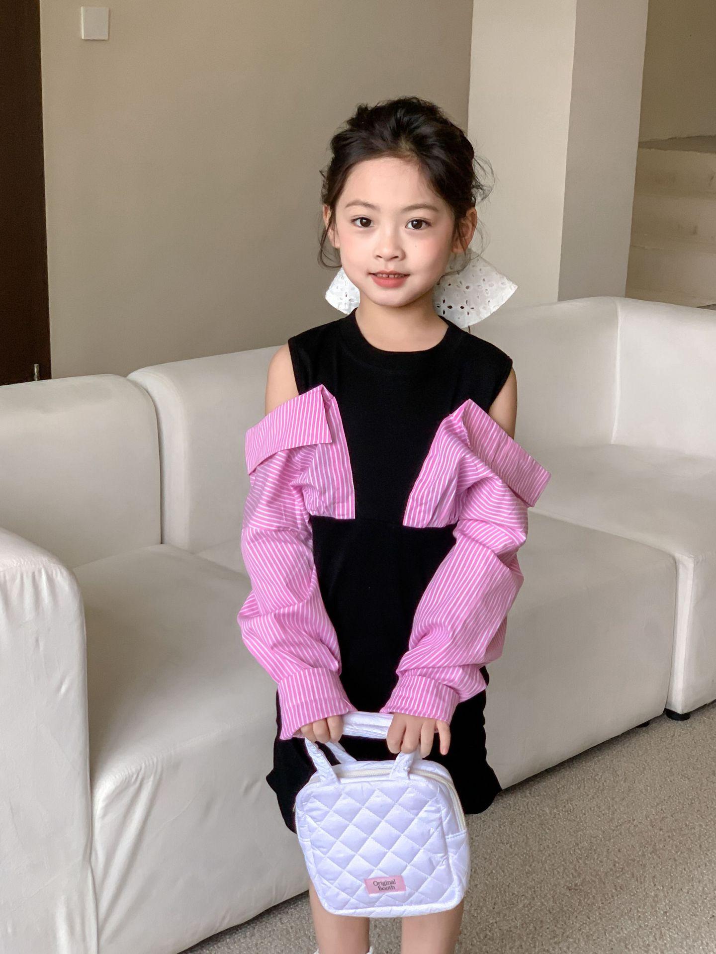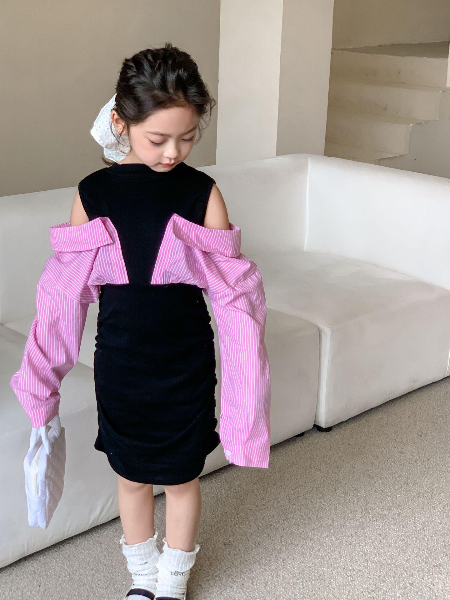 Falda infantil Primavera 2024 Vestido de dos piezas con hombros descubiertos para niña grande Vestido estilo Spice Girl con mangas camiseras