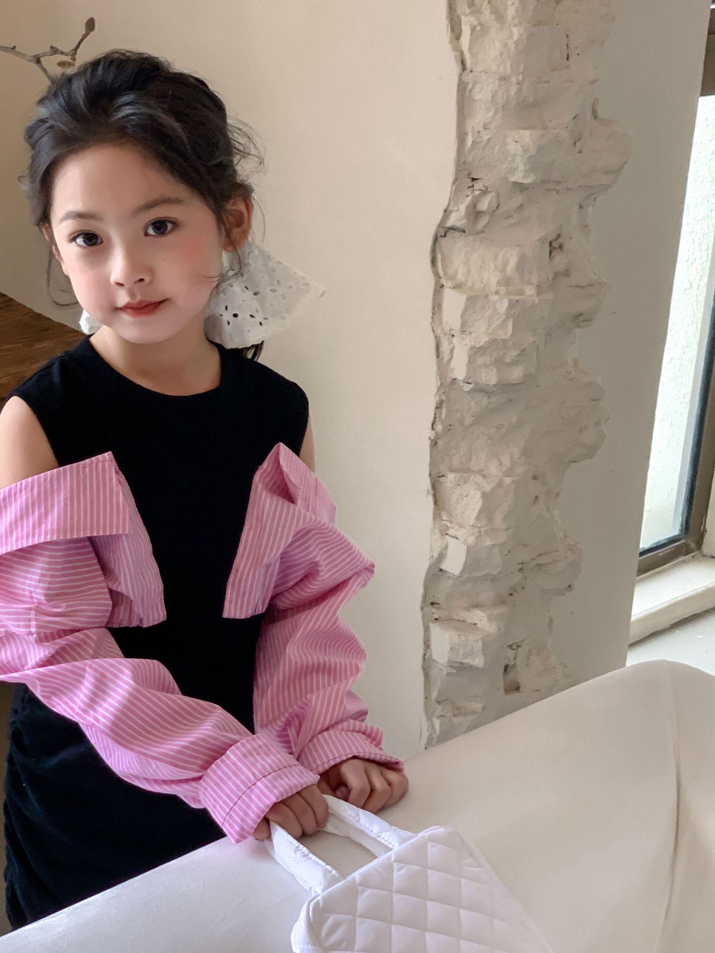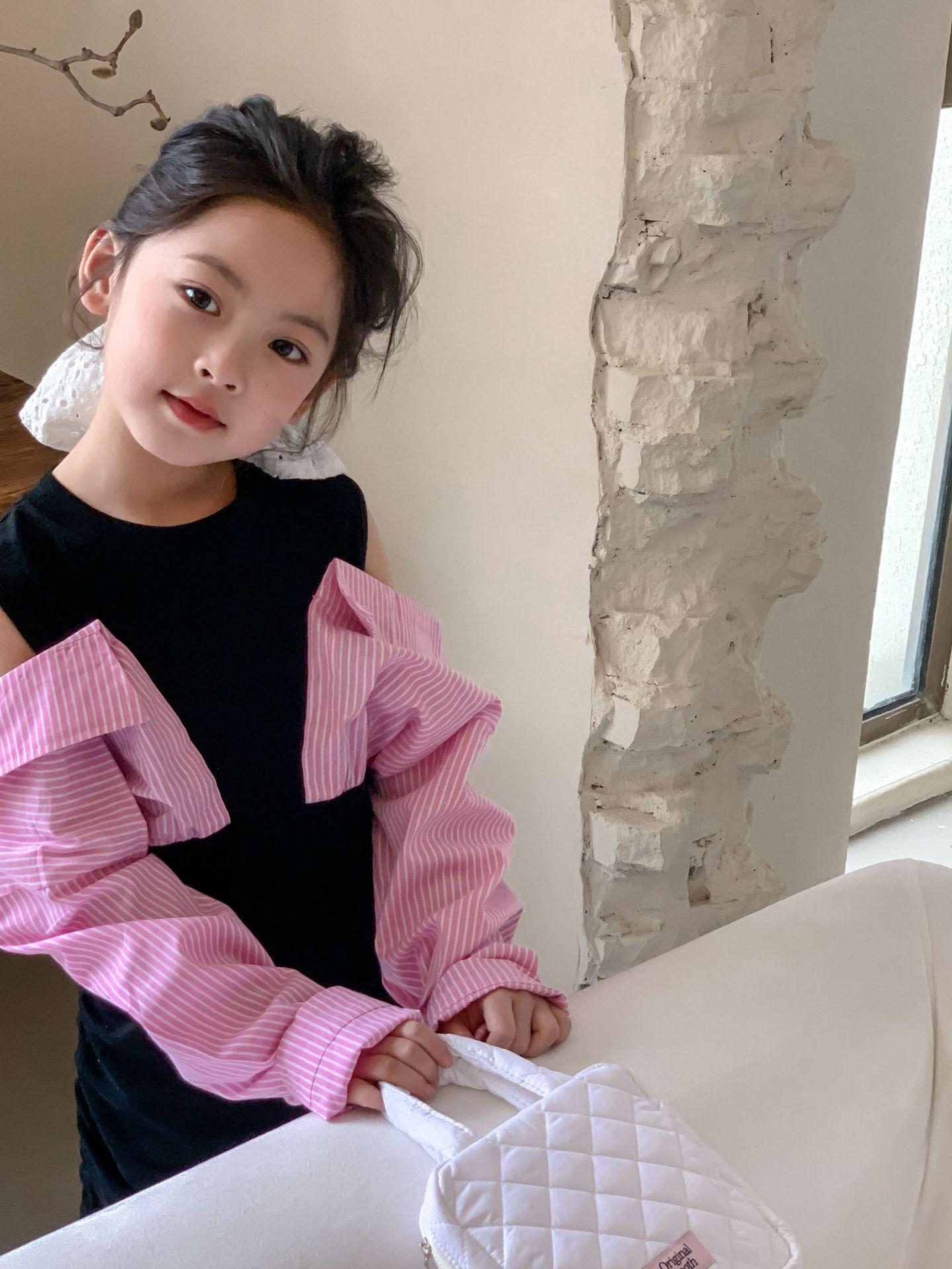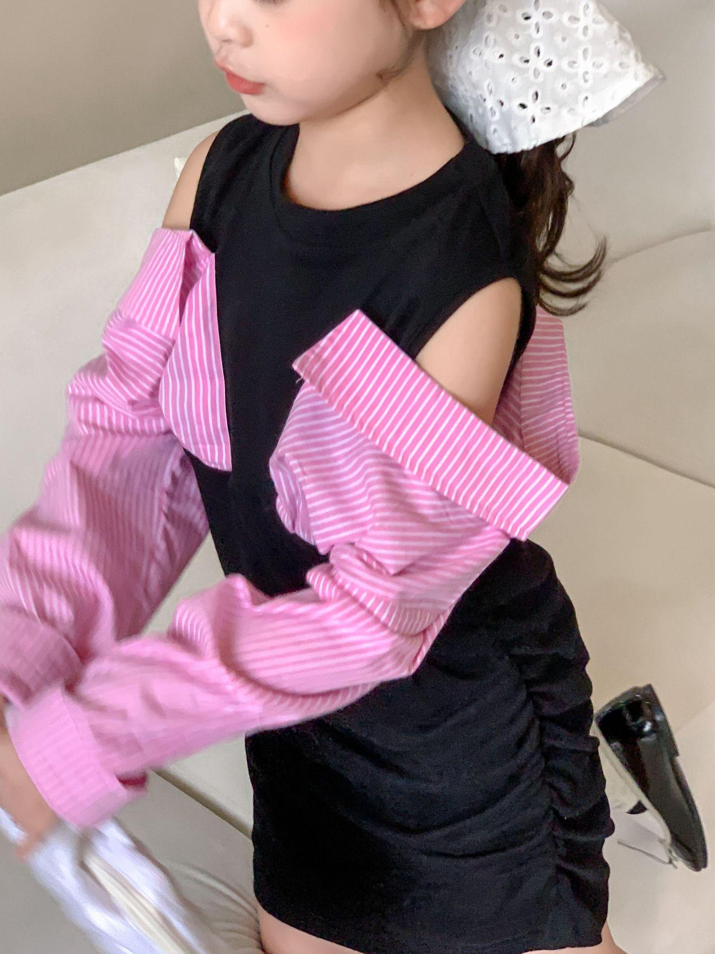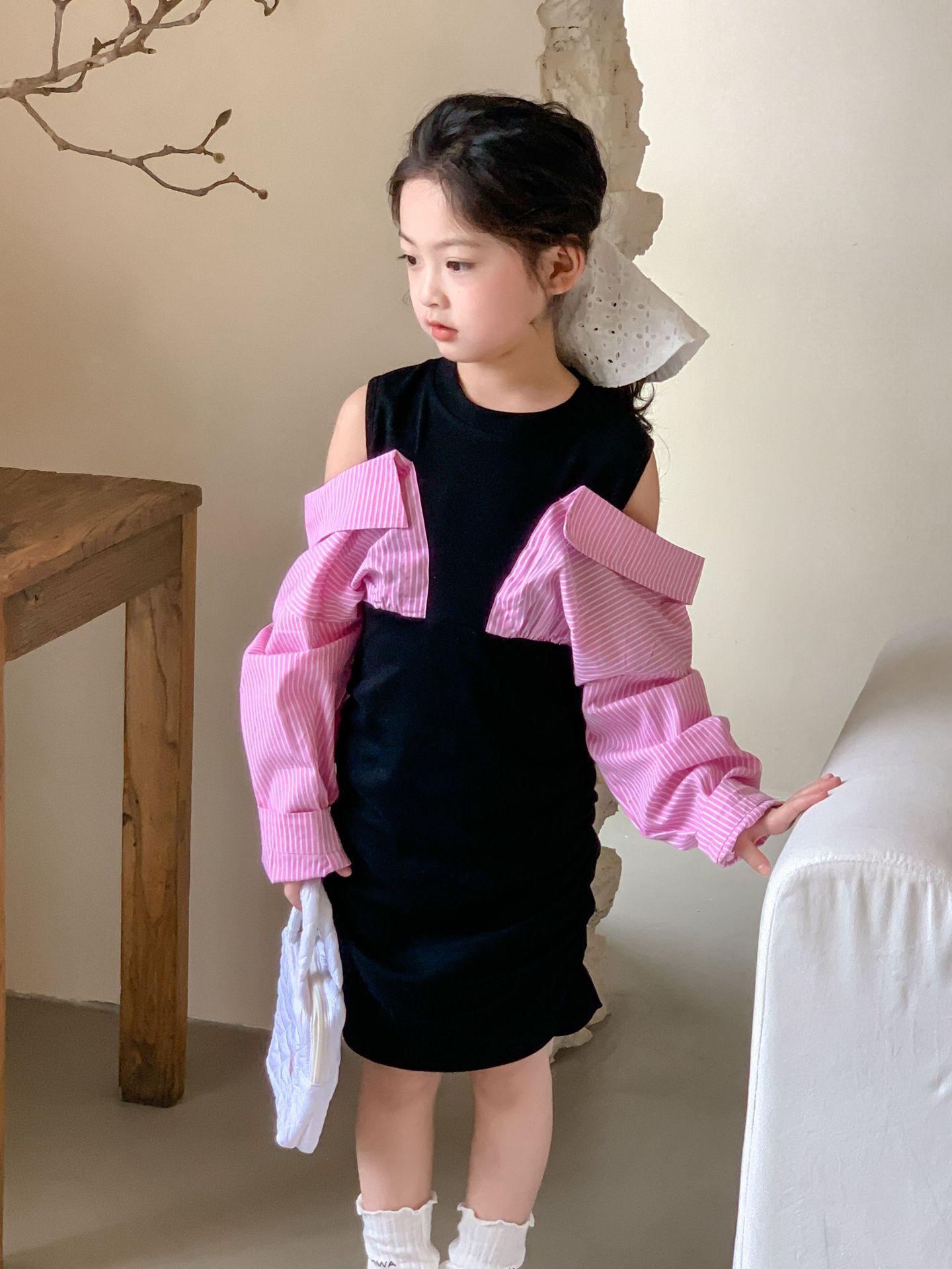 Falda infantil Primavera 2024 Vestido de dos piezas con hombros descubiertos para niña grande Vestido estilo Spice Girl con mangas camiseras