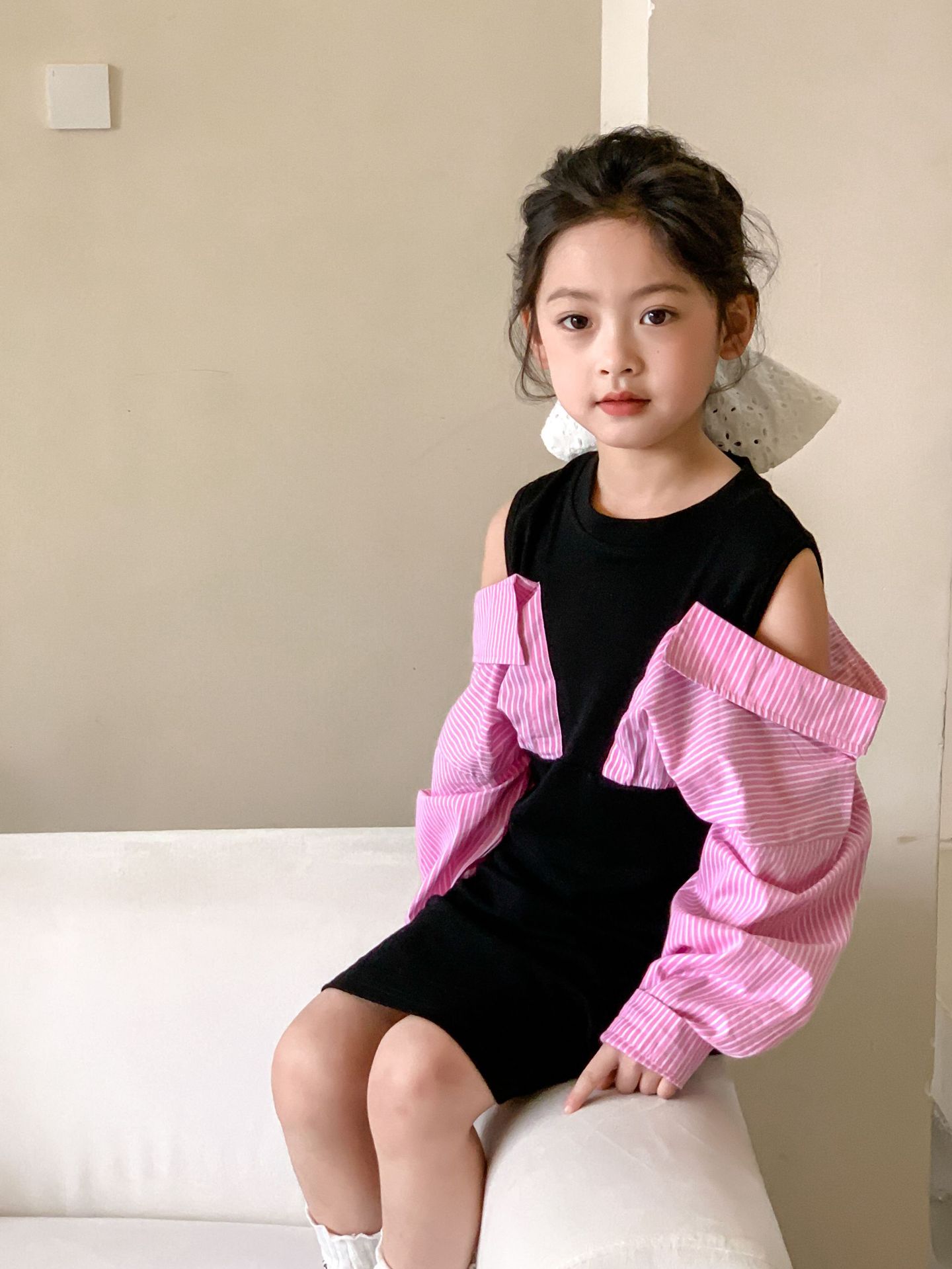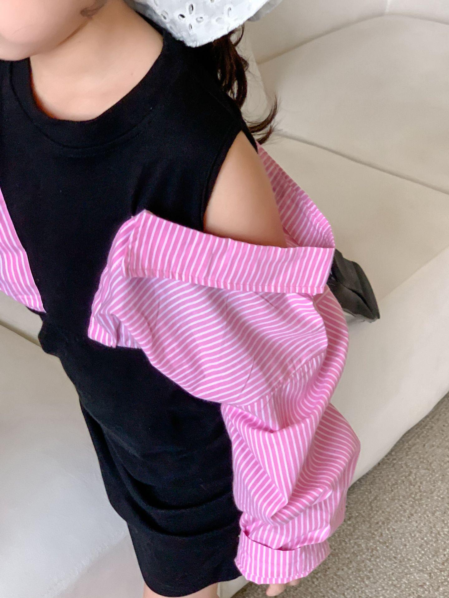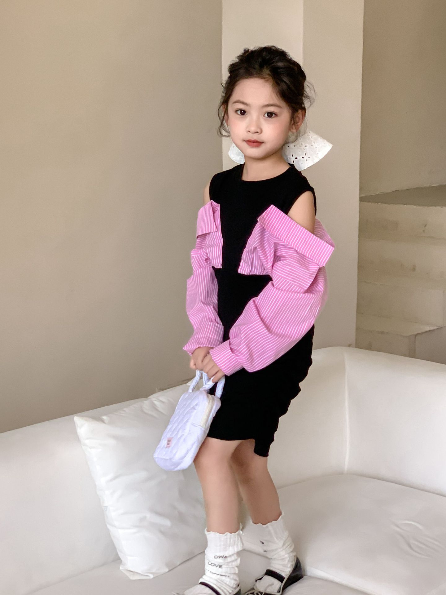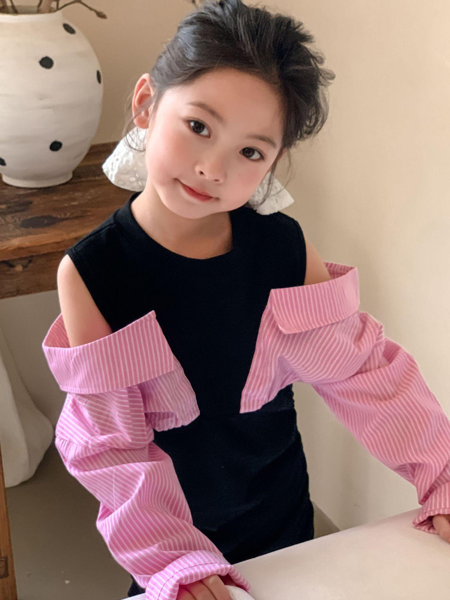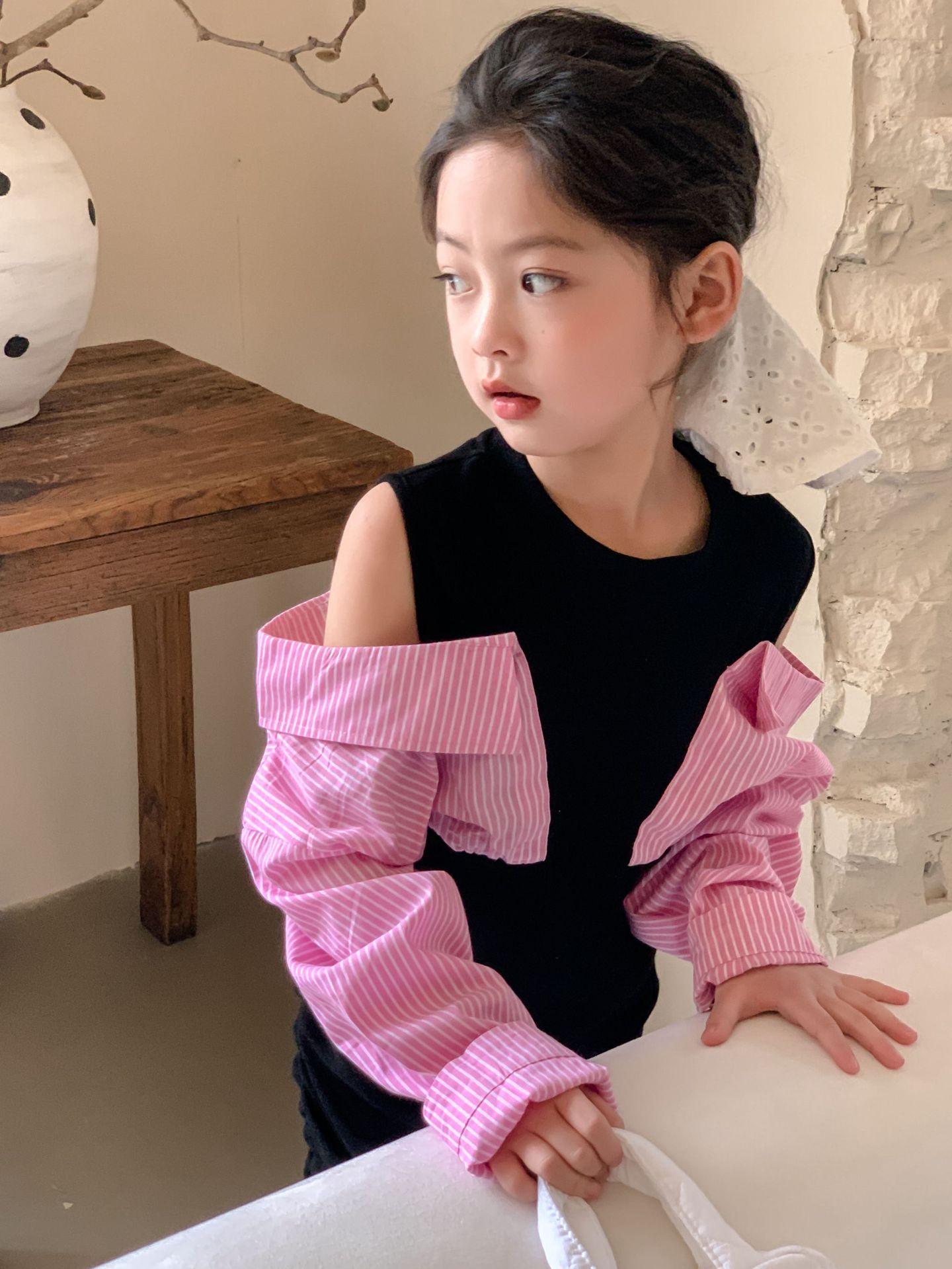 Falda infantil Primavera 2024 Vestido de dos piezas con hombros descubiertos para niña grande Vestido estilo Spice Girl con mangas camiseras