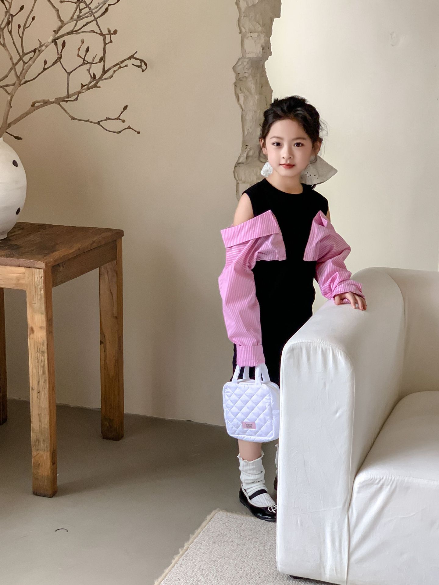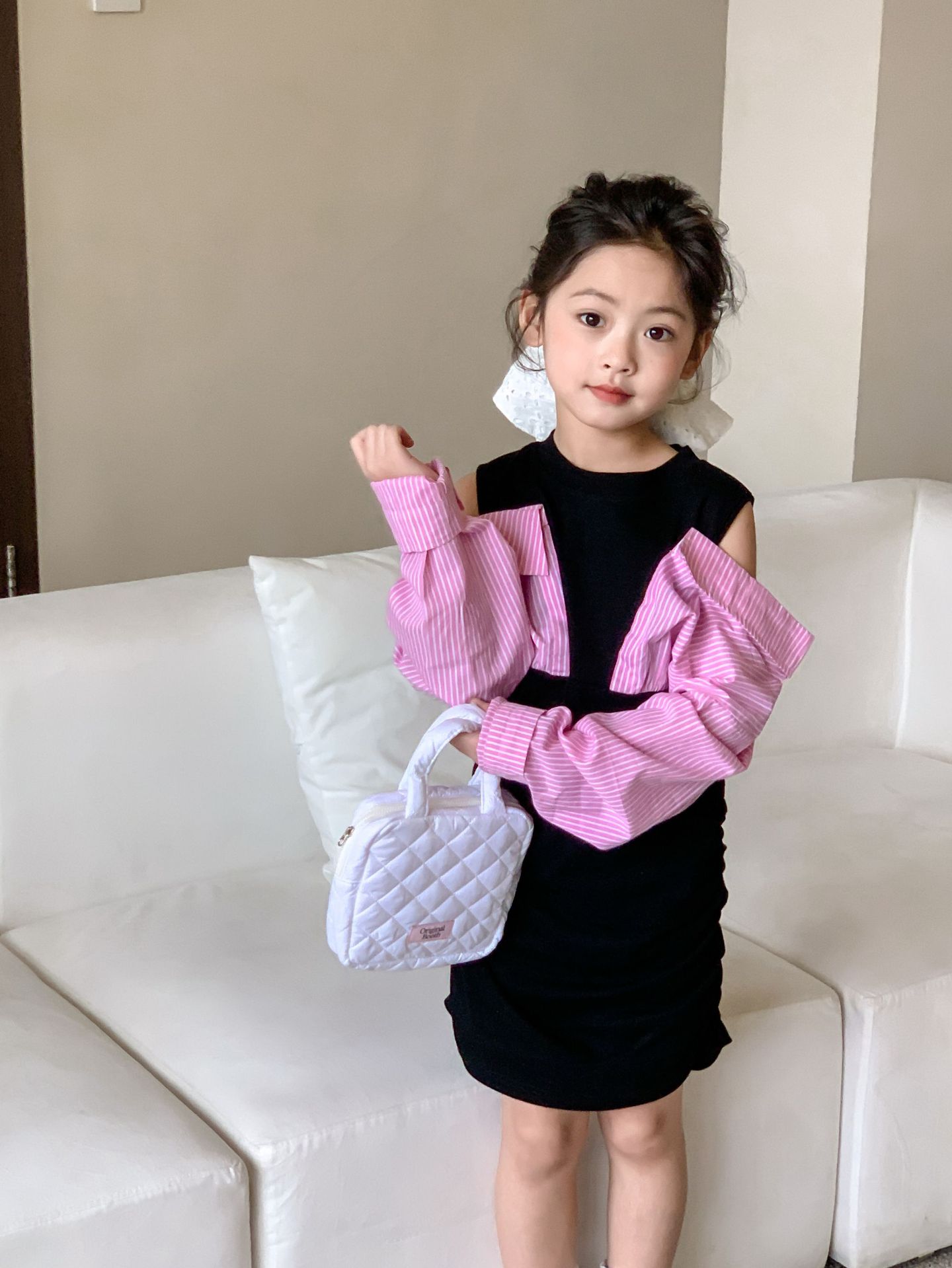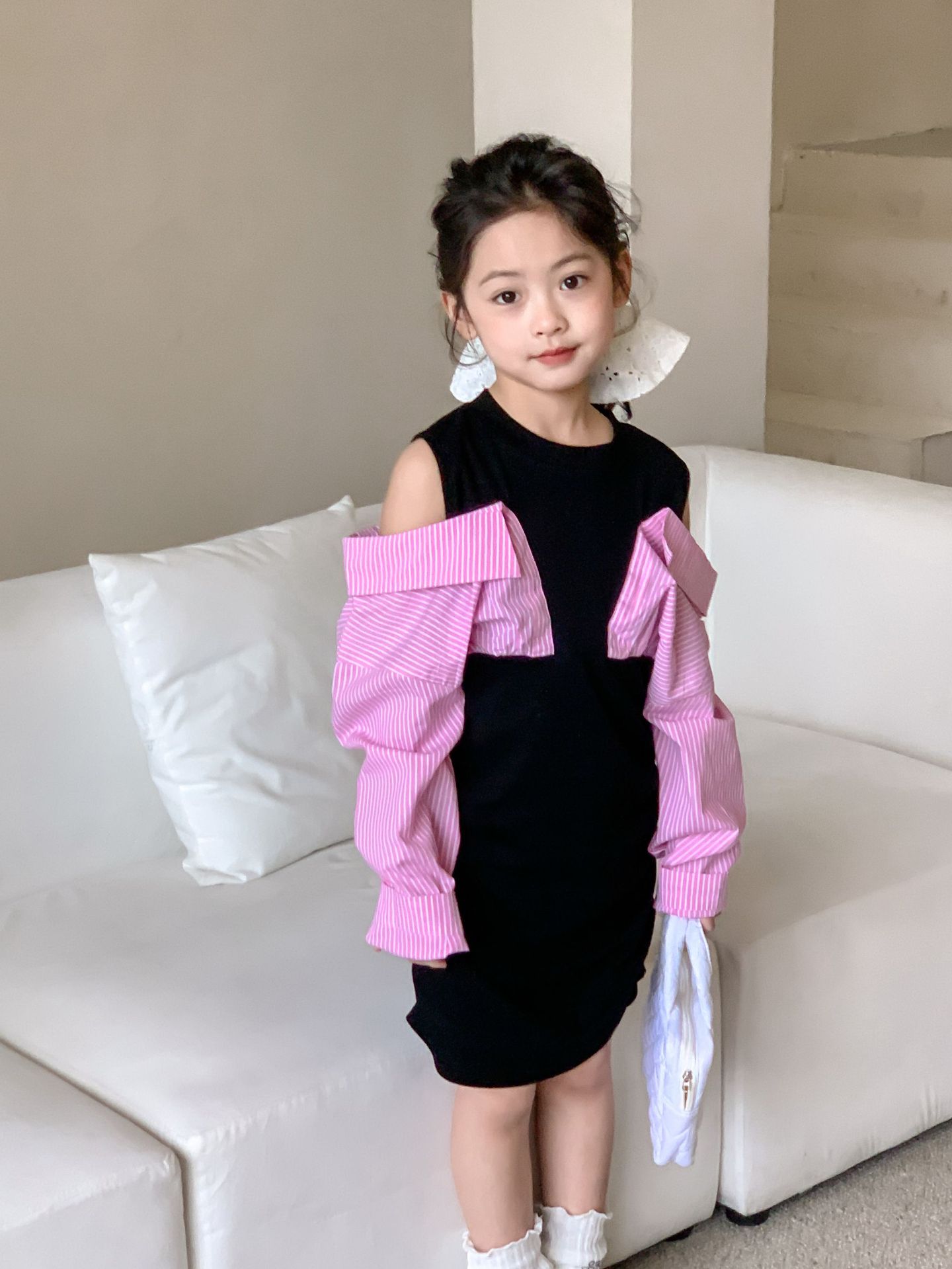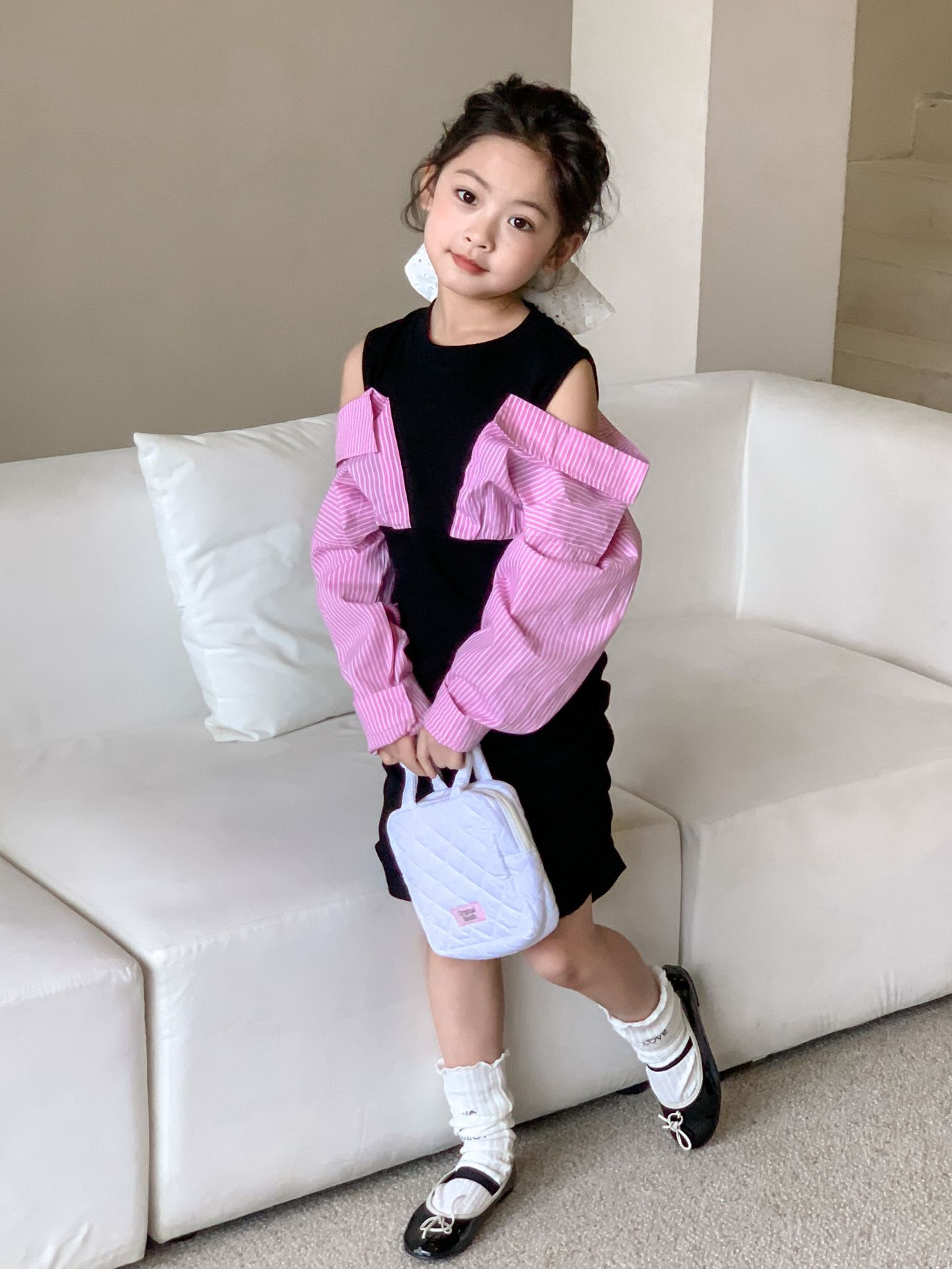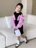 Falda infantil Primavera 2024 Vestido de dos piezas con hombros descubiertos para niña grande Vestido estilo Spice Girl con mangas camiseras