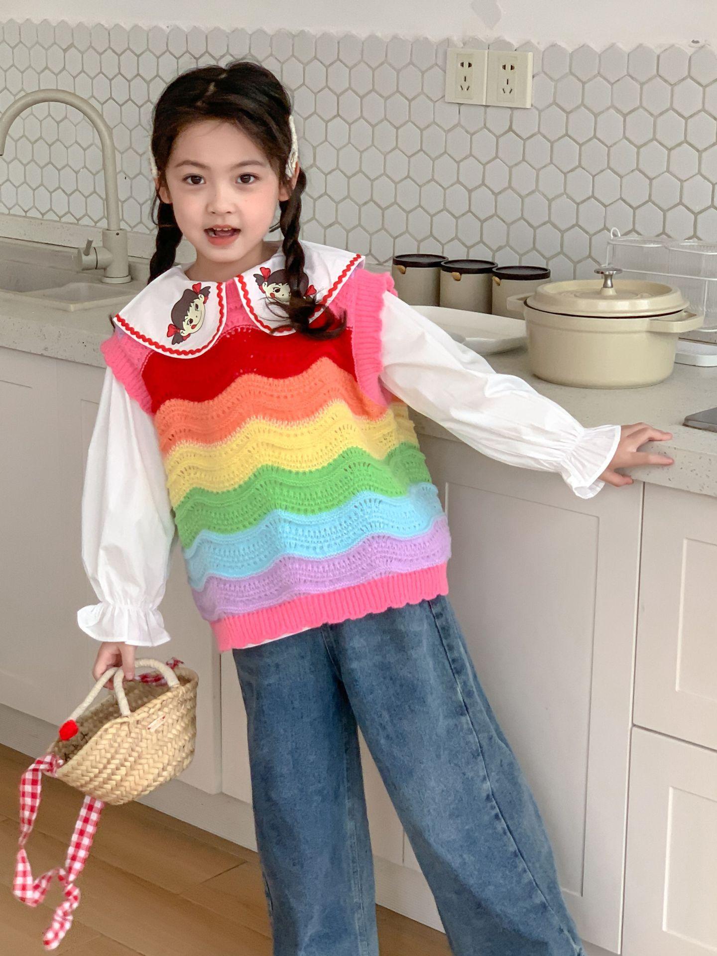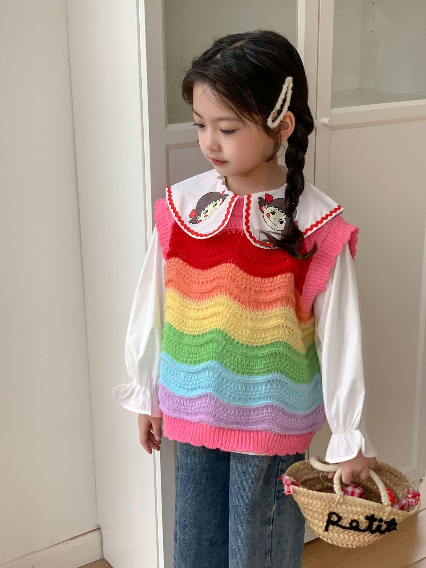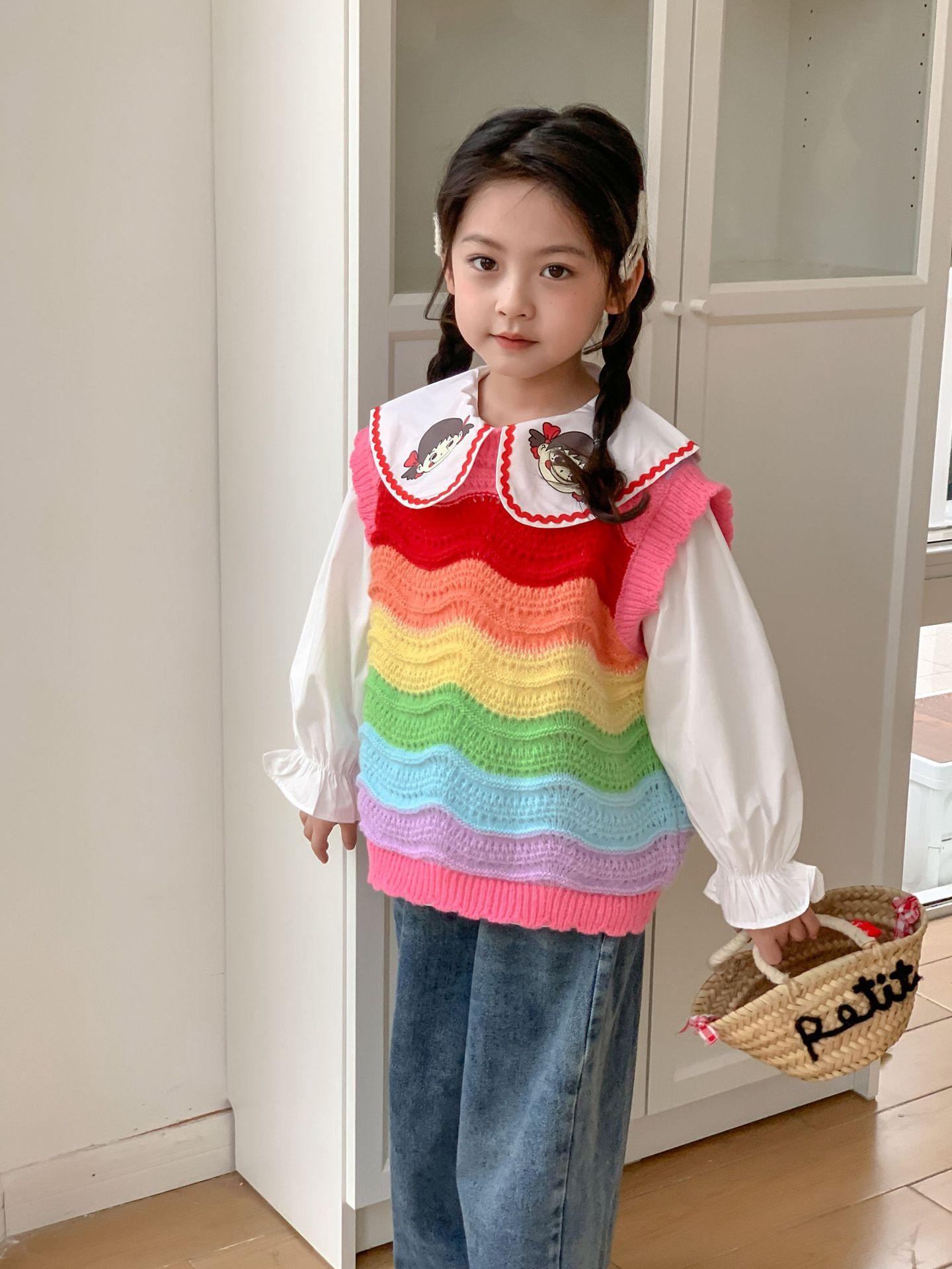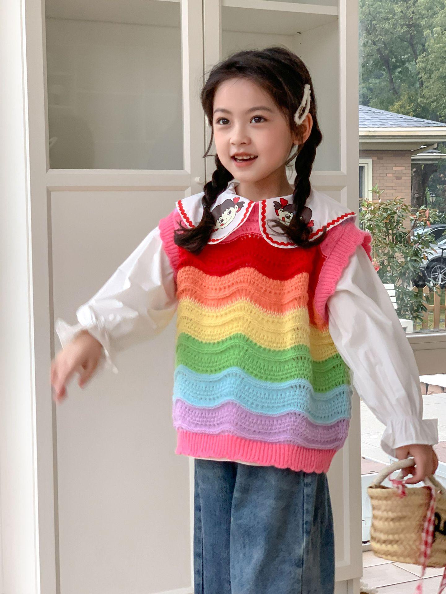 Chaleco para Niños 2024 Primavera Chaleco de Lana sin Mangas Ondulado con Costuras de Color para Niñas Top de Suéter Lindo para Bebé para Mujer