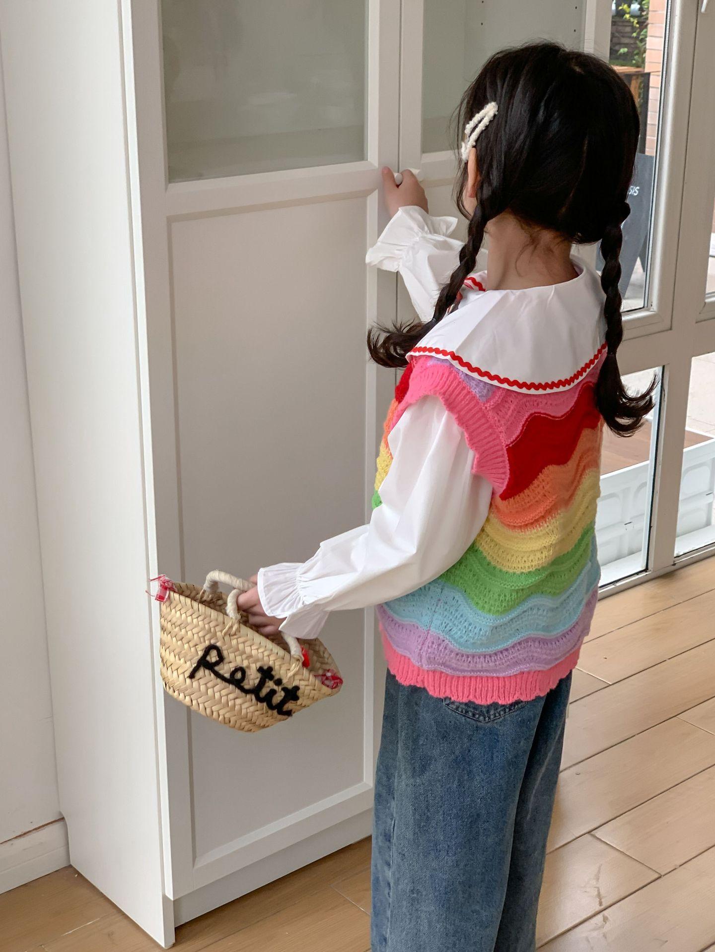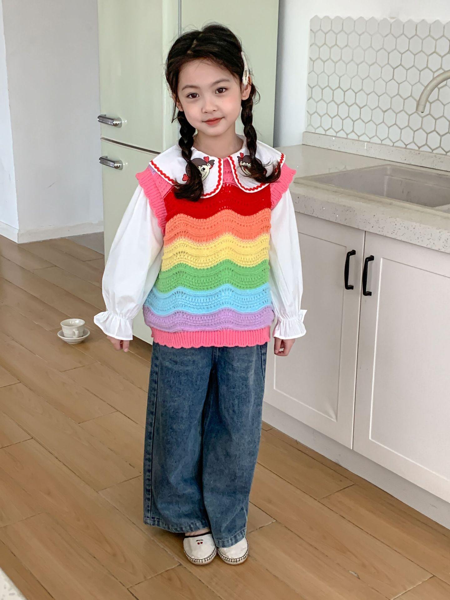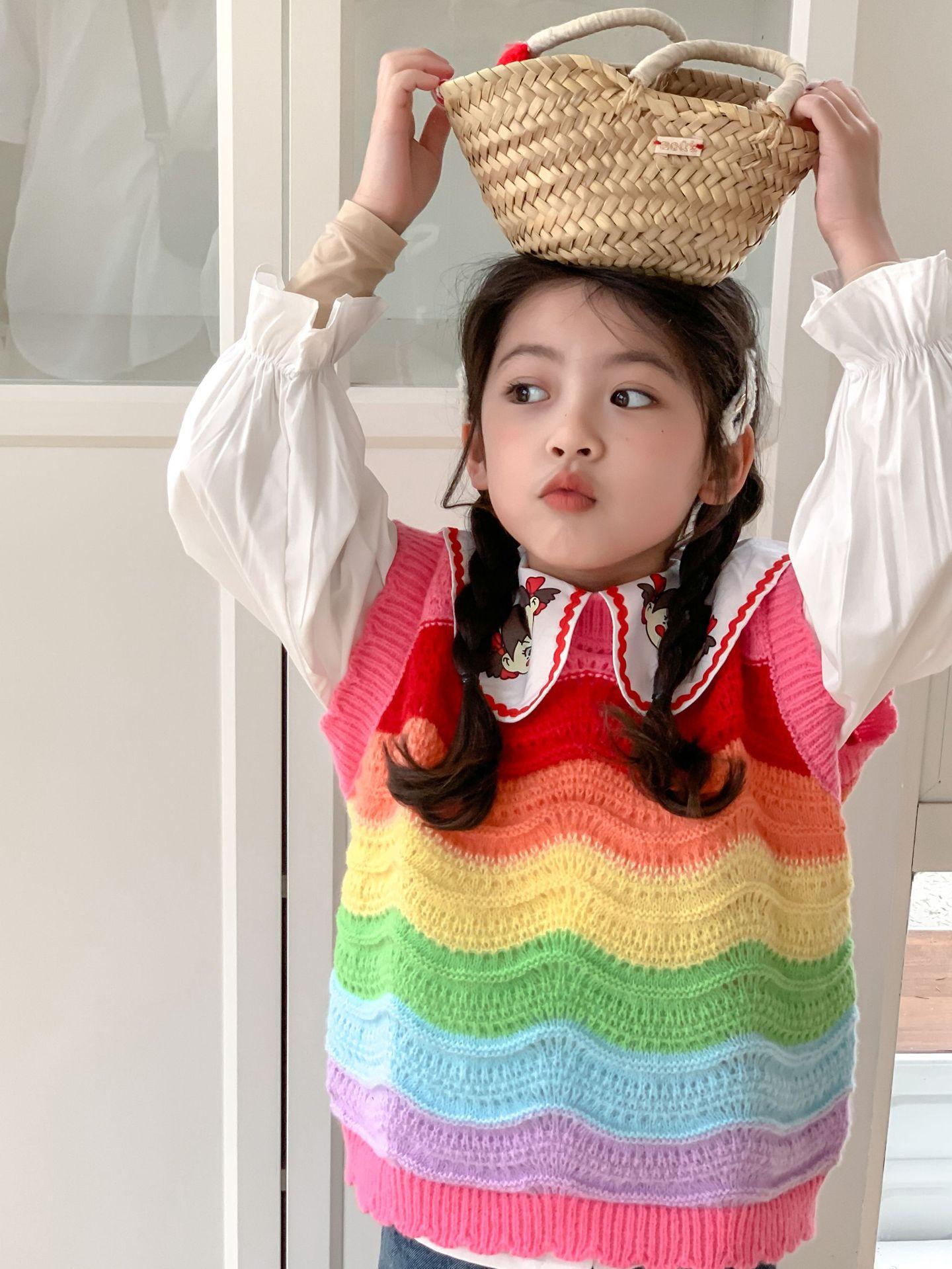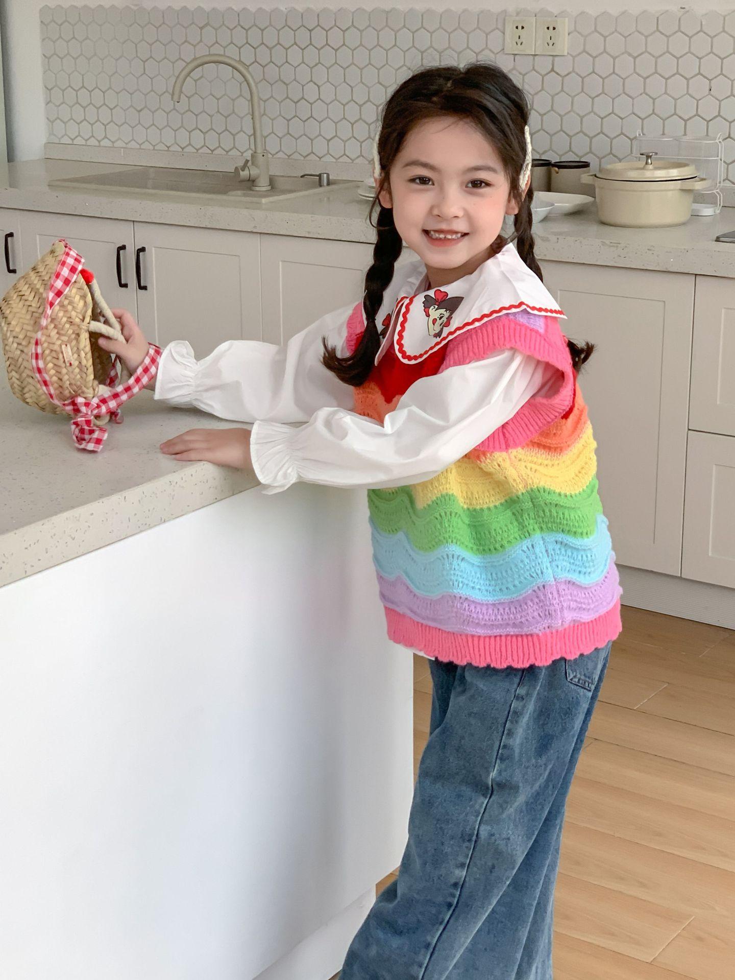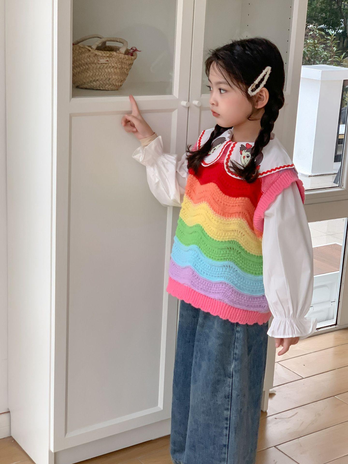 Chaleco para Niños 2024 Primavera Chaleco de Lana sin Mangas Ondulado con Costuras de Color para Niñas Top de Suéter Lindo para Bebé para Mujer