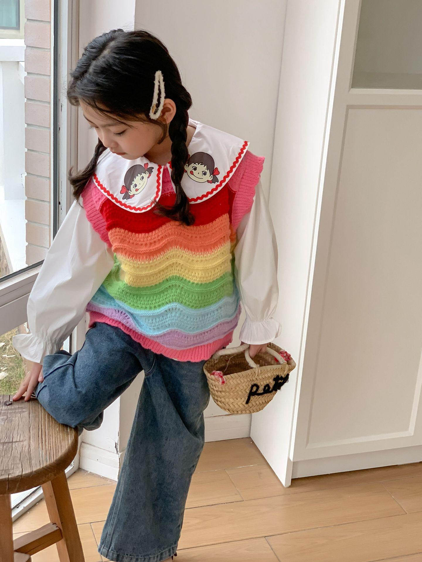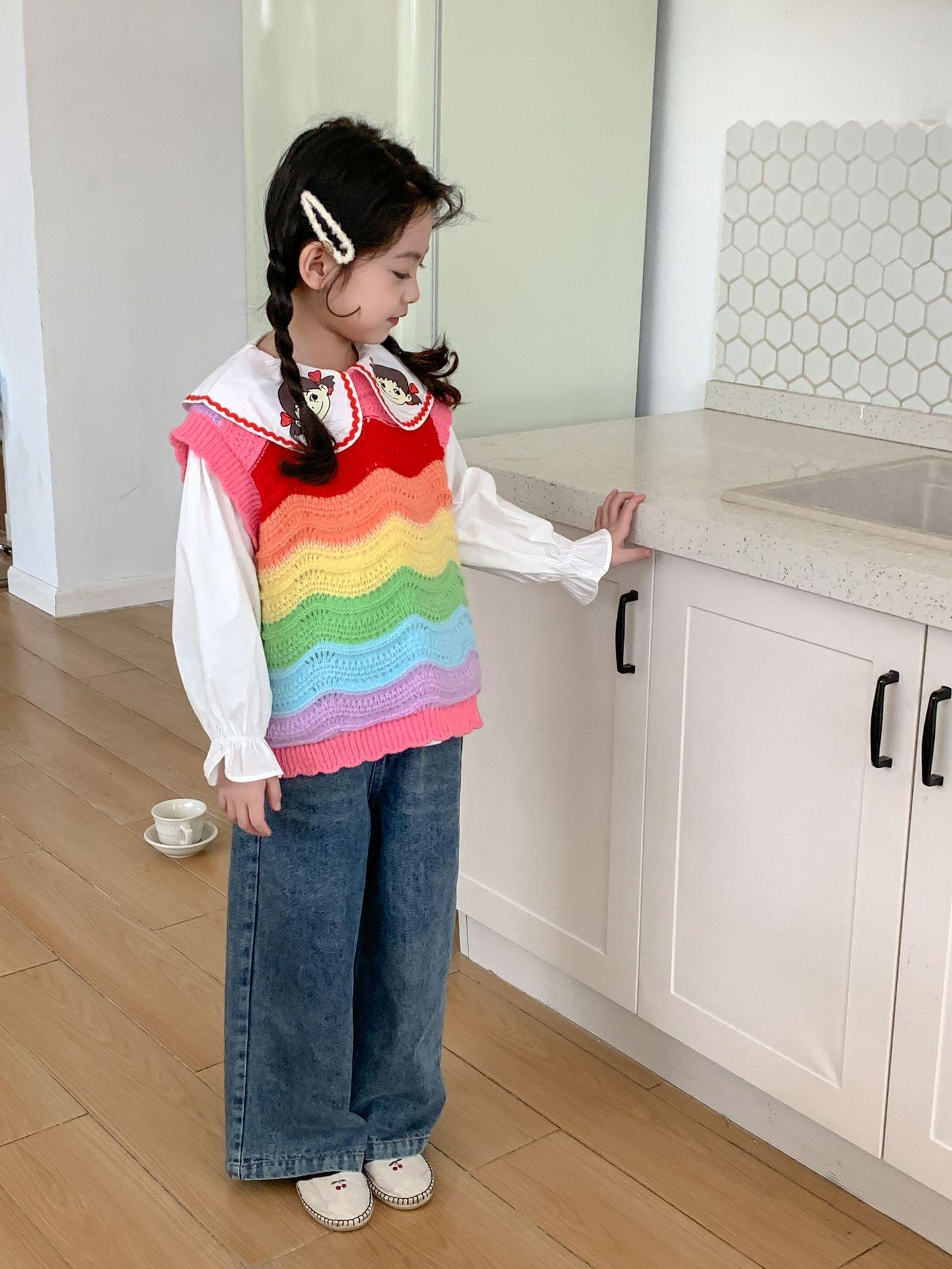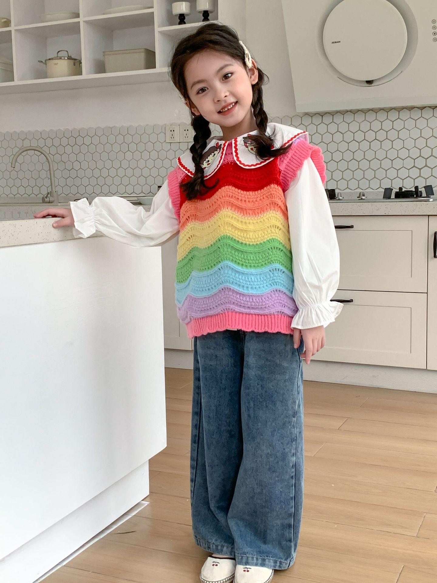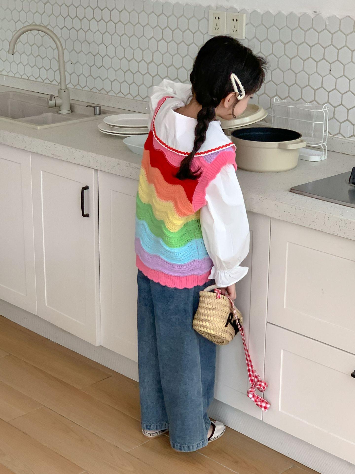 Chaleco para Niños 2024 Primavera Chaleco de Lana sin Mangas Ondulado con Costuras de Color para Niñas Top de Suéter Lindo para Bebé para Mujer