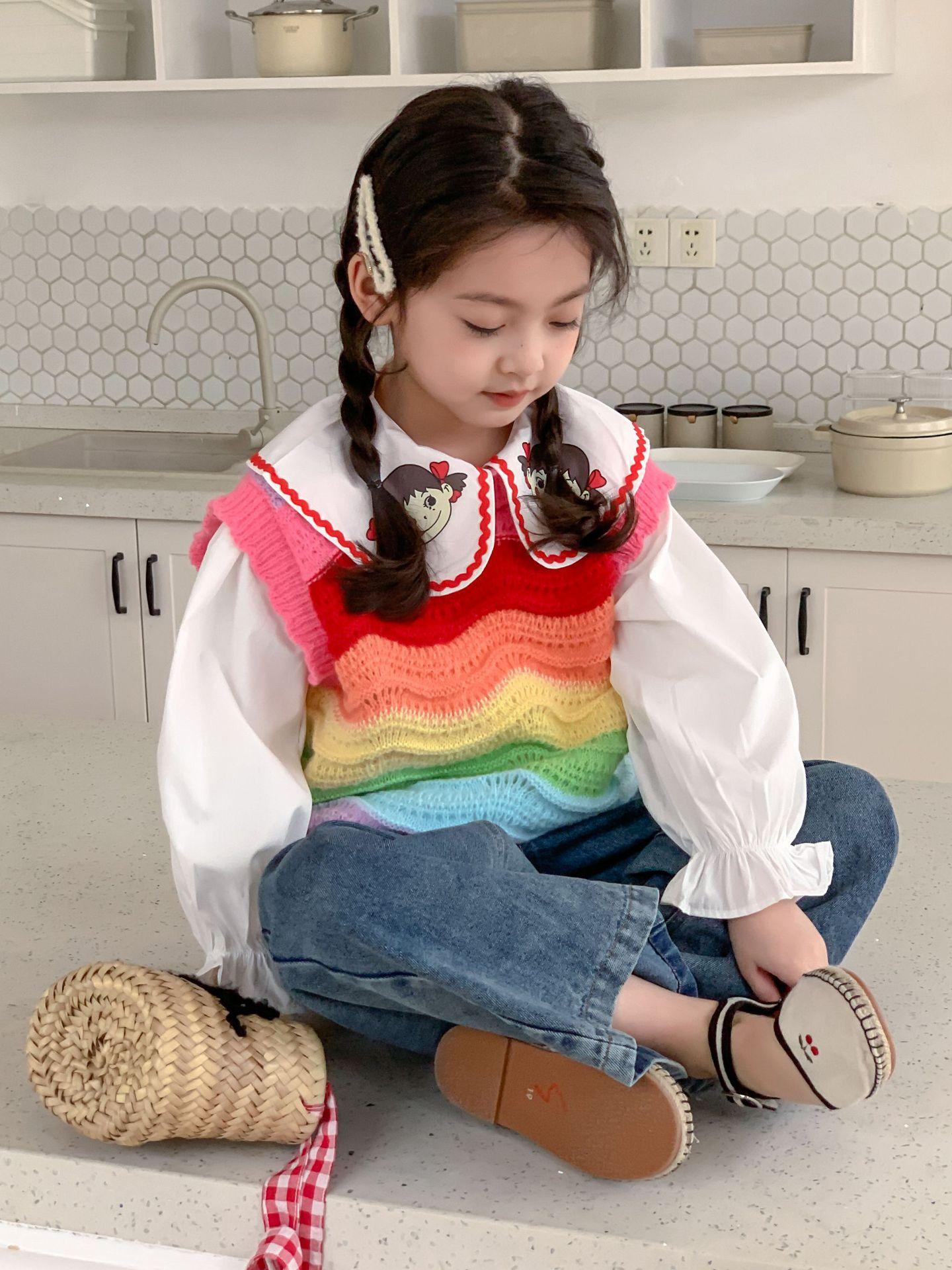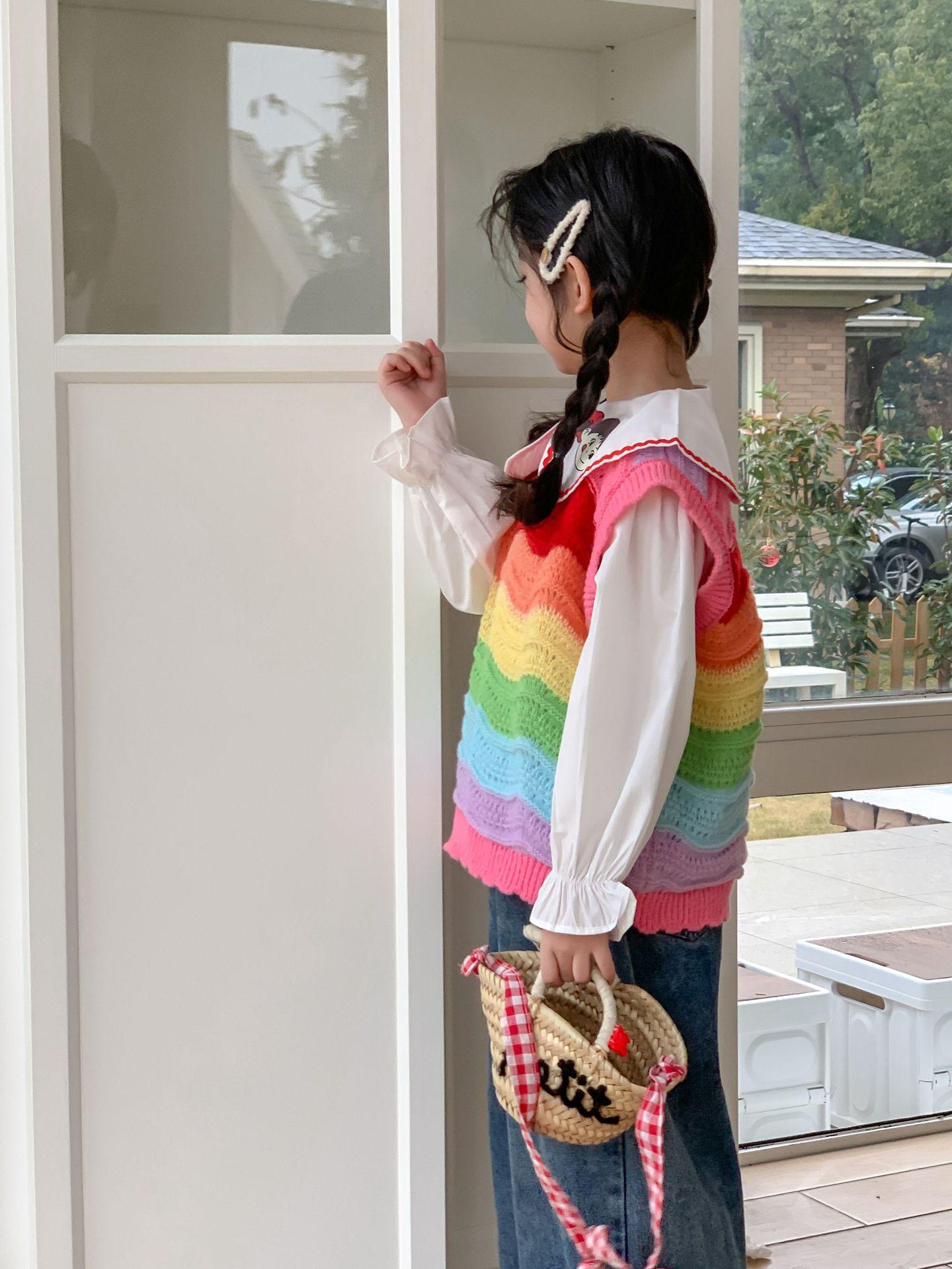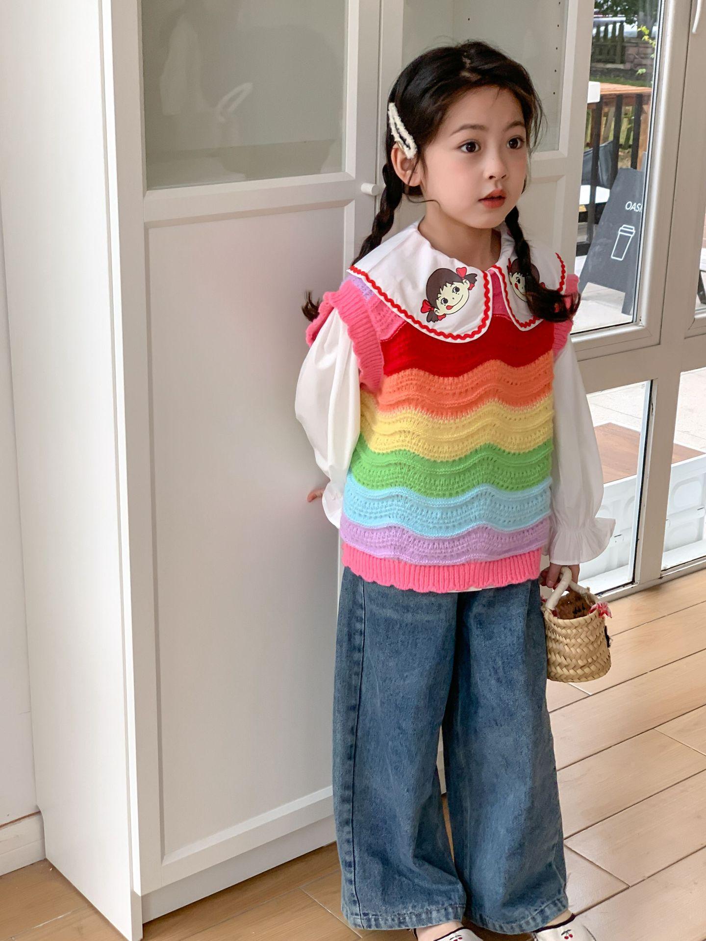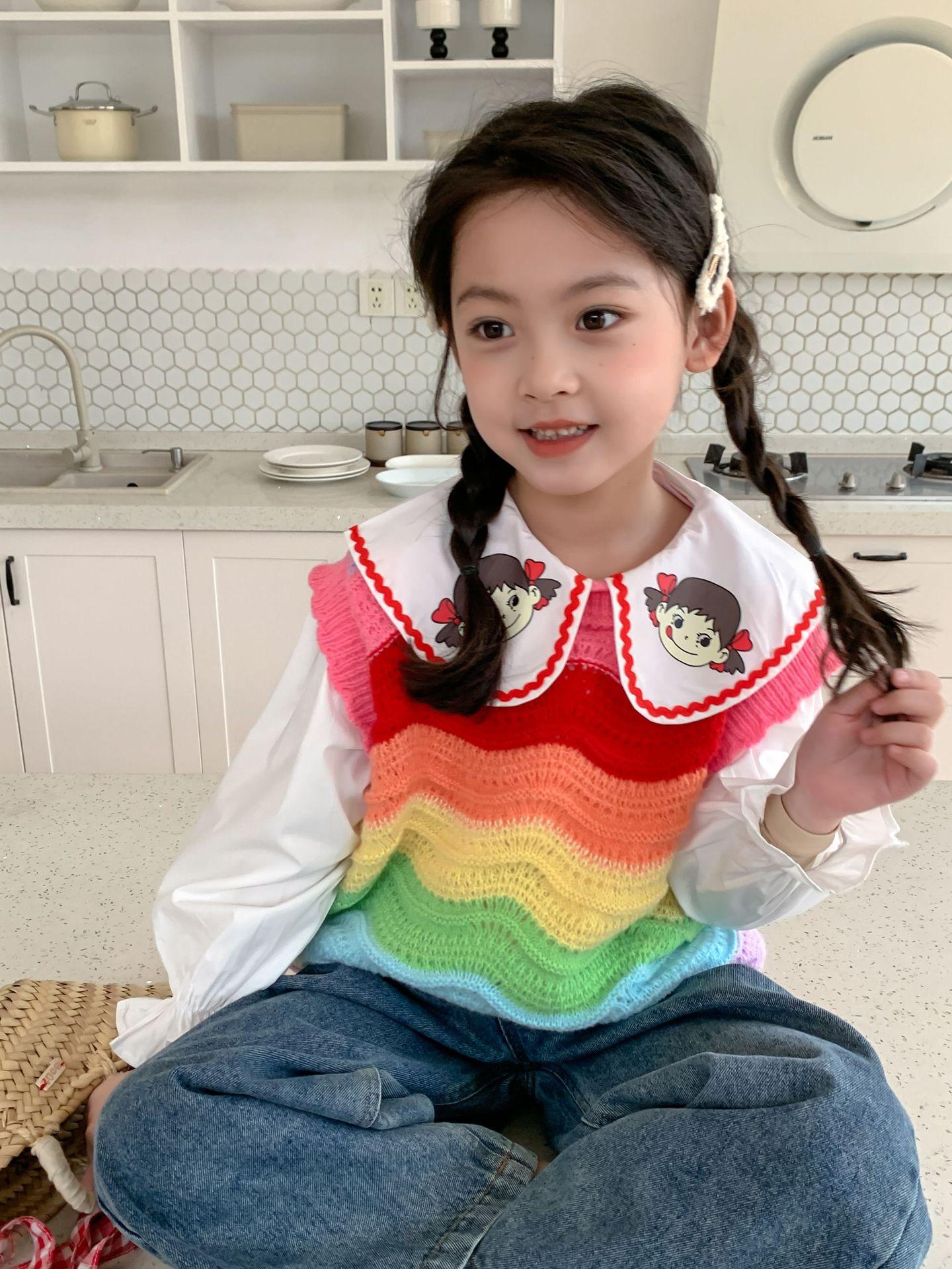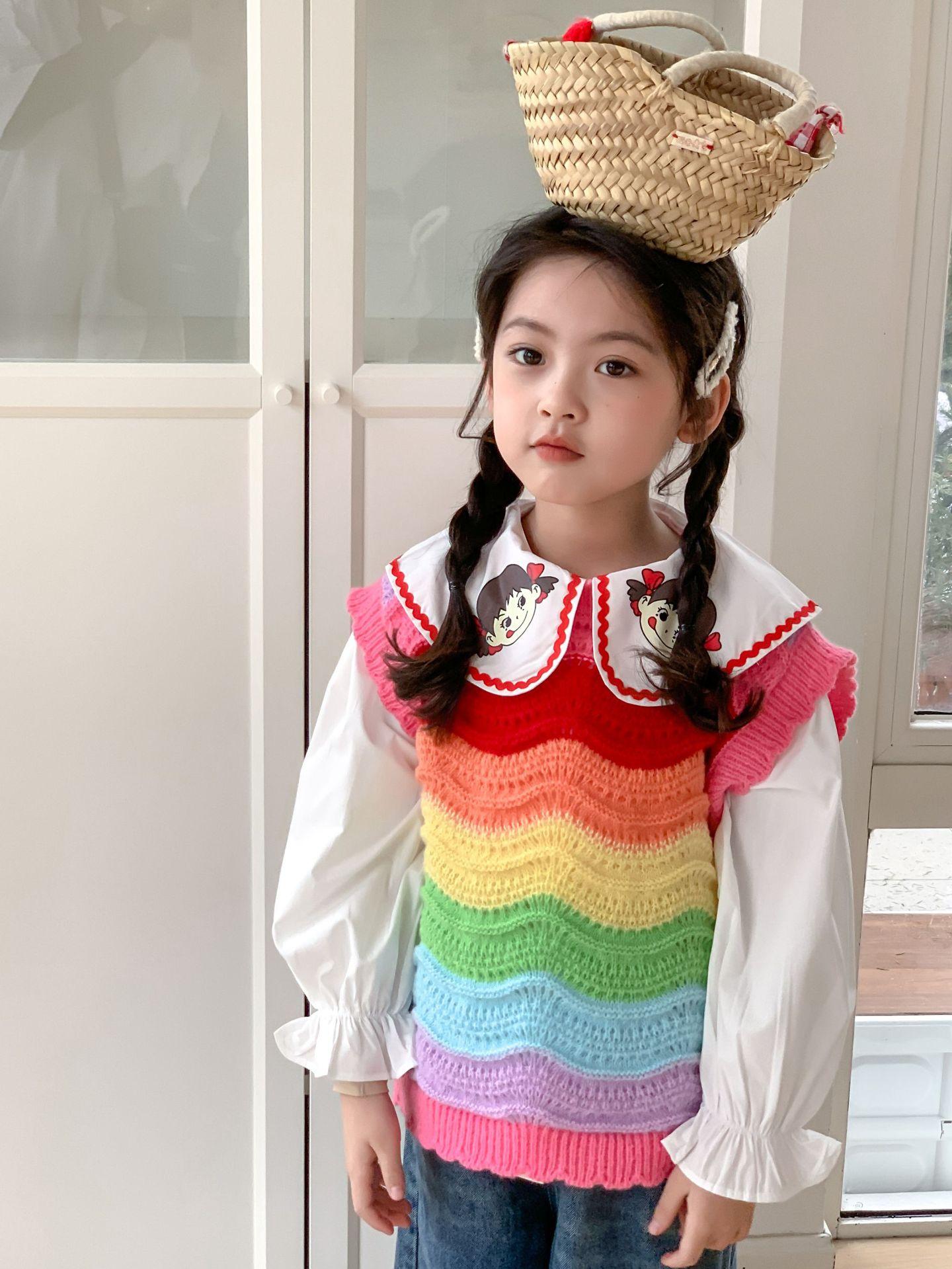 Chaleco para Niños 2024 Primavera Chaleco de Lana sin Mangas Ondulado con Costuras de Color para Niñas Top de Suéter Lindo para Bebé para Mujer