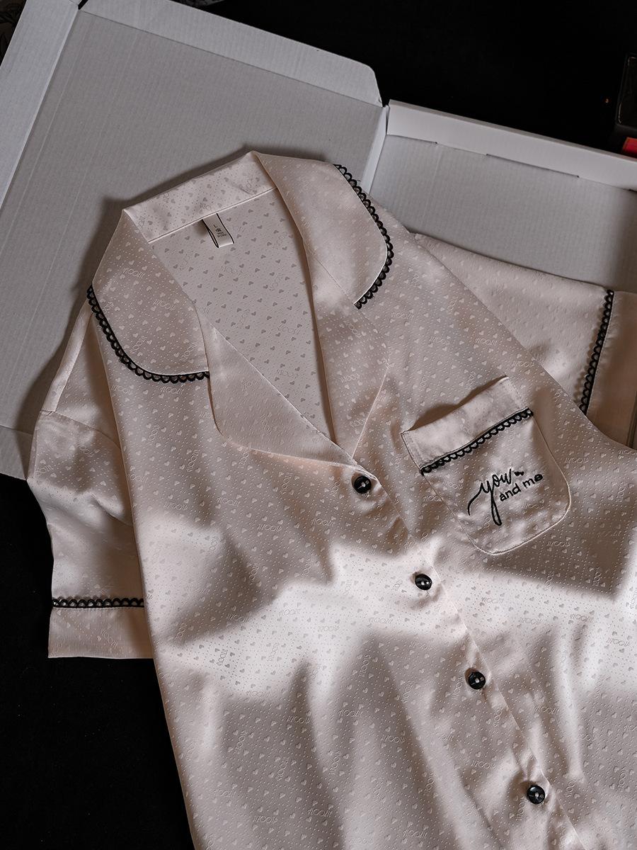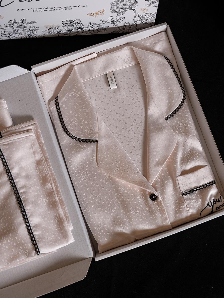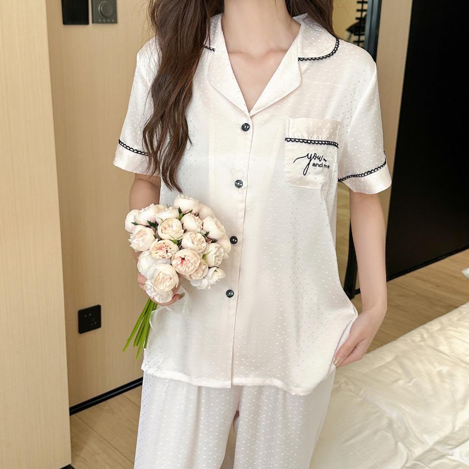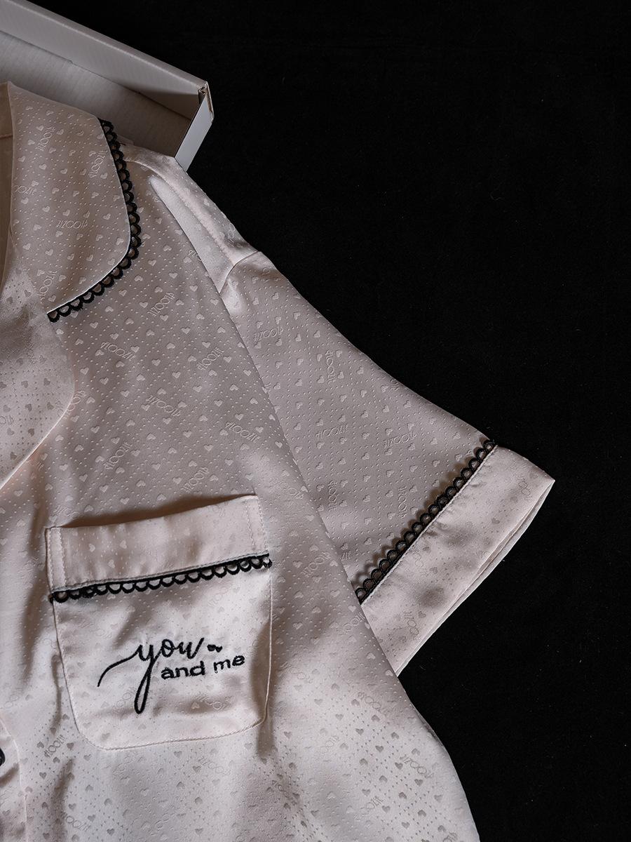 Pijama para Mujer Estilo Dulce y Lindo Jacquard Corazoncito Primavera y Verano Seda de Hielo Manga Corta Conjunto de Ropa para Casa