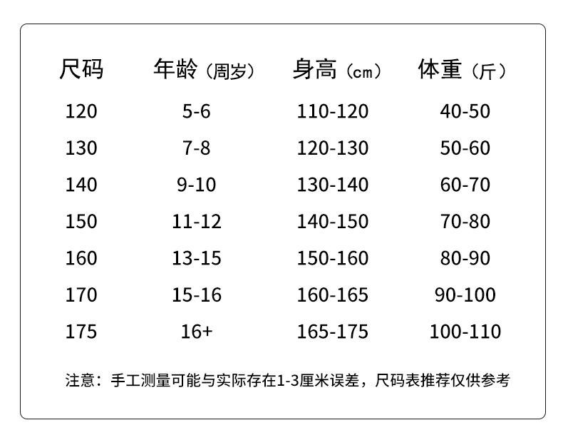 120cm, 130cm, 140cm, 150cm, 160cm, 170cm, 175cm
