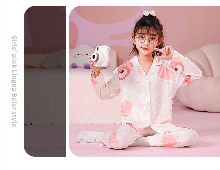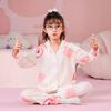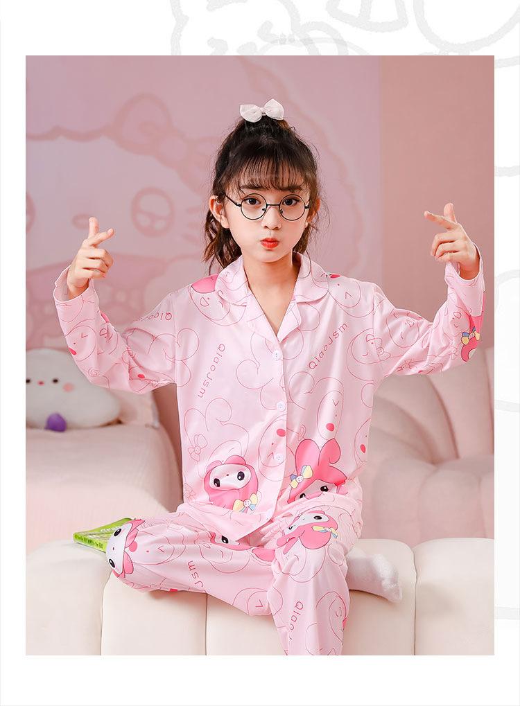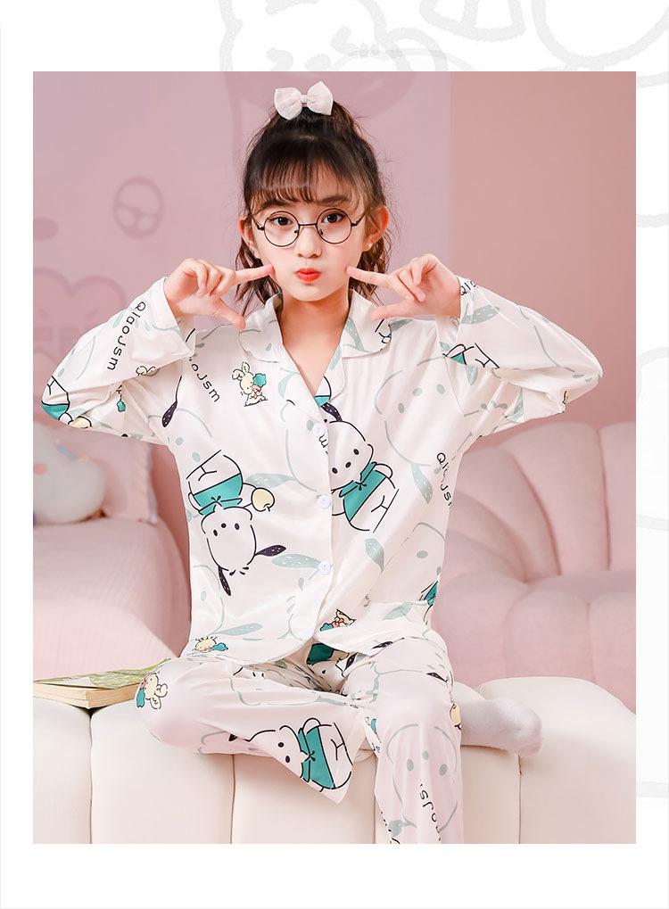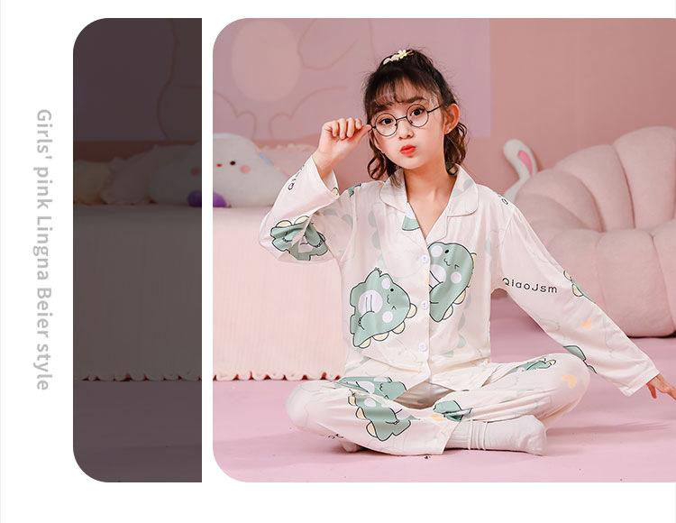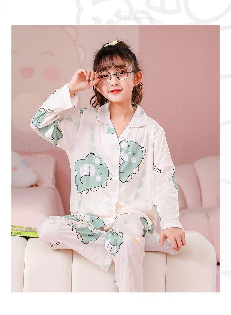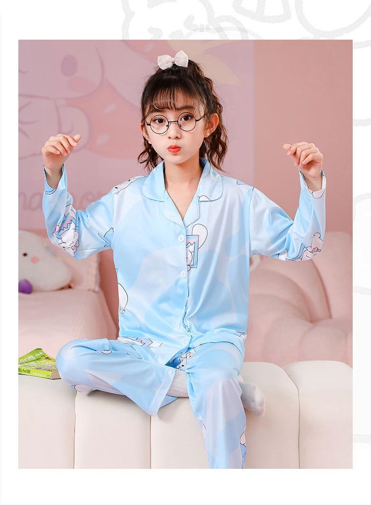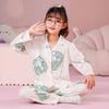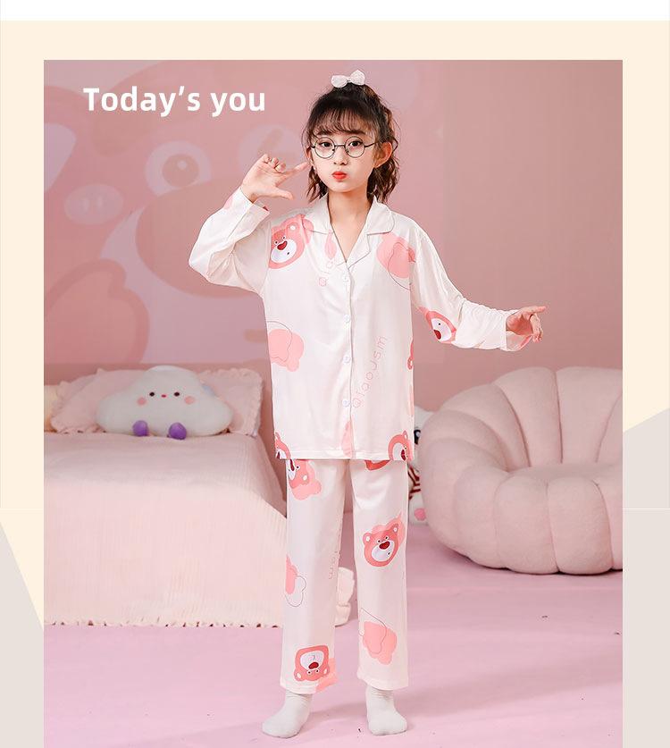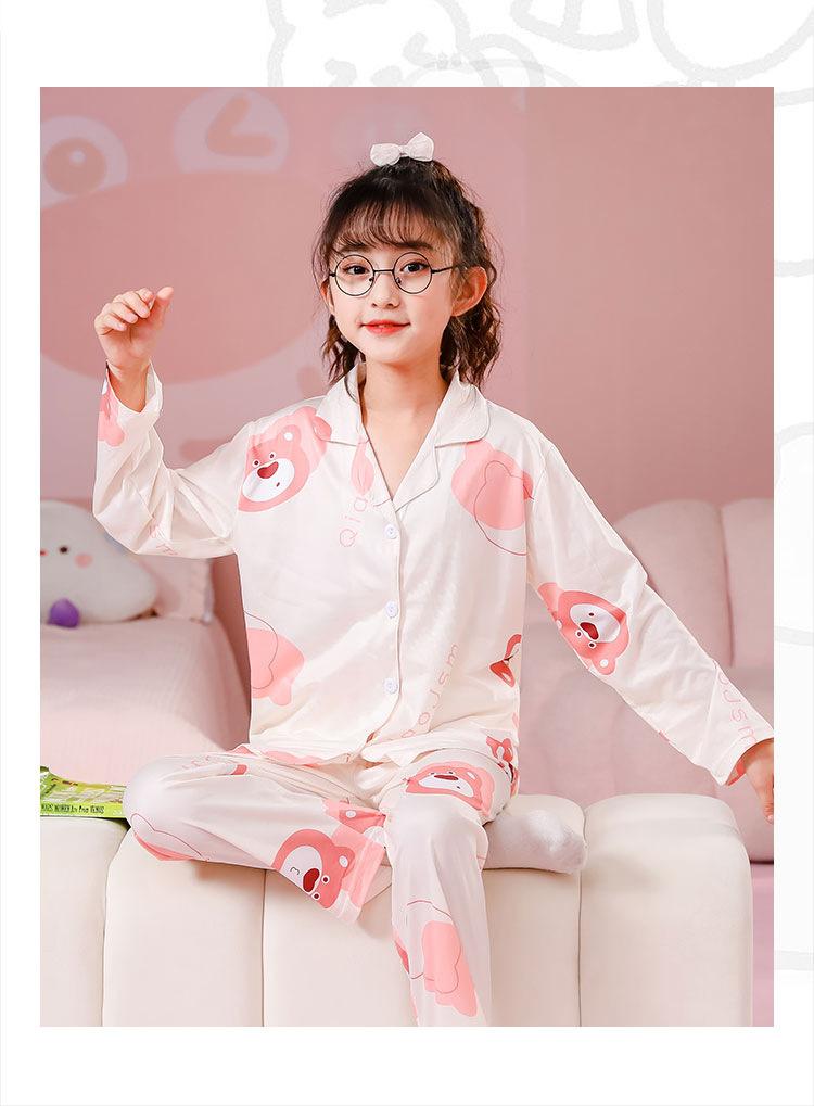 Pijamas de primavera y otoño para niños, cárdigan de mujer con solapa, manga larga, dulce conjunto de ropa de hogar para niños medianos y grandes con dibujos animados coreanos