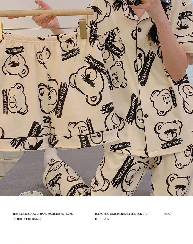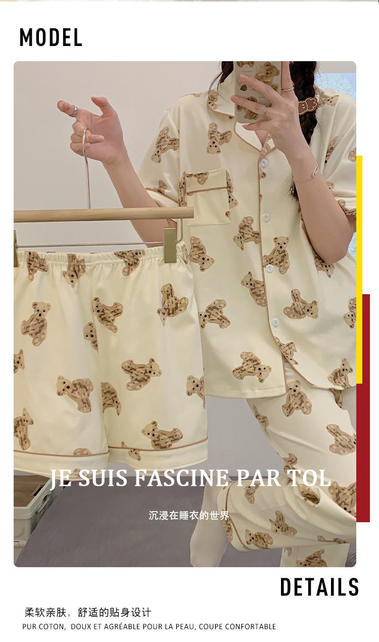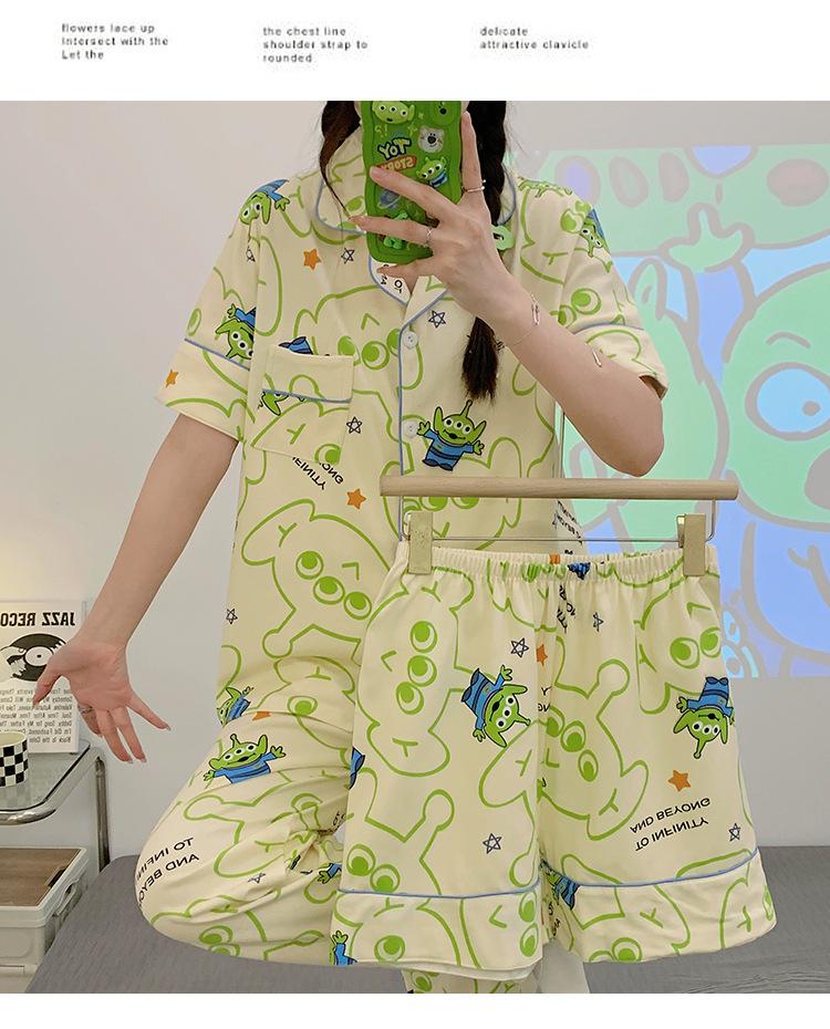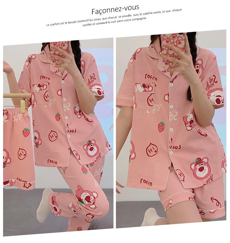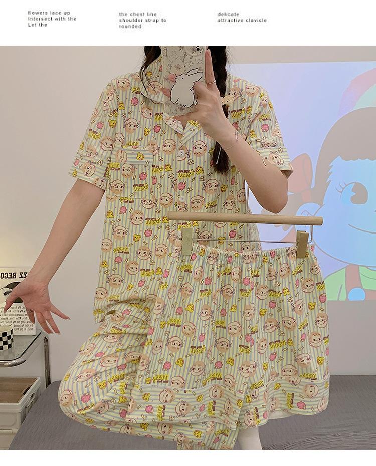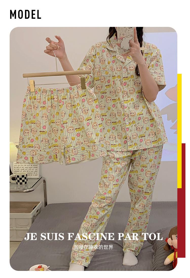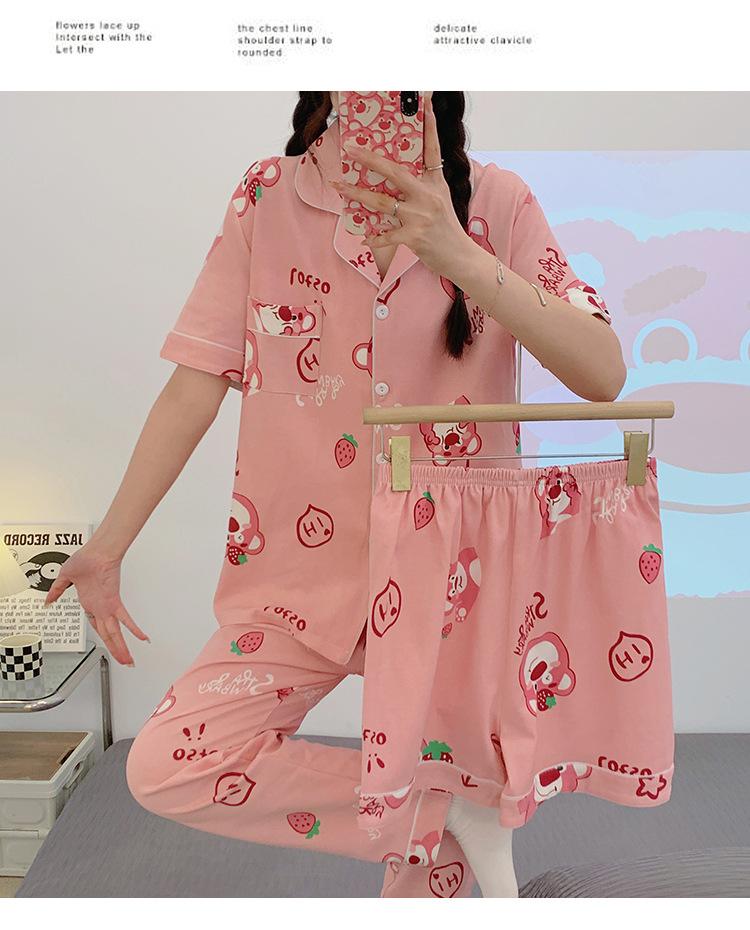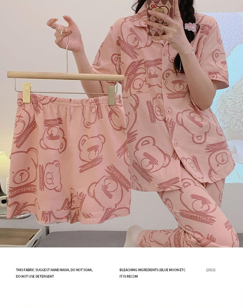 Verano Nuevo Pijama de Tres Piezas de Manga Corta para Mujer Estampado de Dibujos Animados Casual Solapa Cárdigan Ropa de Casa Dropshipping