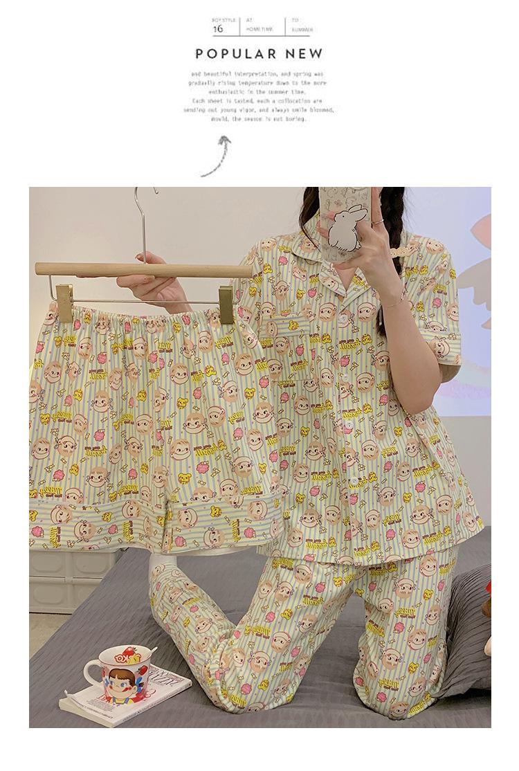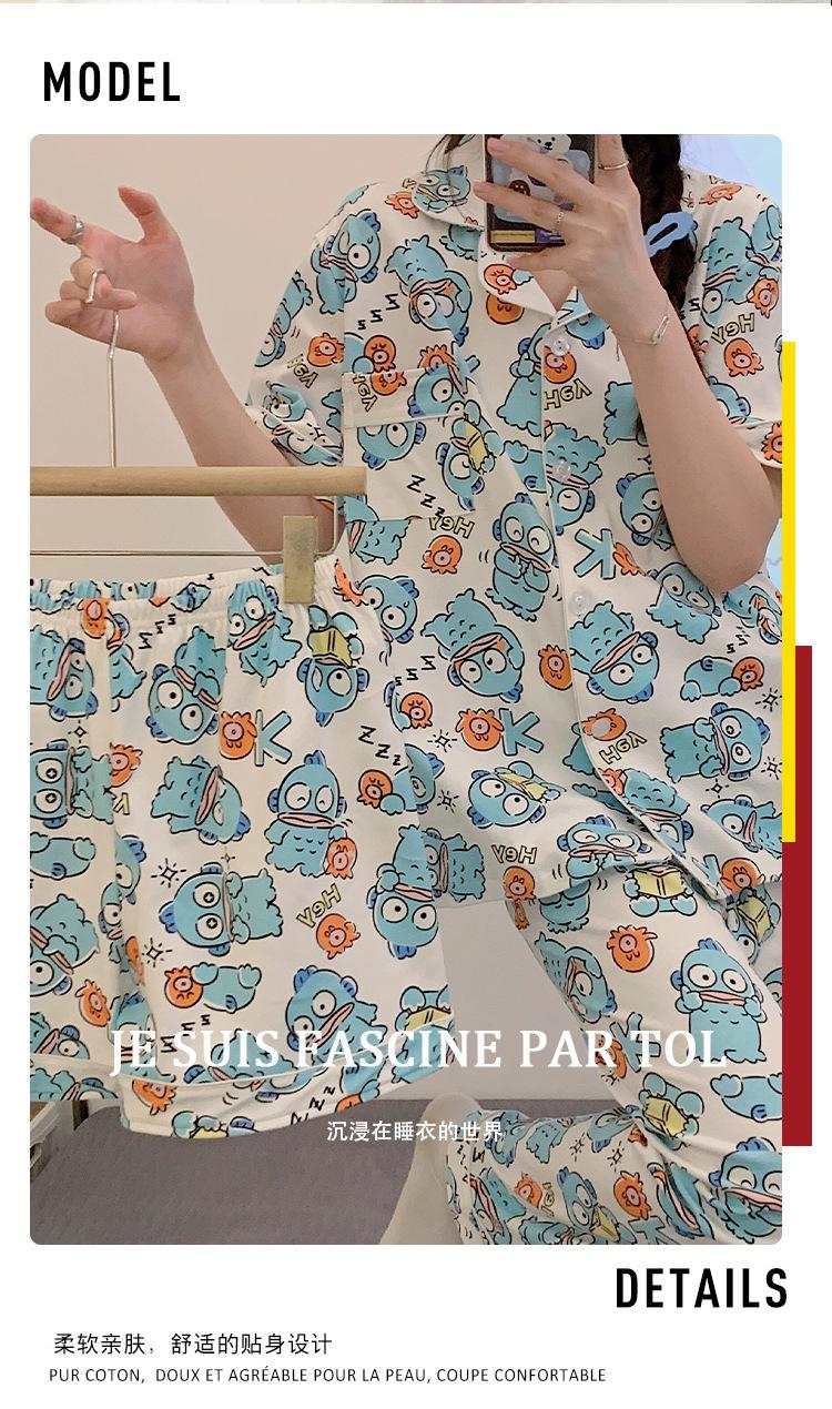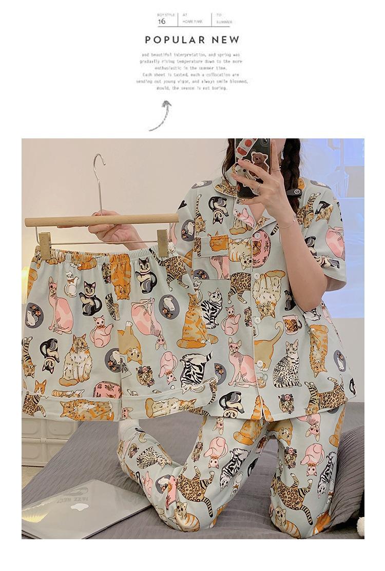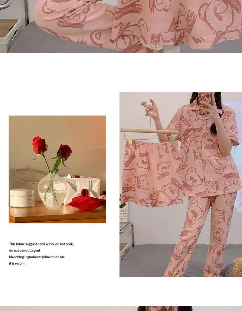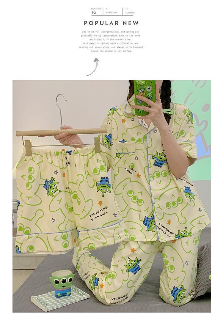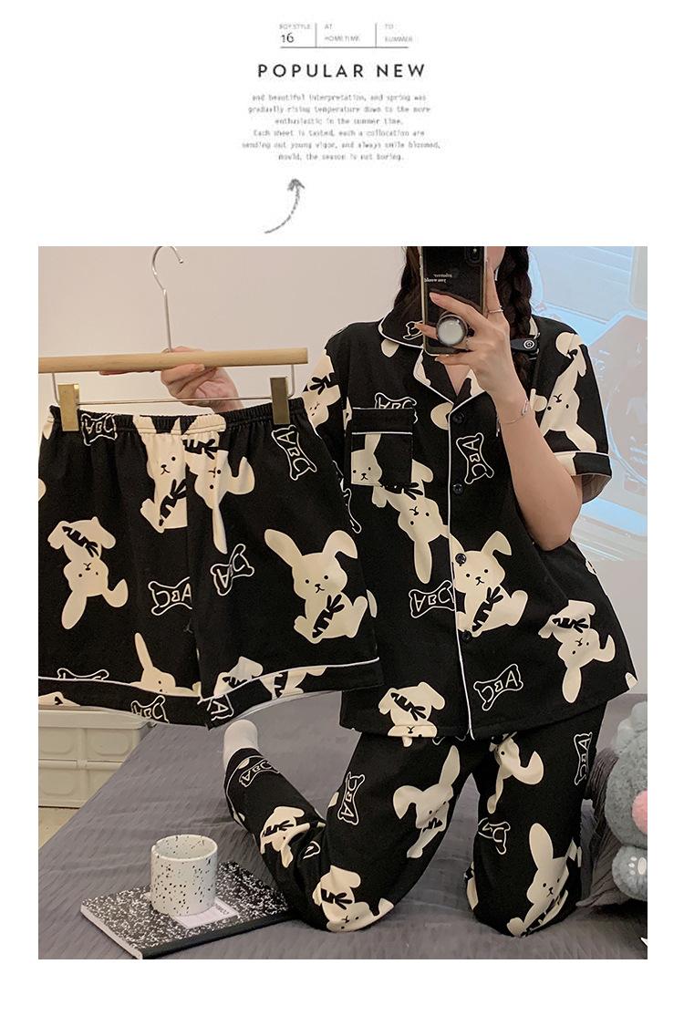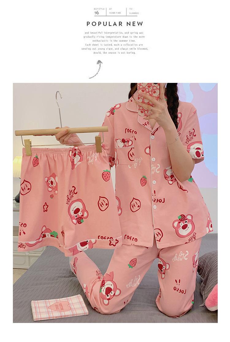Verano Nuevo Pijama de Tres Piezas de Manga Corta para Mujer Estampado de Dibujos Animados Casual Solapa Cárdigan Ropa de Casa Dropshipping