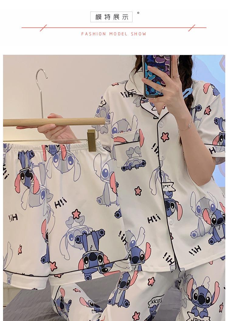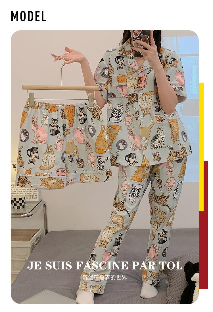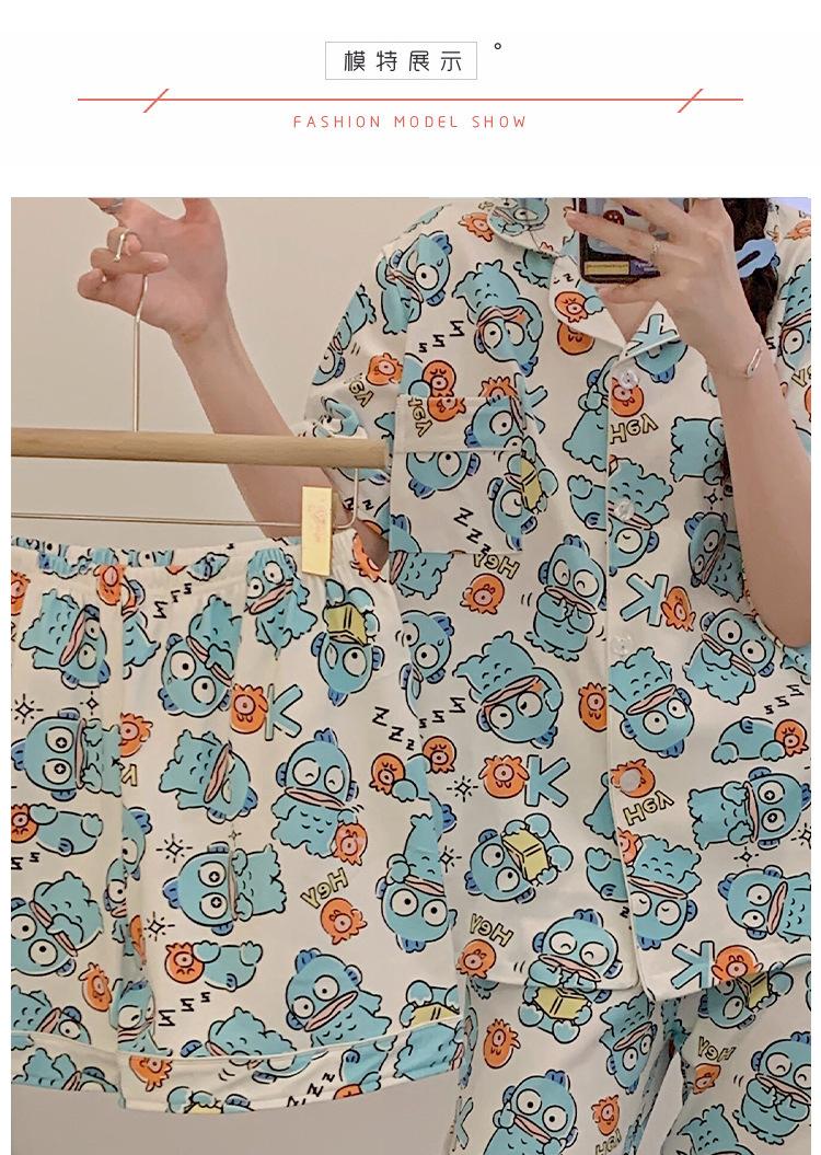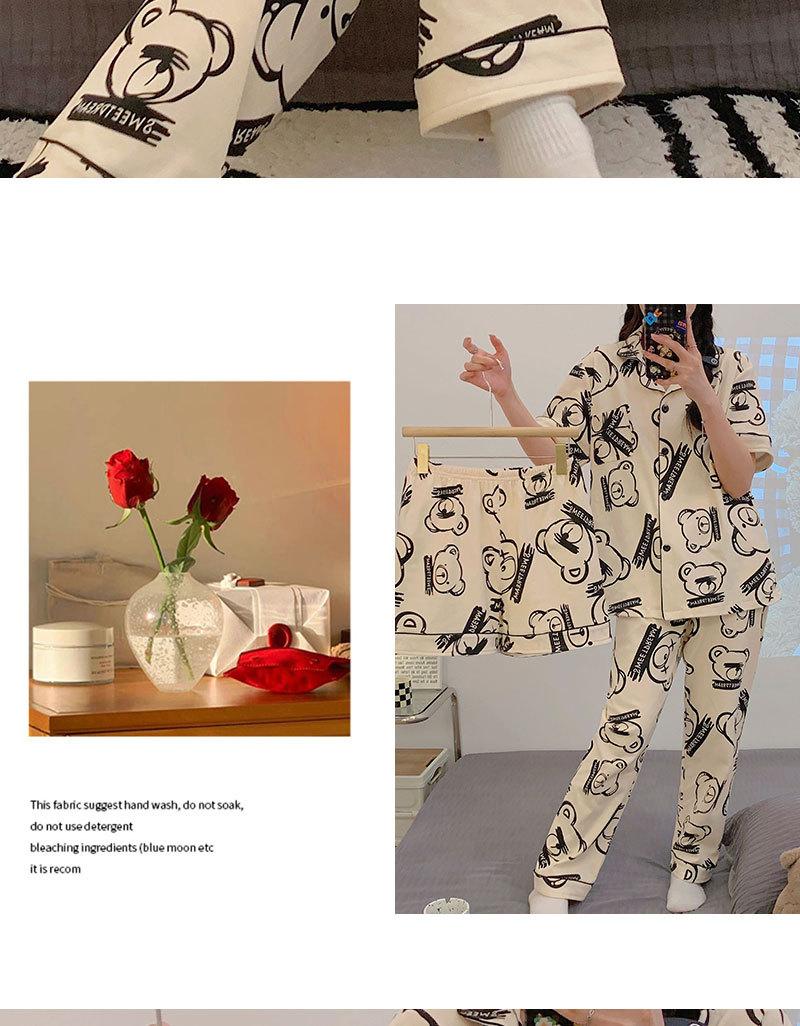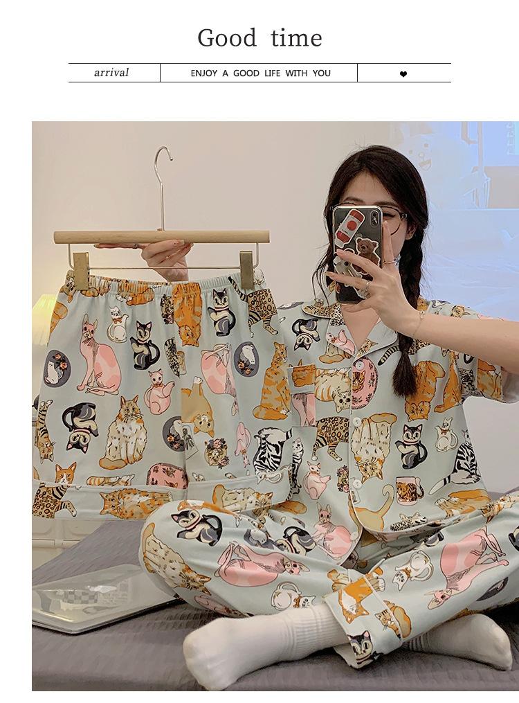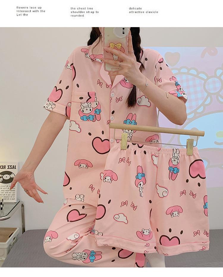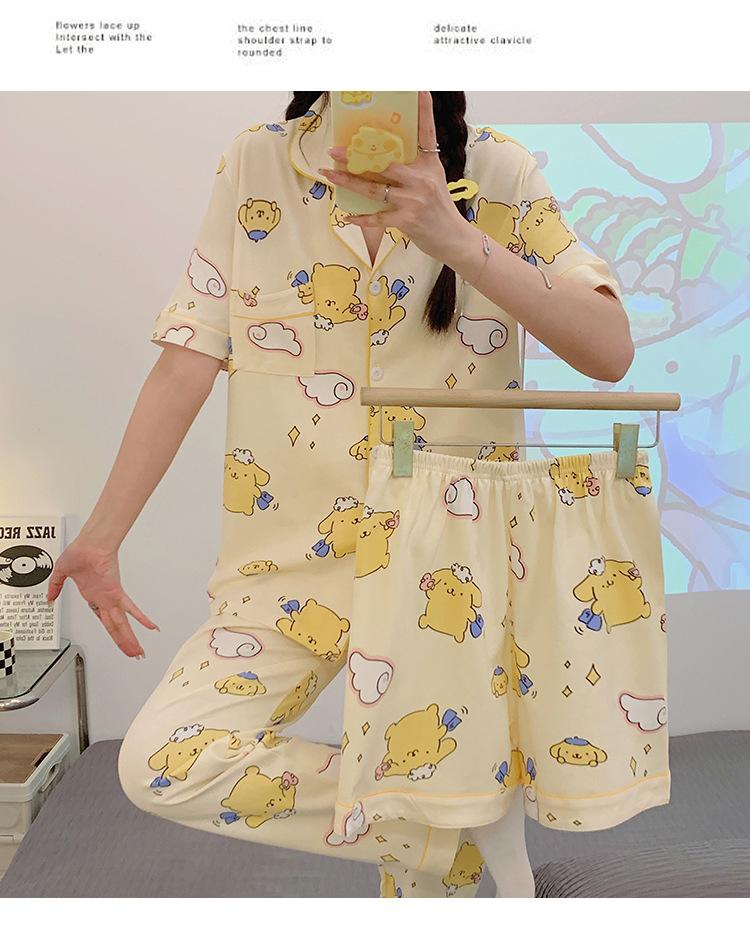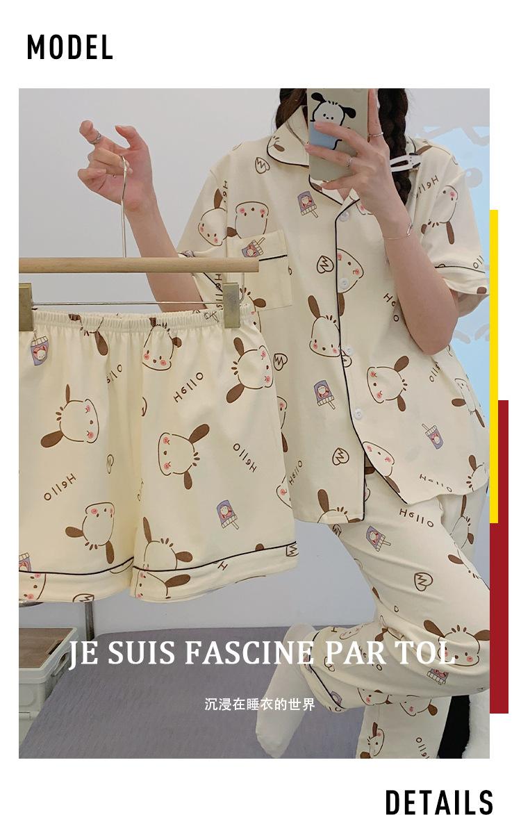 Verano Nuevo Pijama de Tres Piezas de Manga Corta para Mujer Estampado de Dibujos Animados Casual Solapa Cárdigan Ropa de Casa Dropshipping