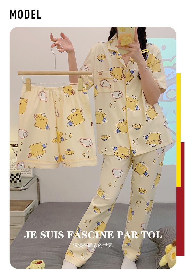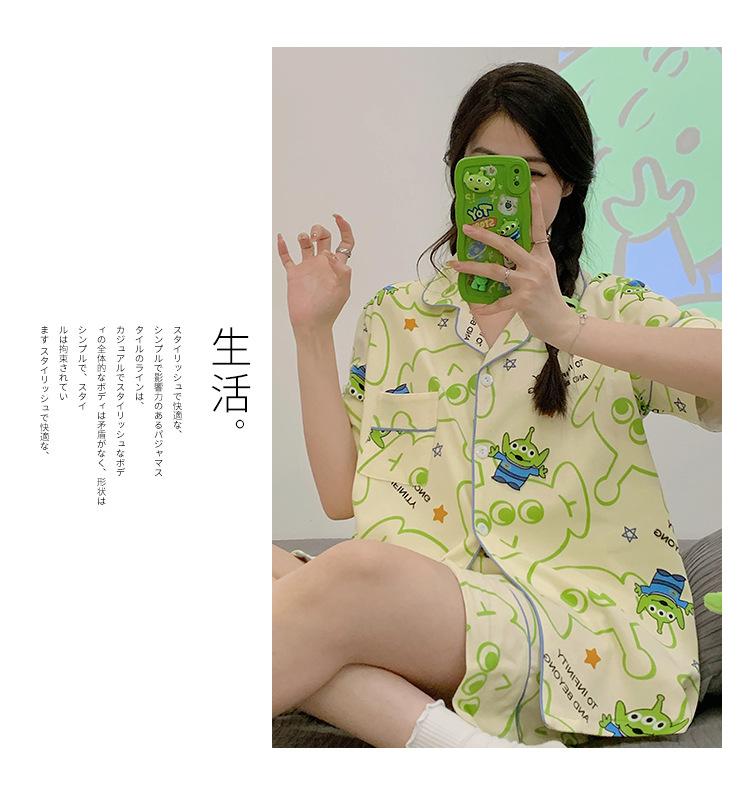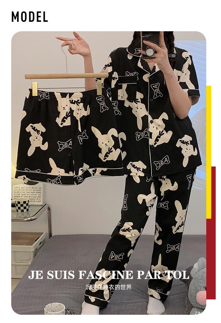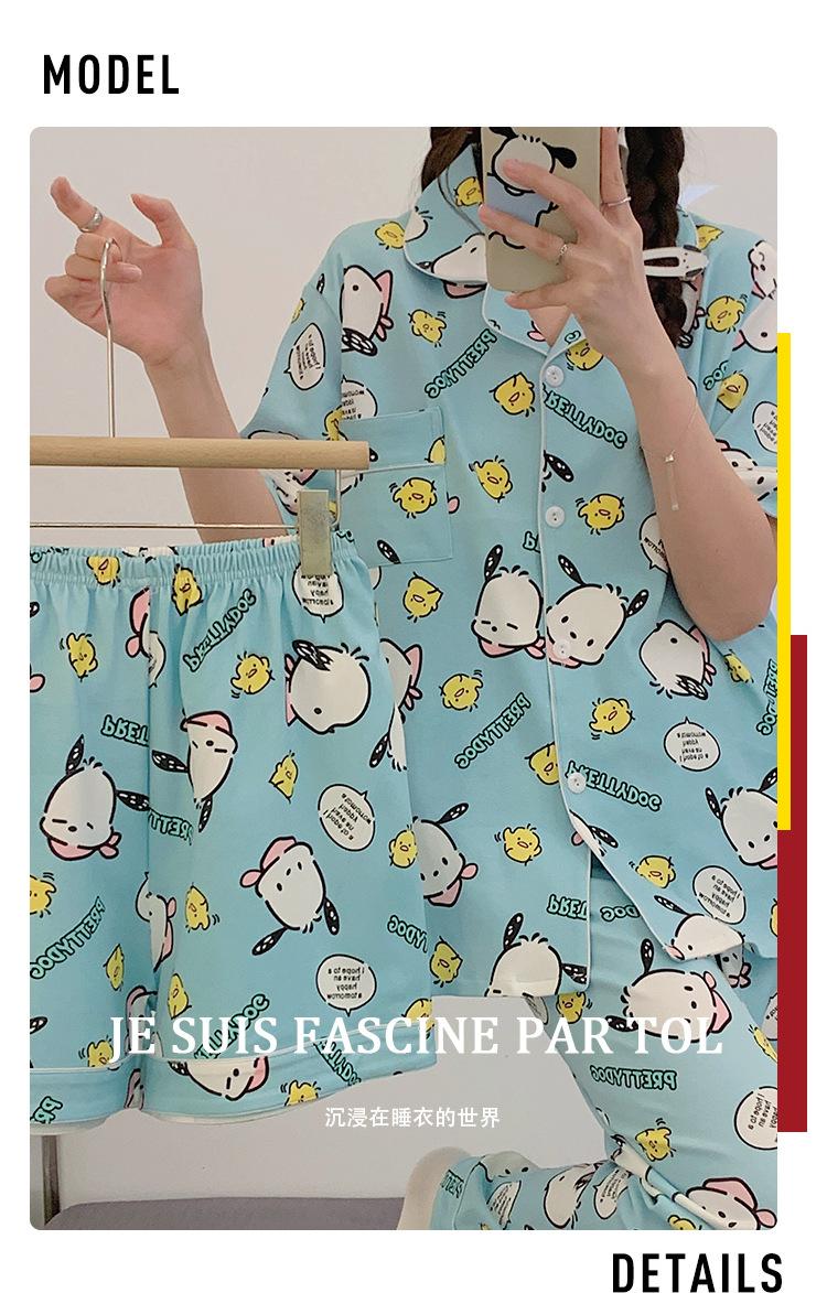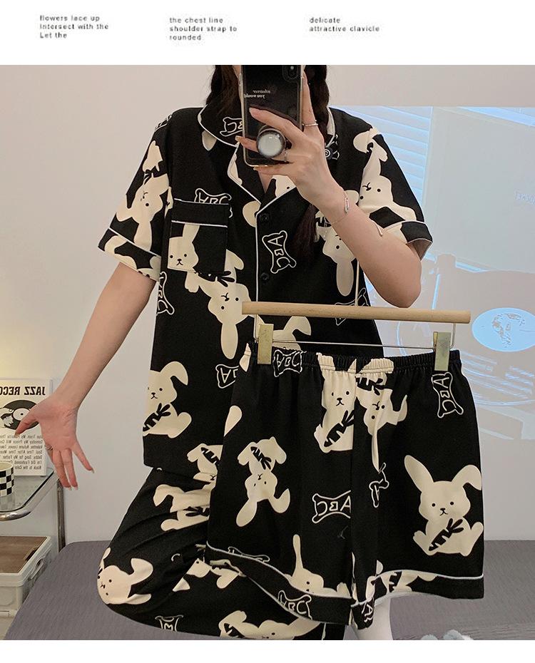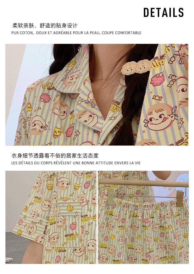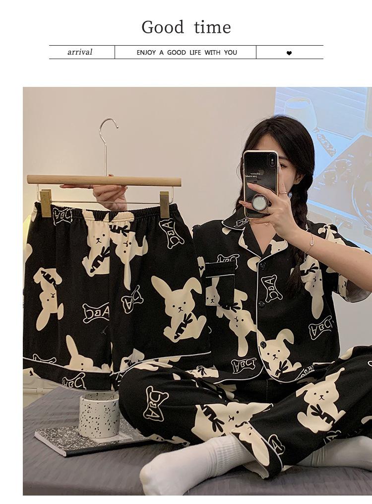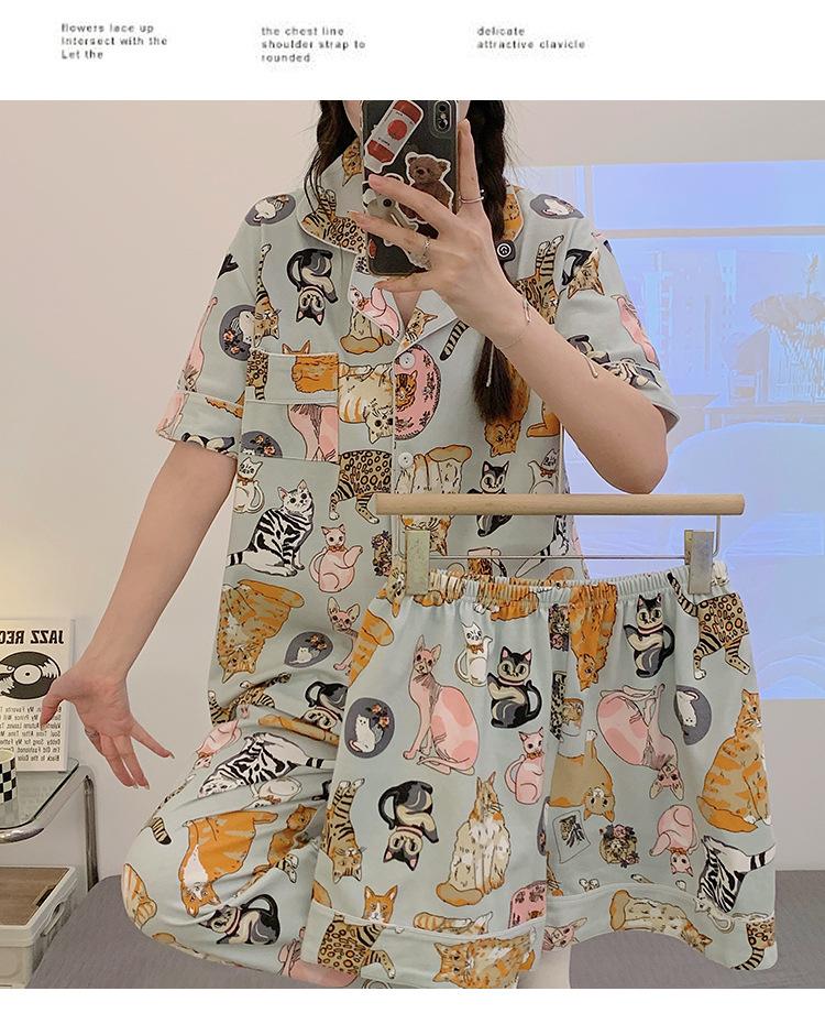 Verano Nuevo Pijama de Tres Piezas de Manga Corta para Mujer Estampado de Dibujos Animados Casual Solapa Cárdigan Ropa de Casa Dropshipping