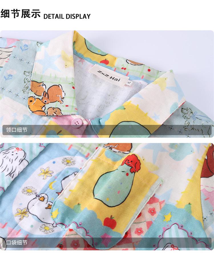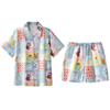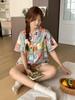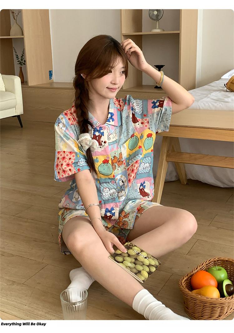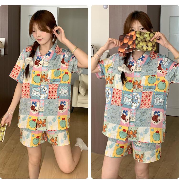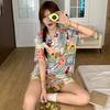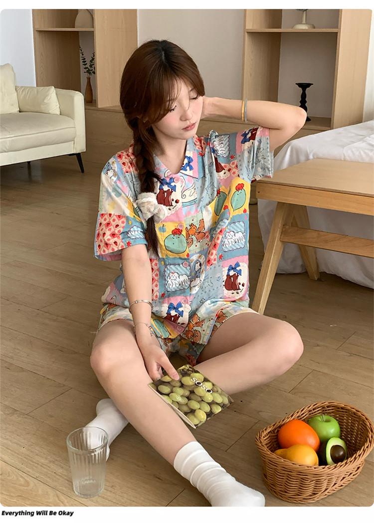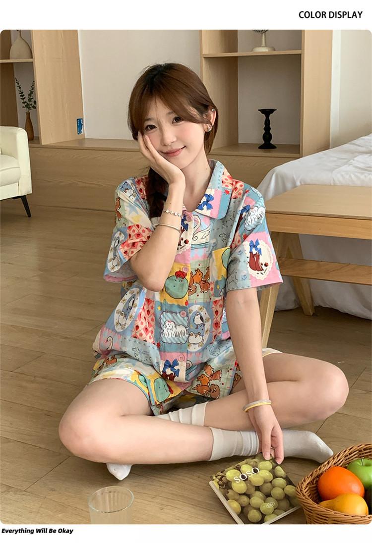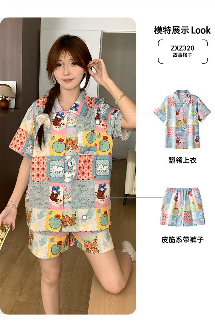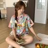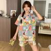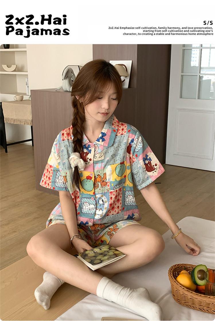 Pijama de algodón a cuadros con estampado de dibujos animados para mujer, traje de verano de manga corta, ropa de abrigo para el hogar, nuevo, pintado a mano