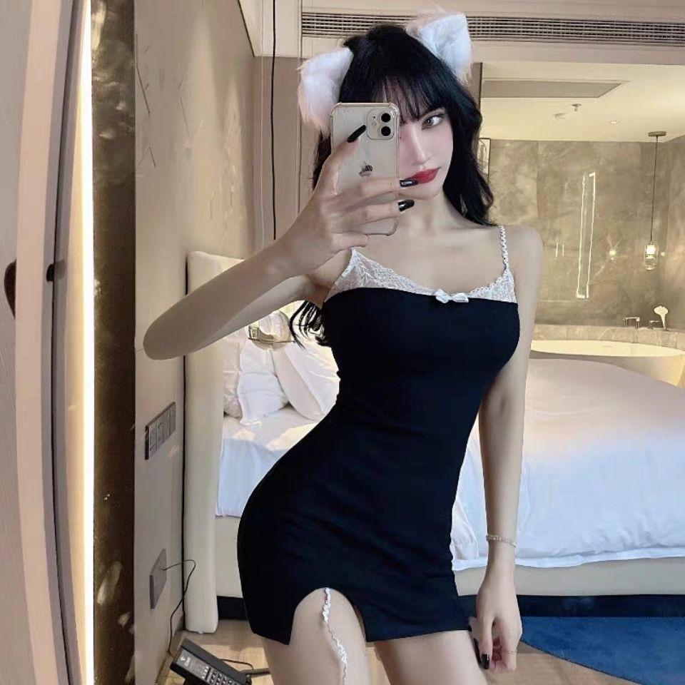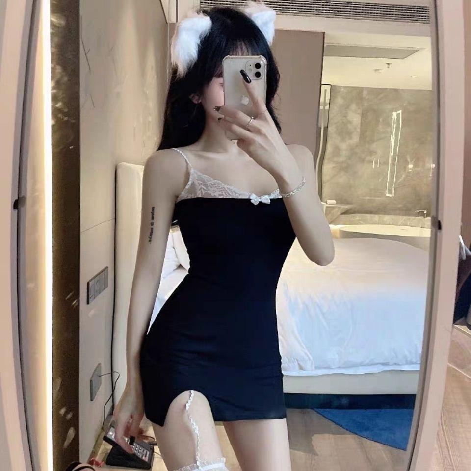 Spice Lace 2024 Nuevo Estilo Vestido de Encaje con Tirantes Verano Lazo Sexy Falda Corta Camisón Abertura