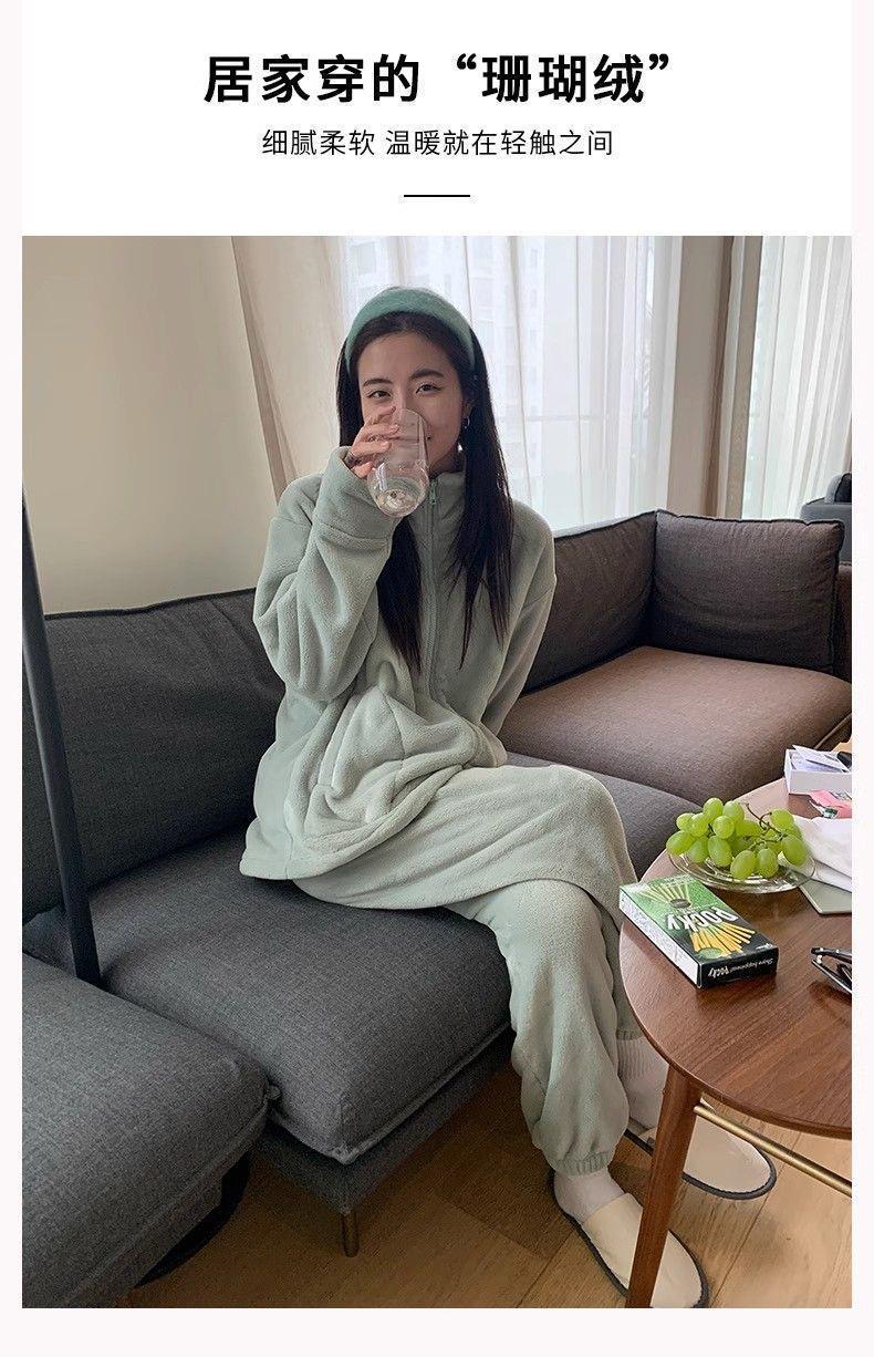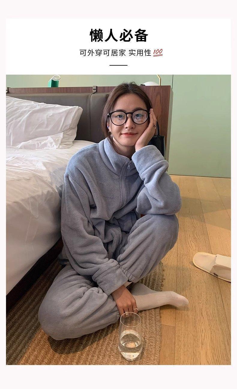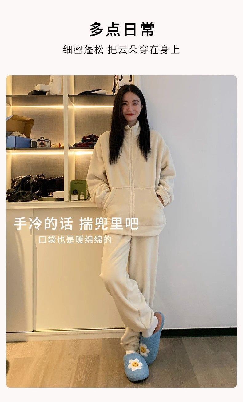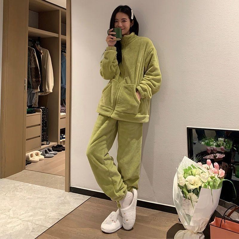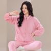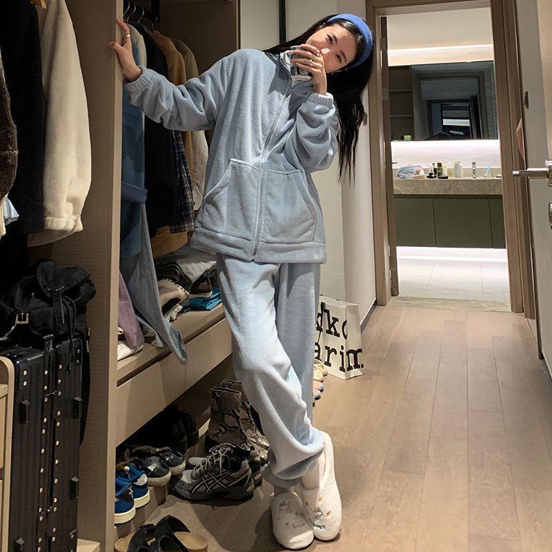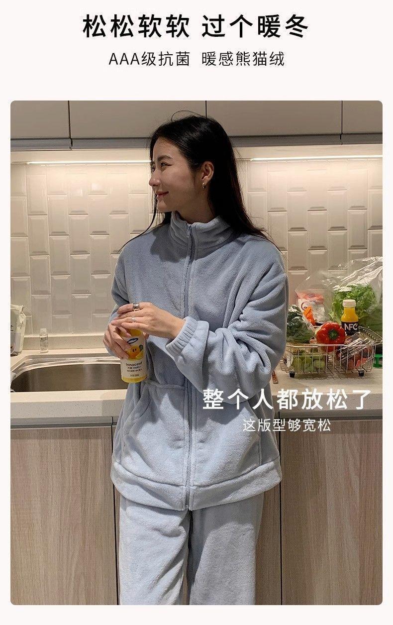 Ropa de Abrigo Pijama de Forro Polar Coral Cárdigan de Invierno para Mujer Suéter con Cremallera Traje Ropa de Casa para Pareja de Estilo Coreano Conjunto de Dos Piezas