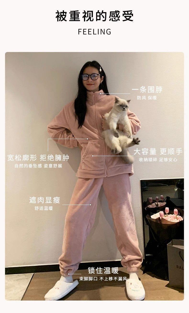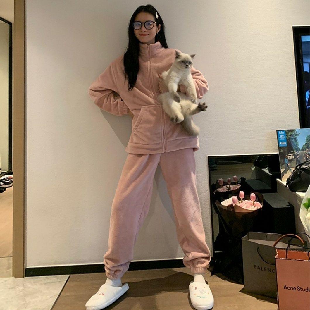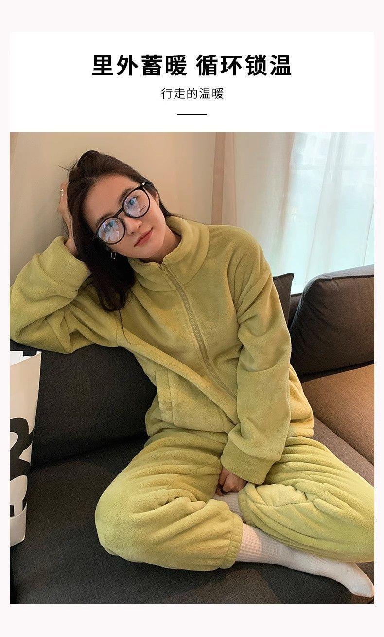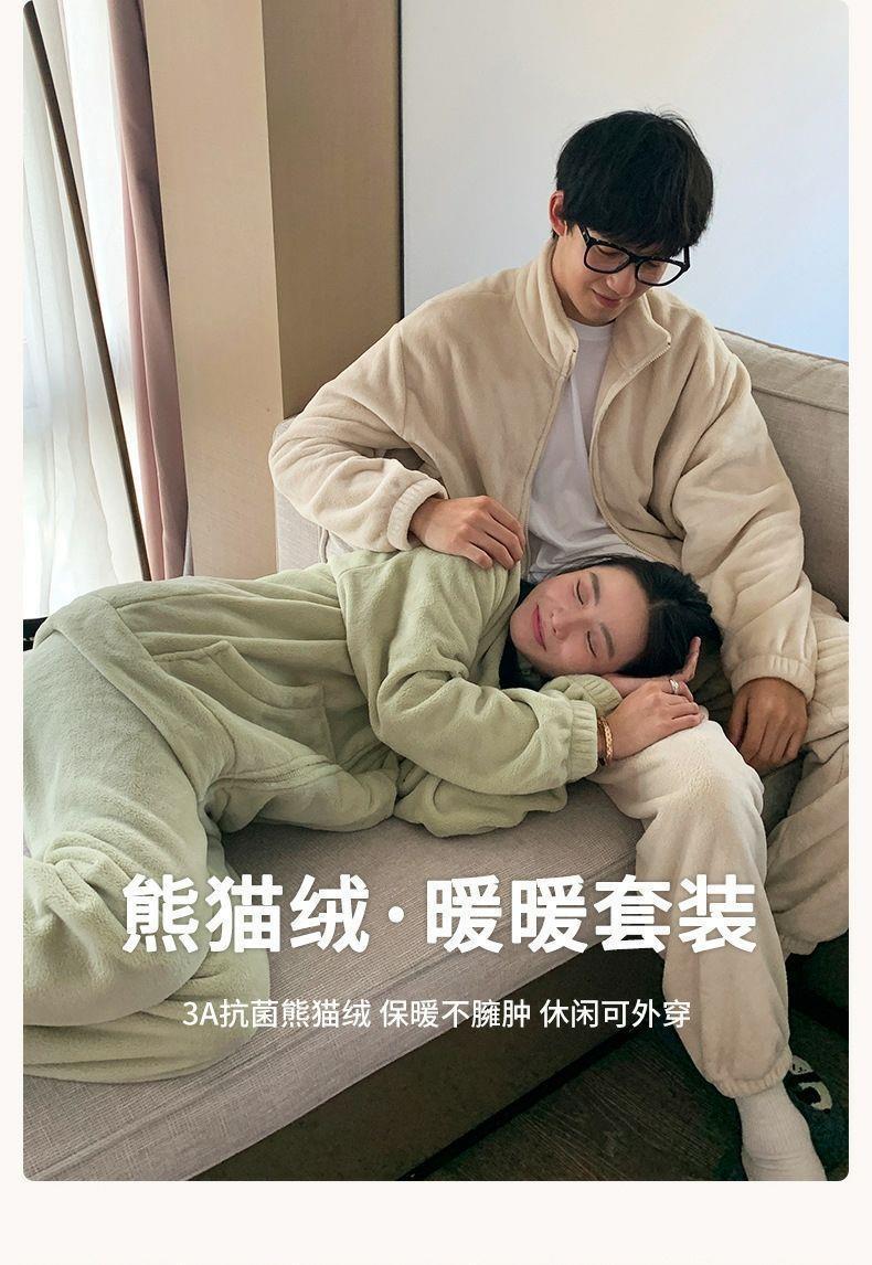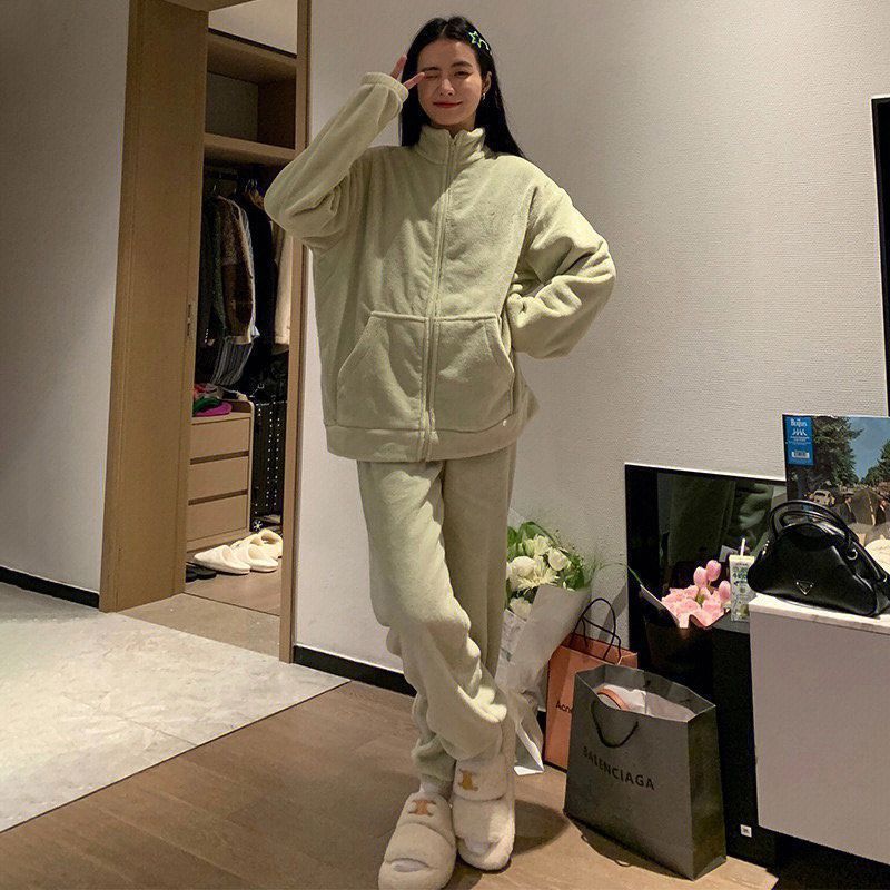 Ropa de Abrigo Pijama de Forro Polar Coral Cárdigan de Invierno para Mujer Suéter con Cremallera Traje Ropa de Casa para Pareja de Estilo Coreano Conjunto de Dos Piezas