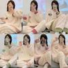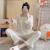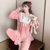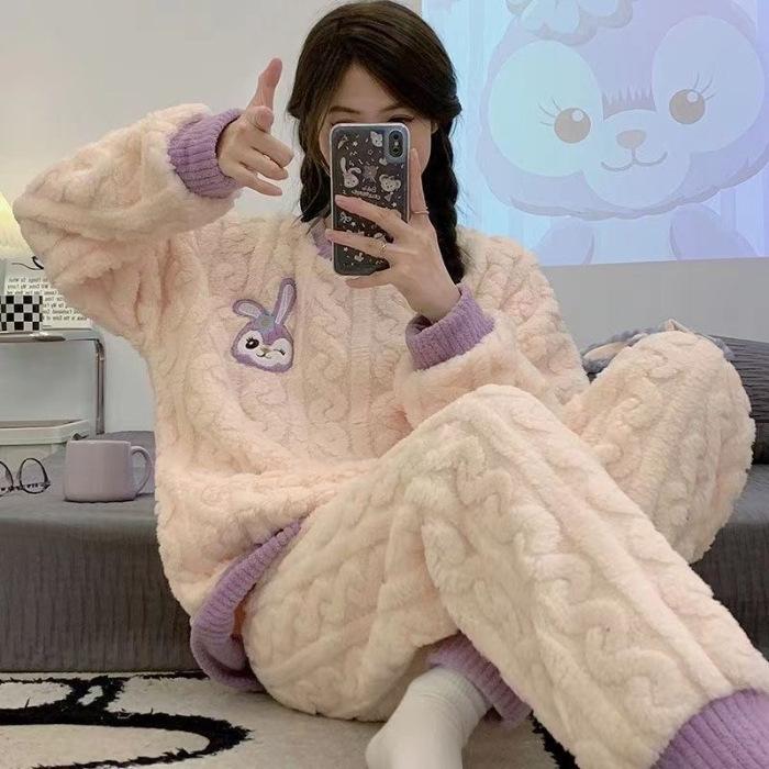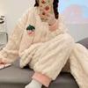 Pijama de franela de invierno para mujer, bordado, cálido, dulce, de dibujos animados, para niña, de manga larga, pantalones, traje para estar en casa, se puede usar fuera