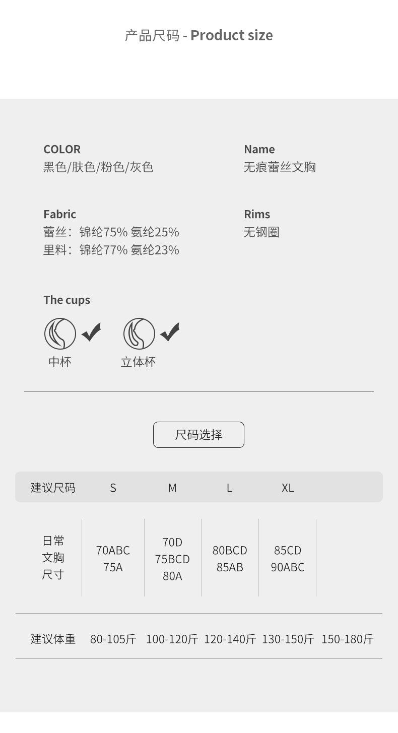S (70AA/70A/70B, below 45.00kg), M (70C/75A/75B, 45.00 kg-52.50 kg, L (75C/80A/80B, 52.50 kg-60.00 kg, XL (80C...