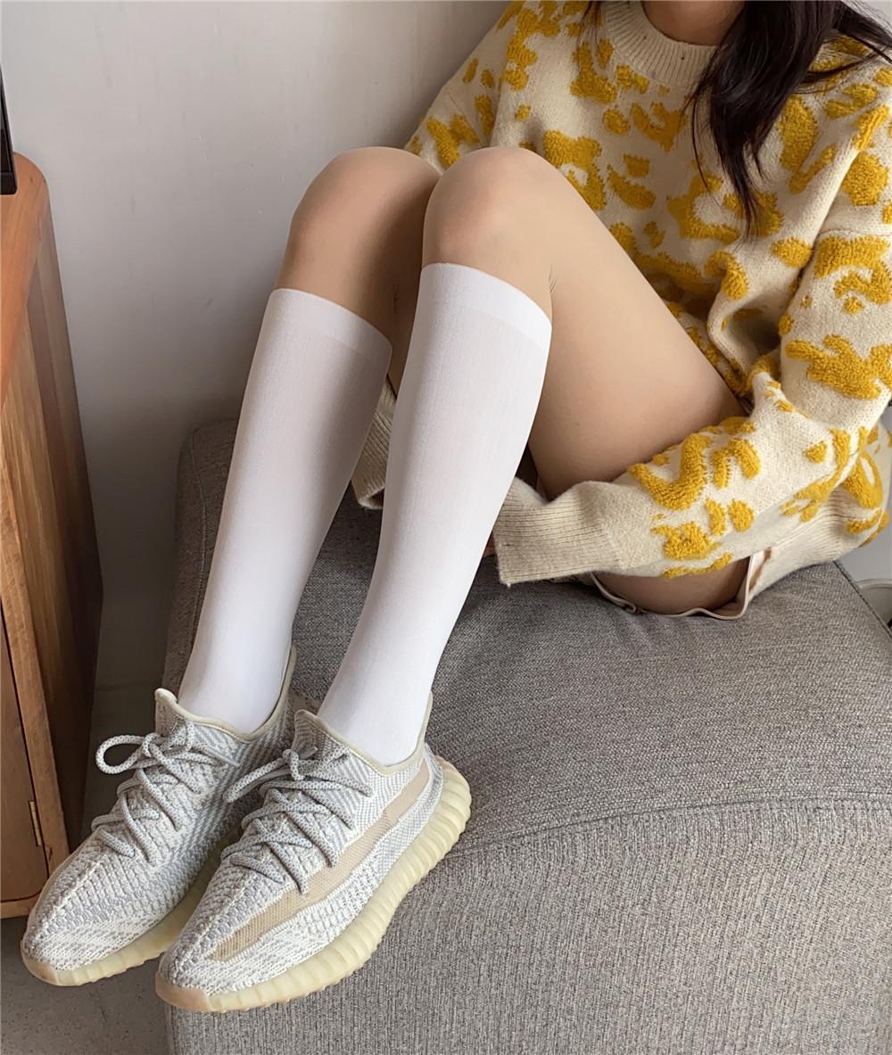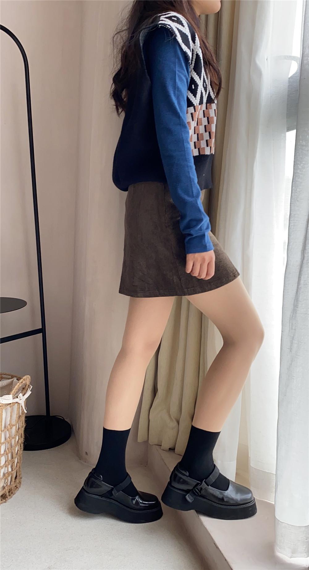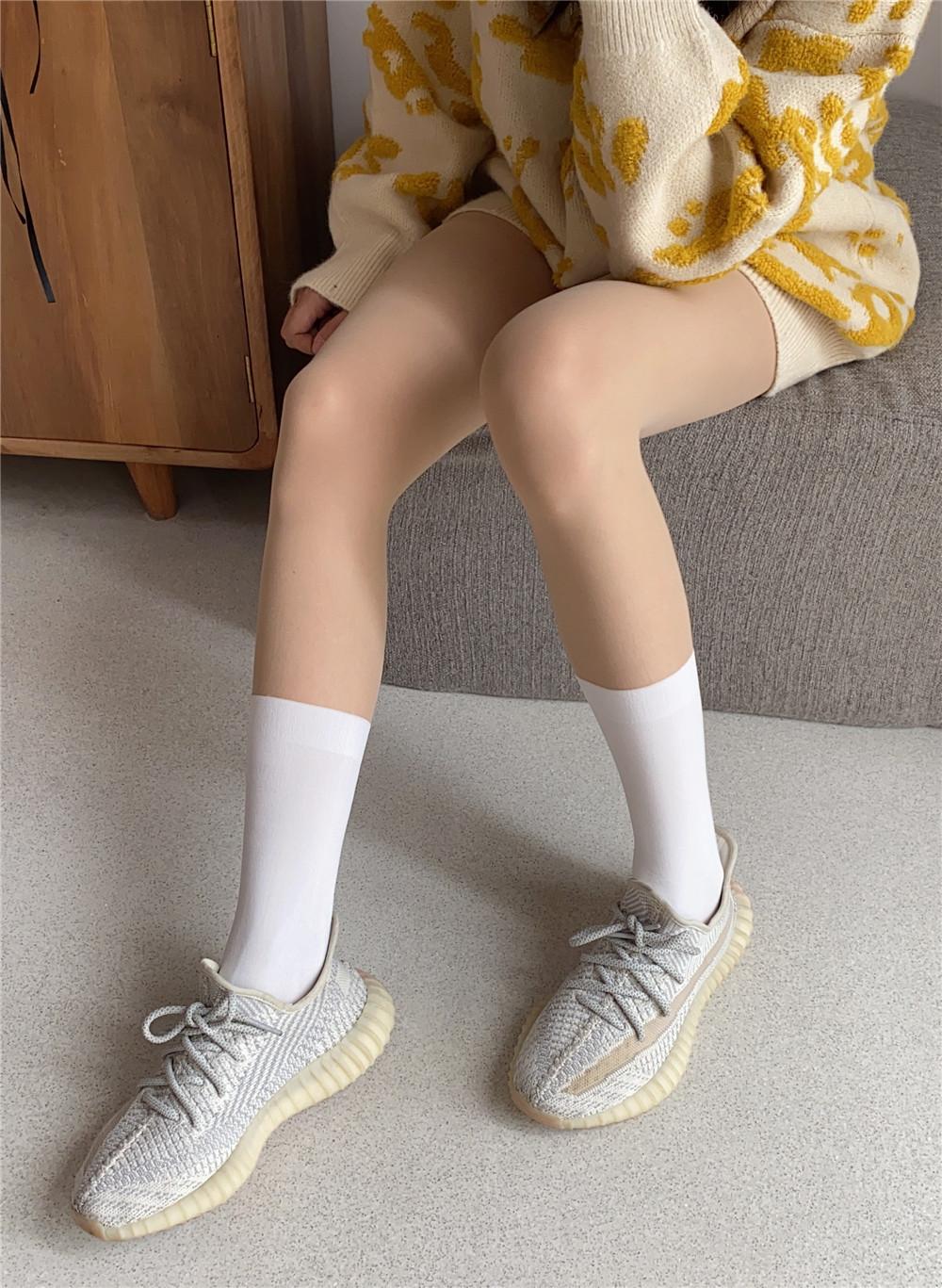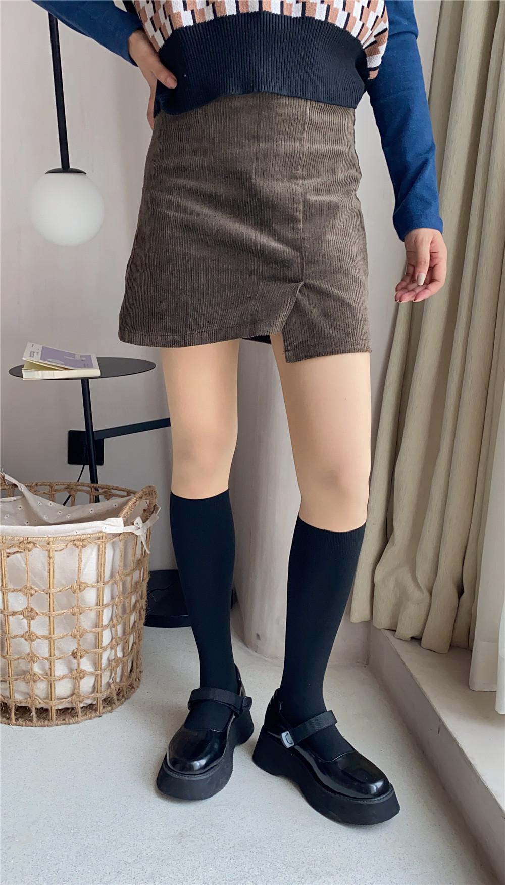 La altura de los calcetines empalmados es de unos 22 cm. Esta nueva altura de otoño-invierno es sorprendentemente versátil y su efecto en las piernas es admirable.